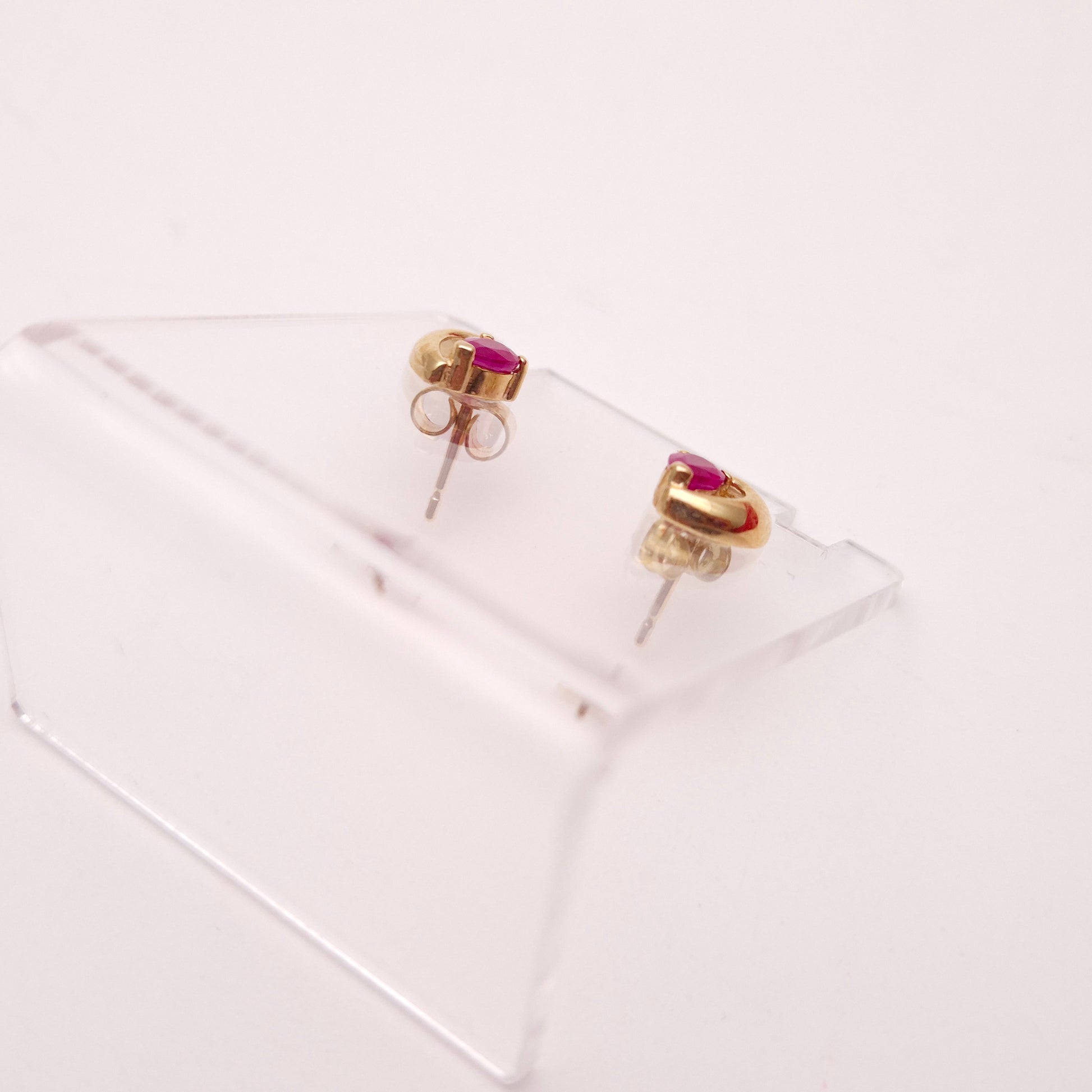 This elegant pair of stud earrings offers a rich flash of colour in a modern, stylized design. They are crafted in highly polished 9ct yellow gold, providing a warm, classic setting that complements the deep hue of the central stone.