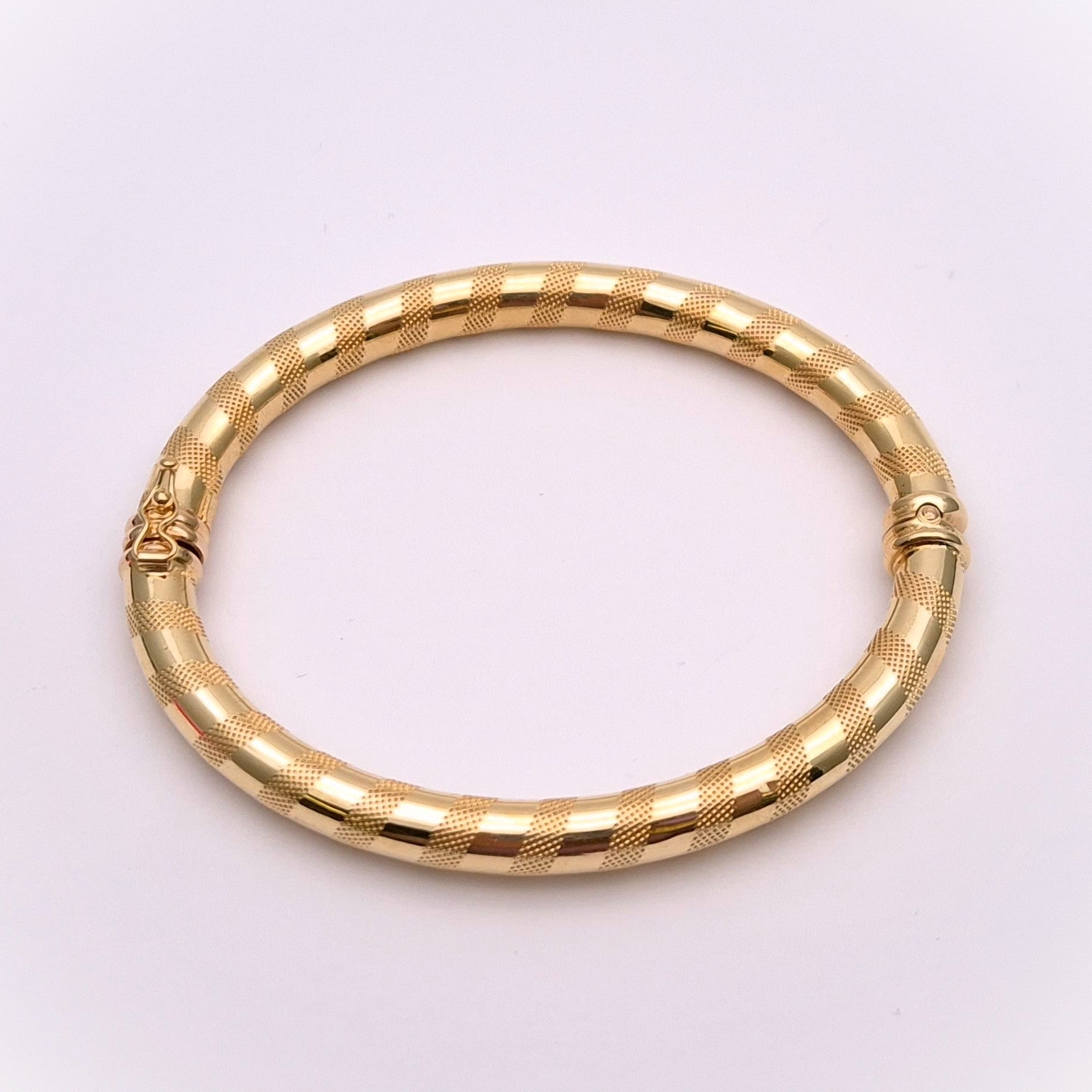 This simple but elegant bangle is made from 9ct yellow gold. It is cylindrical in profile 6mm in width and has a plain polished spiralling stripe alternating with a dimpled textured spiralling stripe. The bangle opens by a strong sprung hinge and a figure 8 clasp to secure the closure.