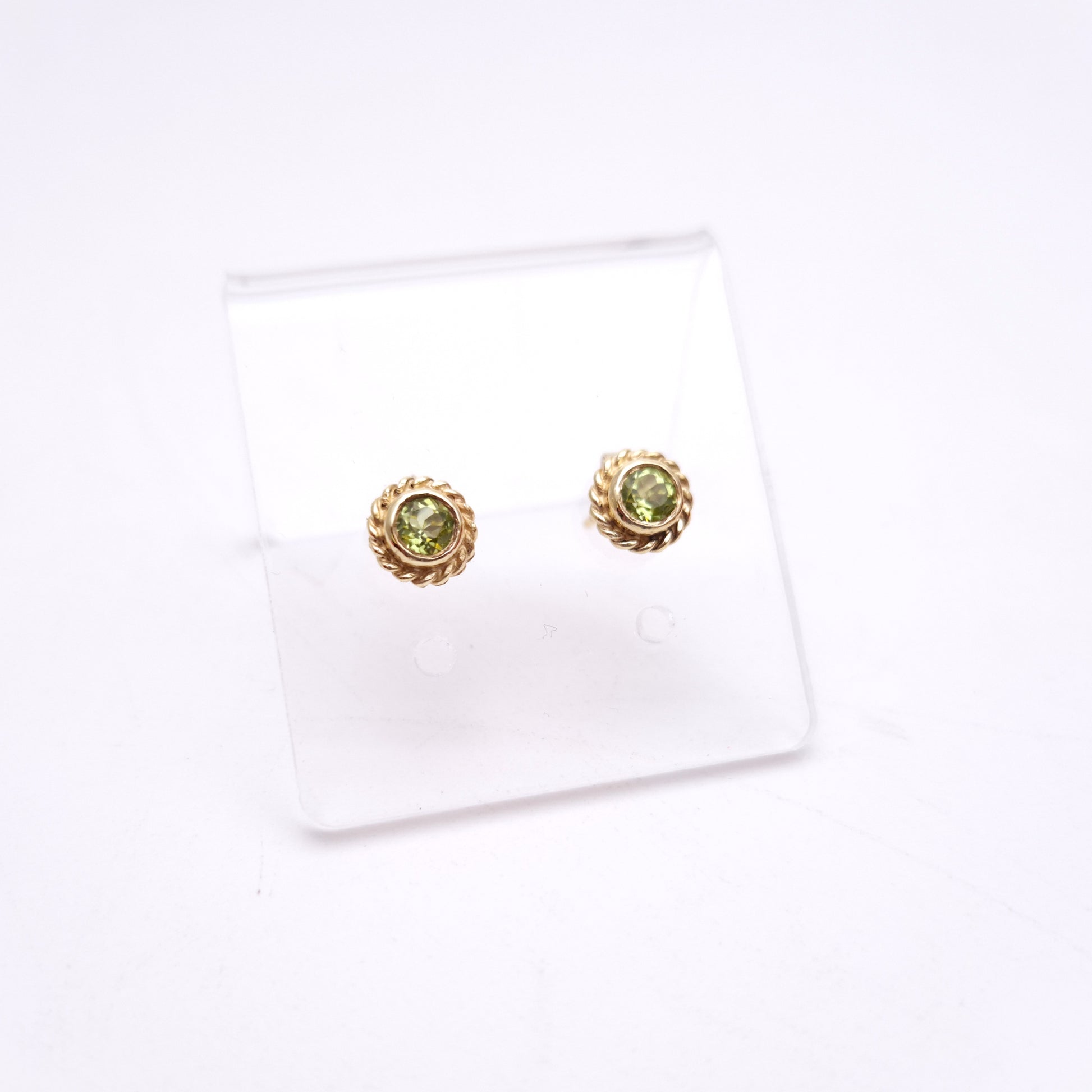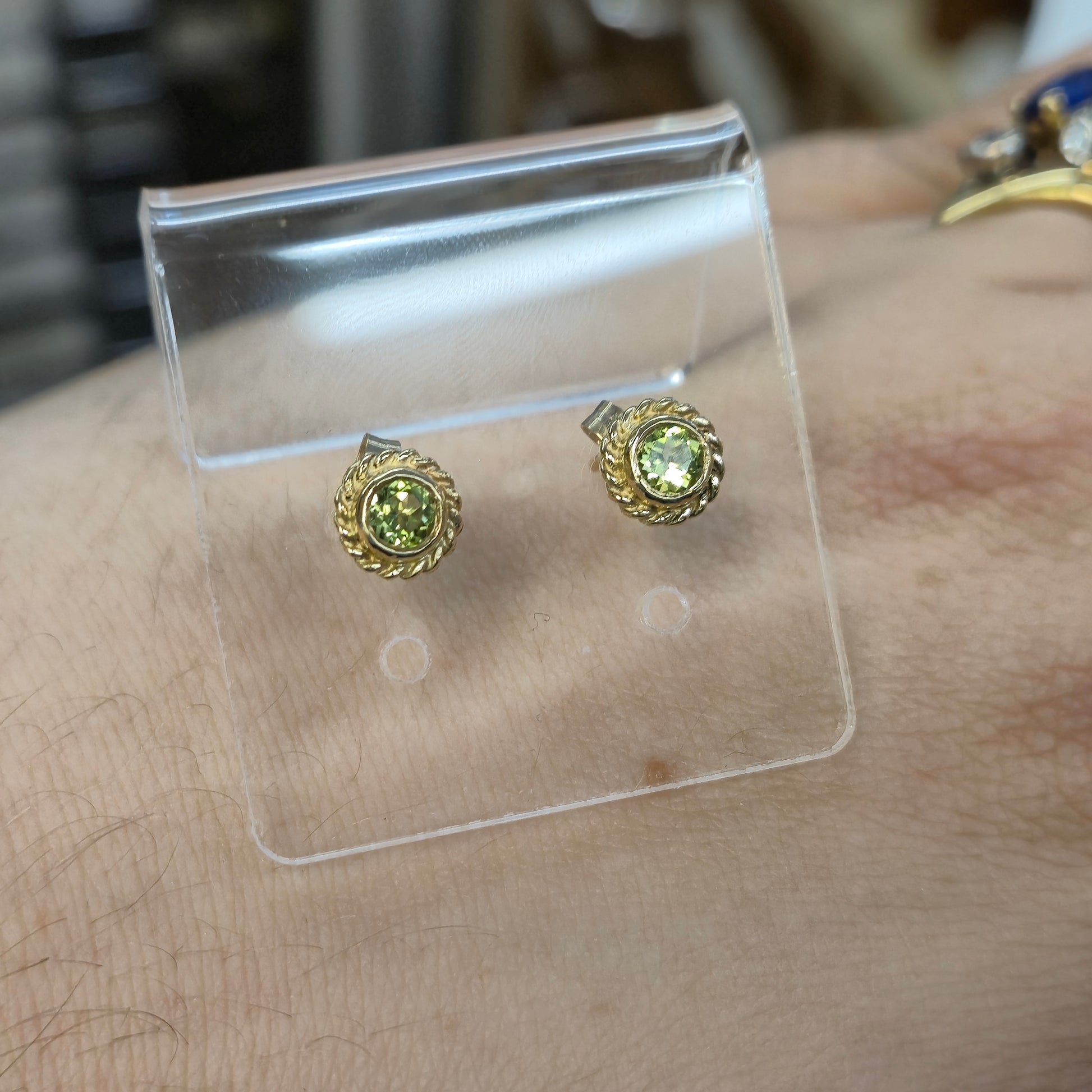 The focal point of each earring is a single, round-cut peridot, with a beautiful apple-green hue that brings a lively touch of colour. Each peridot is secured within a gold setting that is further enhanced by a detailed braided or twisted rope border, adding a touch of classic craftsmanship and texture. This intricate detail frames the gemstone beautifully and gives the earrings a vintage-inspired charm.