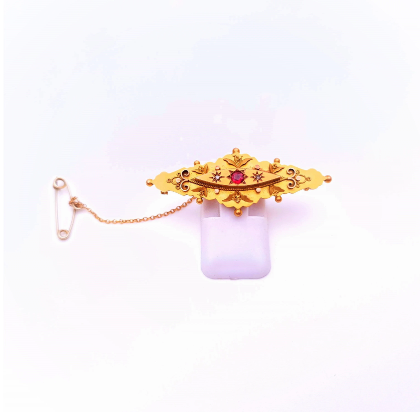 A wonderful piece of jewellery in excellent condition made from 9ct yellow gold in a traditonal victorian/ edwardian style with fancy patterning to the top with a central panel featuring a round cut red stone of ruby and two small diamonds set to each side. on the rear is a small panel that could be used to turn the piece into a mourning jewellery piece and could hold hair or a small photos. the brooch is hallmarked to the rear for 9ct gold assayed in chester 1914.
