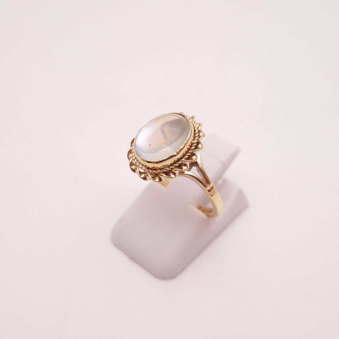 This beautiful ring is a classic piece that showcases the delicate, ethereal beauty of its central gemstone. Crafted in warm 9ct yellow gold, the ring features a substantial, oval or round cabochon of Moonstone. The stone displays the signature soft, internal glow or adularescence that appears to float just beneath its surface, giving it a subtle, milky luminescence.