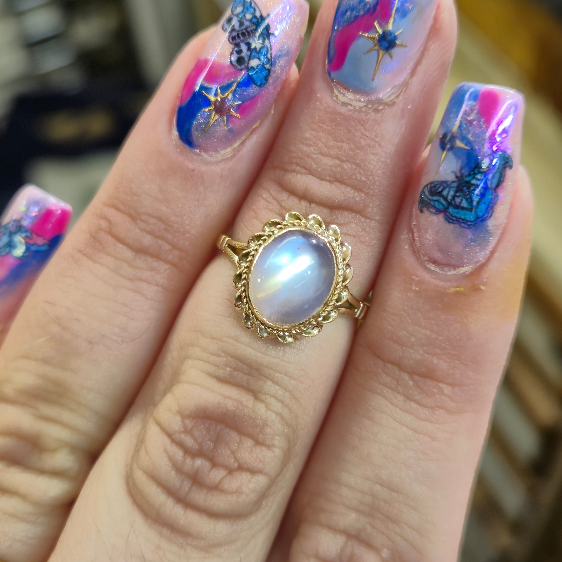 Moonstone is often associated with femininity, intuition, and calm. This elegant ring is a perfect statement piece for lovers of natural gemstones, vintage design, or anyone who appreciates subtle beauty.