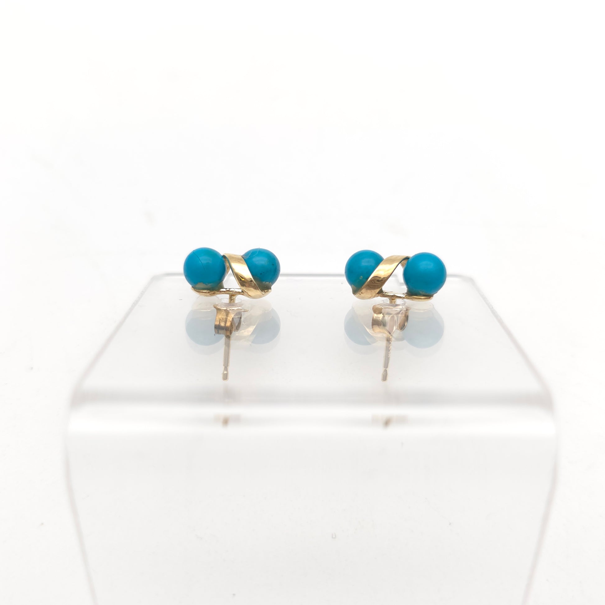 The design of these earrings is modern and unique, featuring Two Round Turquoise Beads set closely together. The beads are secured next to a sleek band of 9ct Yellow Gold that spirals between them, giving the appearance of a continuous design and adding an interesting, dimensional element. The Turquoise gemstones themselves display a beautiful, saturated robin's egg blue hue, which offers a striking contrast against the warm gold.