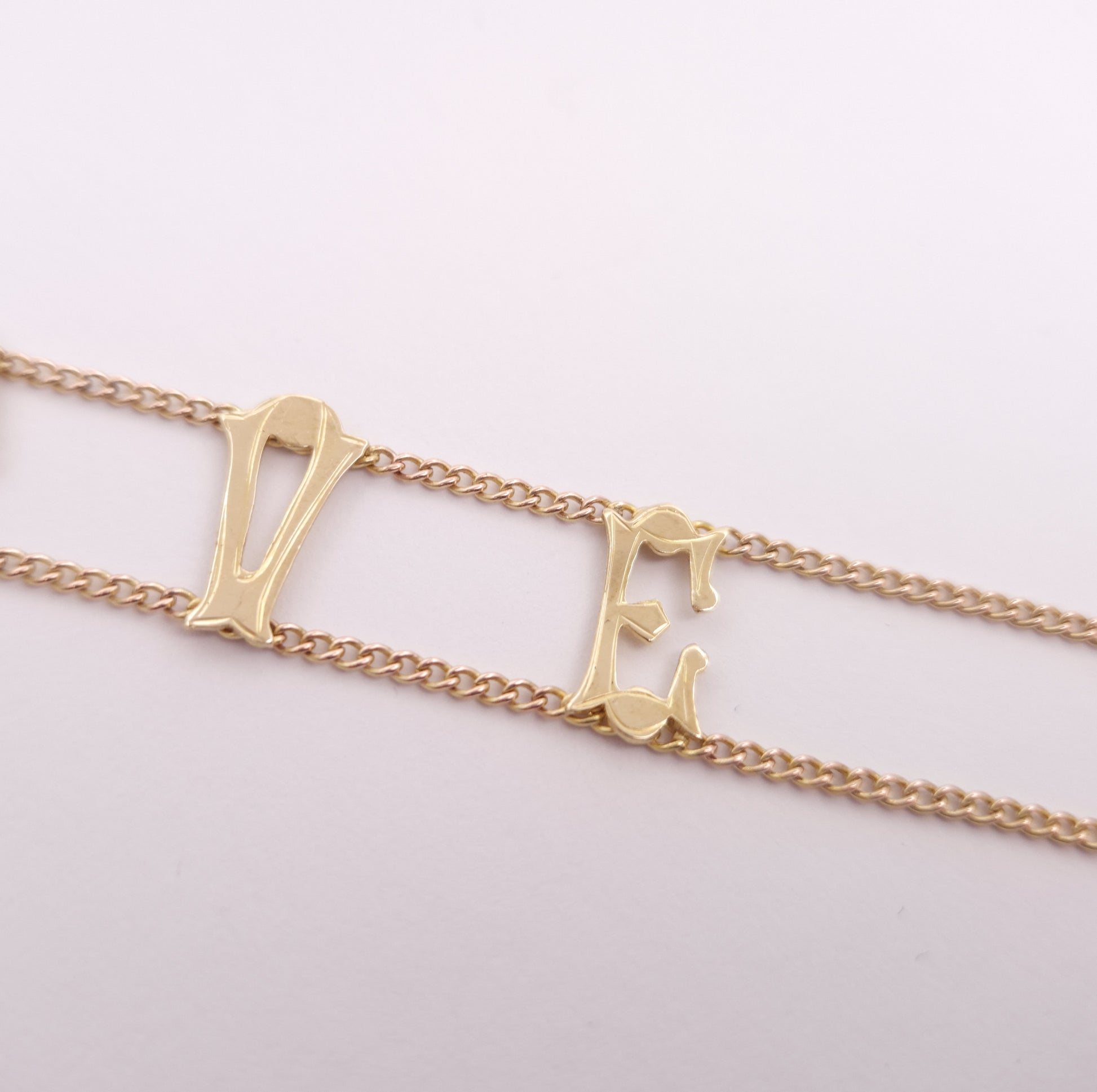Capture the romance of the swinging sixties with this delightful vintage bracelet, lovingly crafted in warm 9ct yellow gold. This unique piece spells out the timeless message 'I Love You' in individual, charmingly designed letter charms, linked together by delicate gold chains.