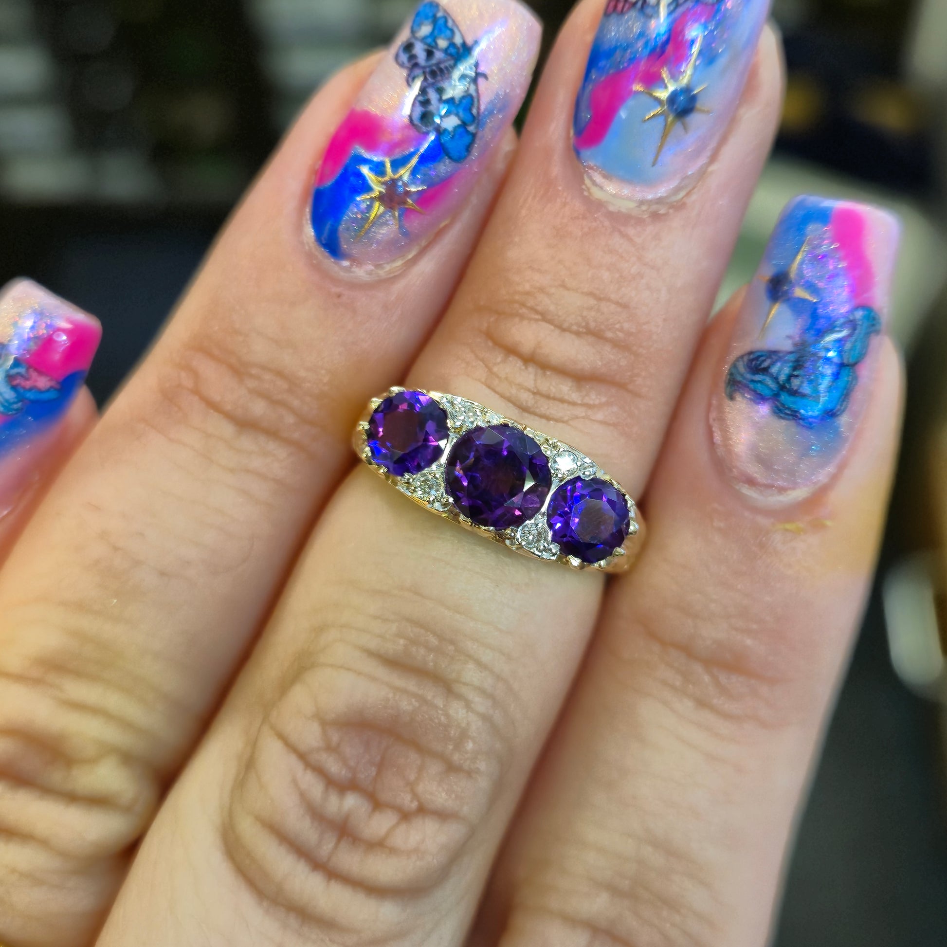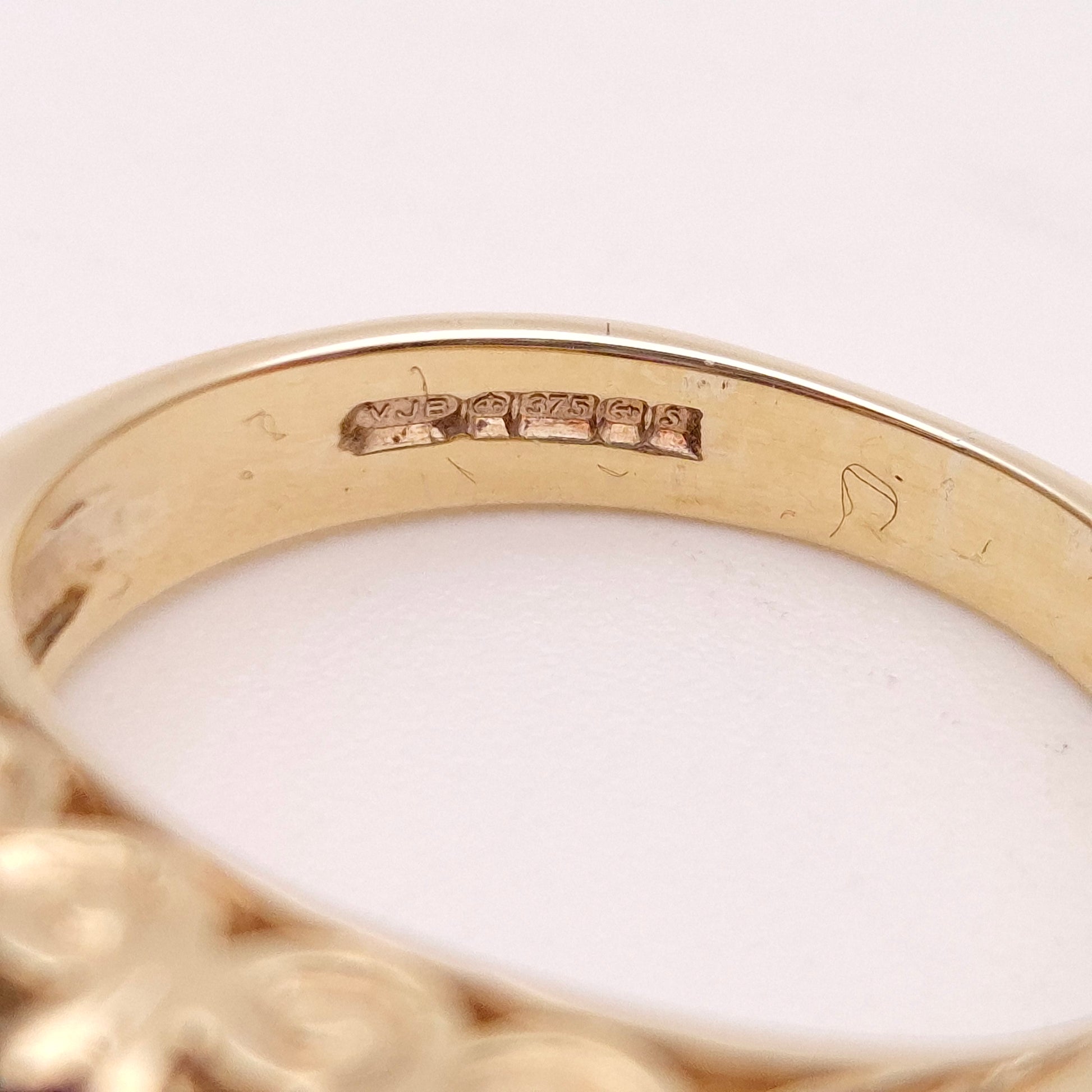 The ring's bold presence is amplified by the wide, sculpted shoulders and bridge of the band, which are beautifully decorated with ornate scrolling or foliate engraving. This intricate detailing is highly characteristic of fine vintage or antique jewellery, particularly the "Boat Ring" style, where the gemstone setting slightly tapers to meet the band. This piece is perfect for those who appreciate chunky, vibrant, and unique vintage jewellery, making it an excellent statement ring or a memorable gift for a February birthday