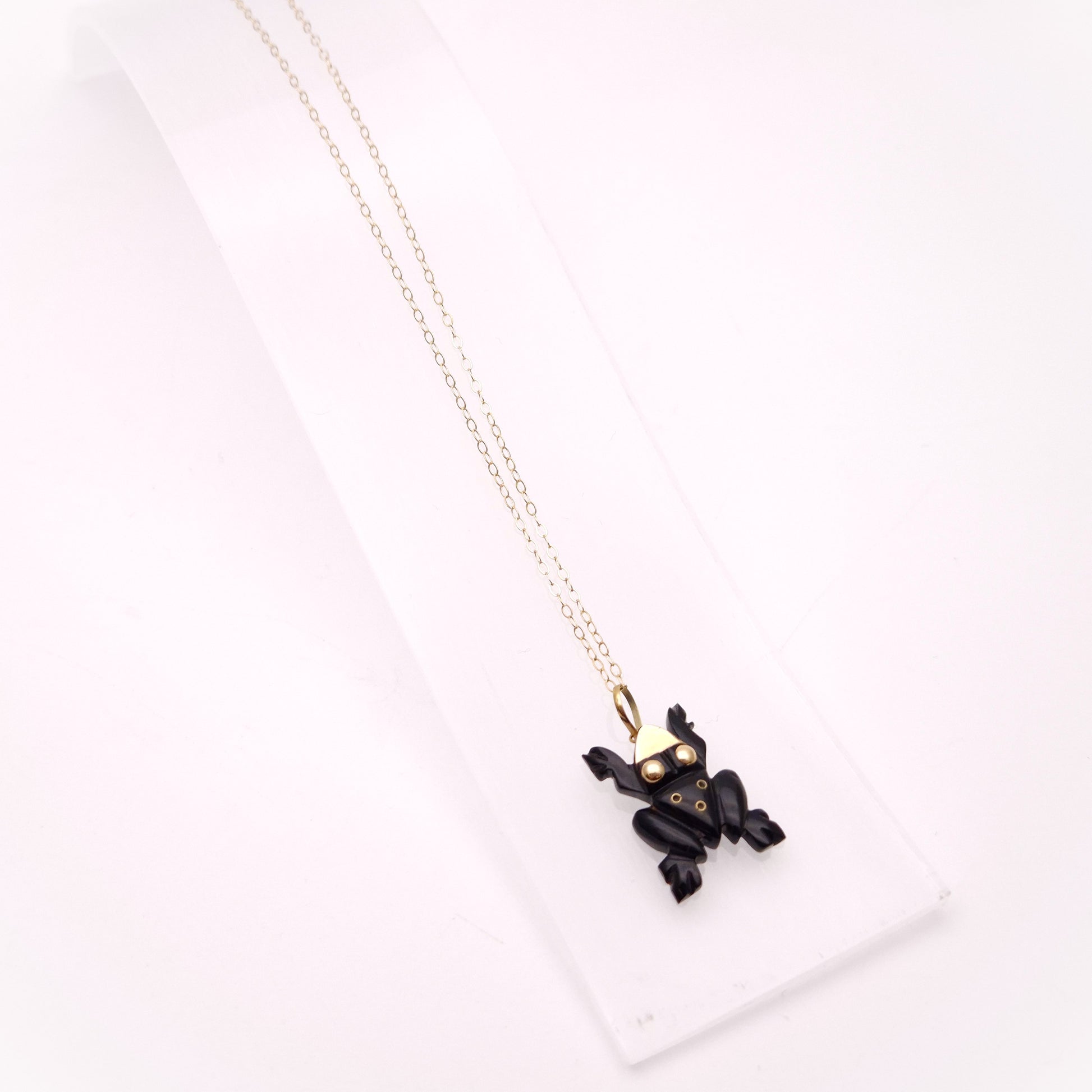 The frog is accented with details crafted in warm 9ct yellow gold. This includes the bail, the small round gold eyes, and a triangular gold piece forming the top of the frog's head. The contrast between the smooth, deep black of the frog and the highly polished gold detailing is striking. The frog pendant hangs gracefully from a fine, delicate yellow gold chain, making the piece ready to wear immediately.