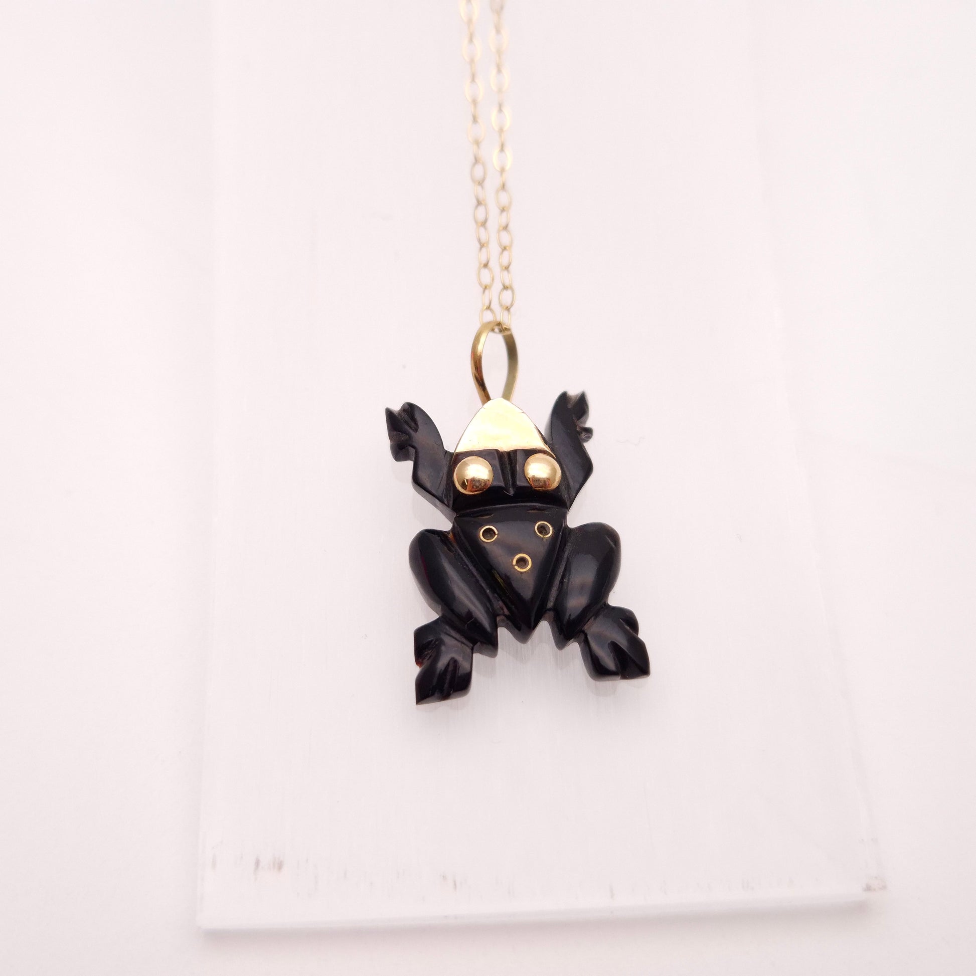 9ct Yellow Gold Vintage / Antique Carved Jet Frog Pendant and Chain Necklace