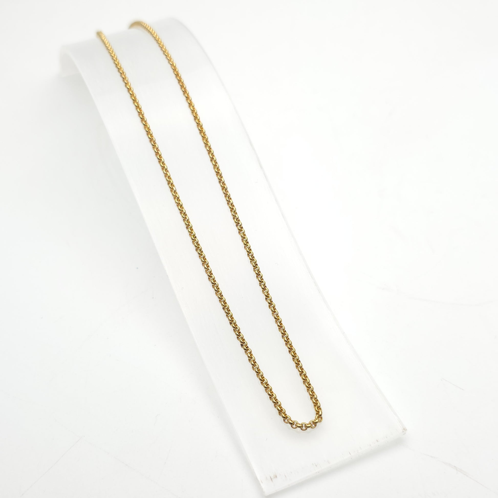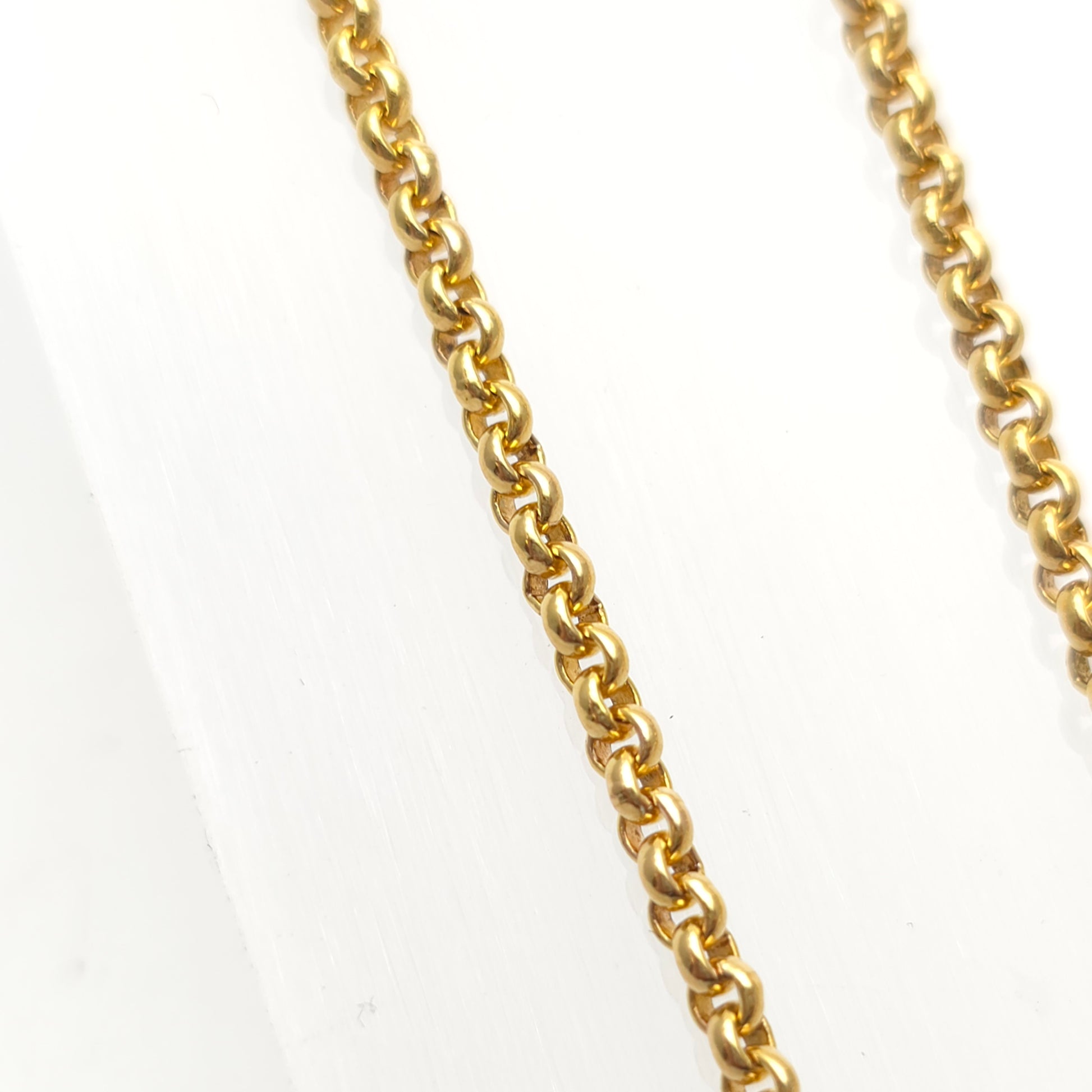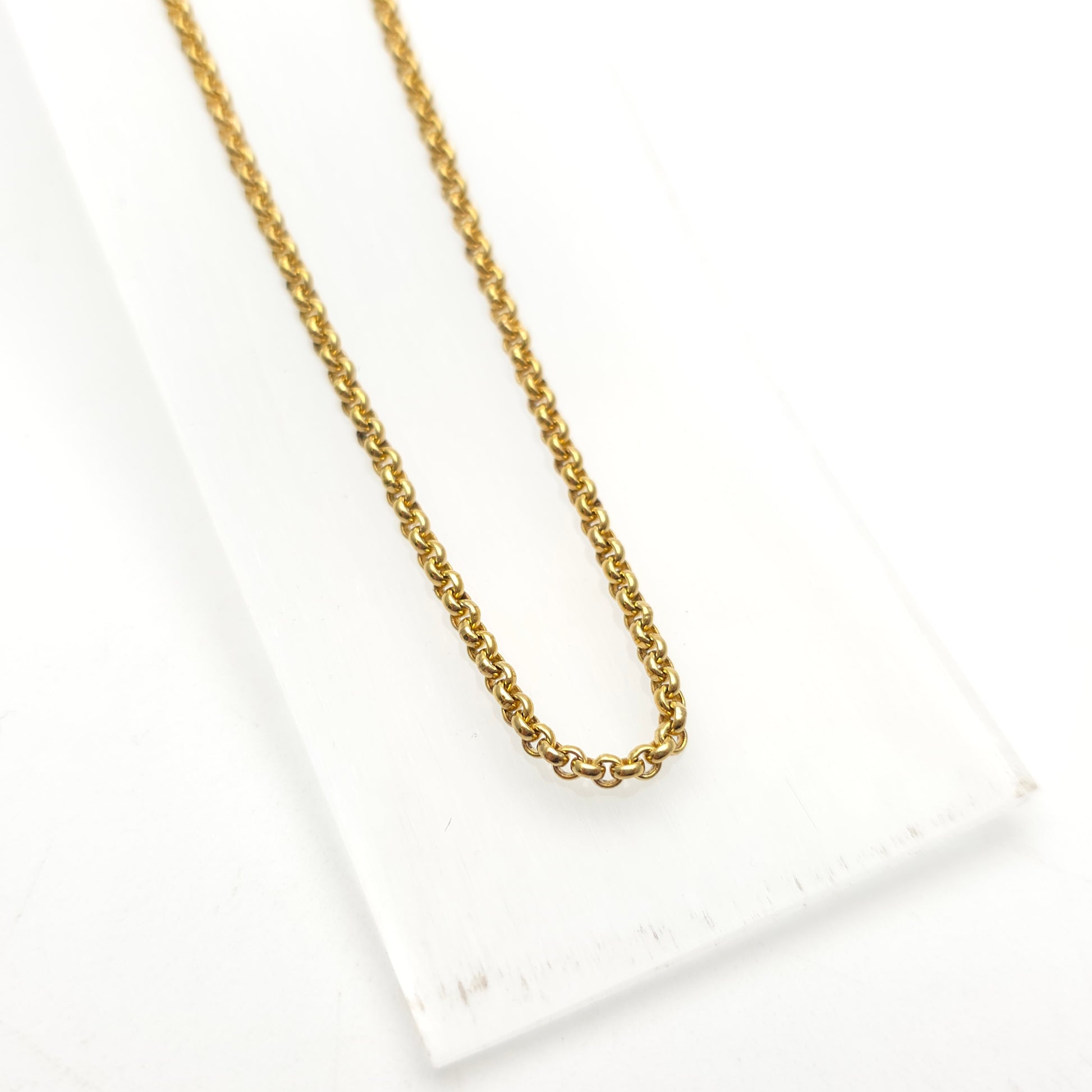 The gold has a rich, warm lustre and a polished finish that catches the light with a soft, golden glow. At 22 inches in length, this chain sits comfortably on the neck, making it an ideal choice for a variety of necklines. Its sturdy construction makes it perfectly suited for supporting heavier antique pendants, lockets, or fobs, yet its refined link structure allows it to be worn elegantly as a standalone piece.
