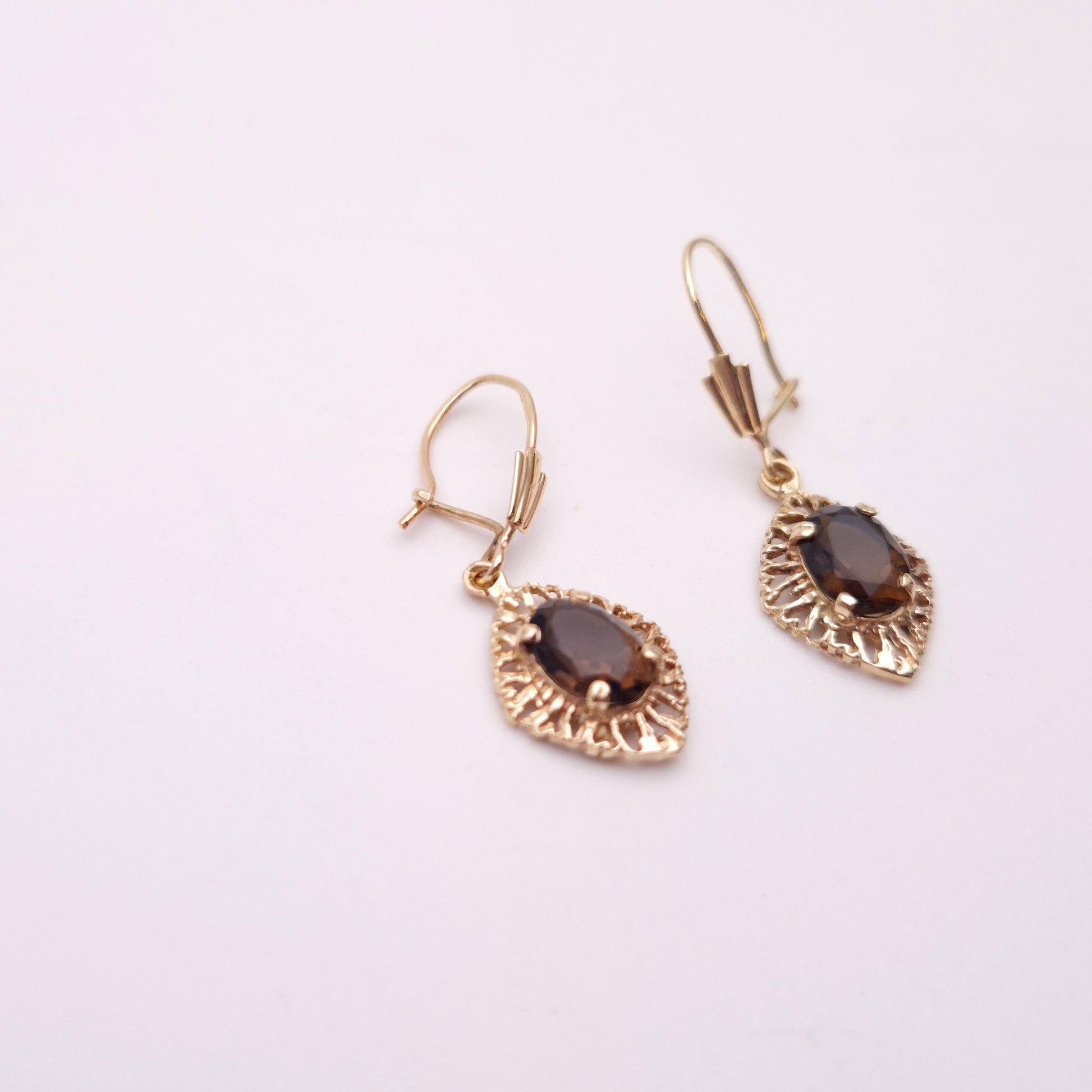 The setting and hooks are constructed from durable 9-carat yellow gold. The earrings feature traditional shepherd's crook, which ensure a secure and elegant drop from the ear. The overall effect is feminine and classic, with the openwork design allowing light to interact beautifully with the metal and the smoky quartz. This item is an excellent choice for those who love vintage jewellery, appreciate delicate craftsmanship, and desire an elegant pair of drop earrings that offer a unique, warm colour palette suitable for both day and evening wear.