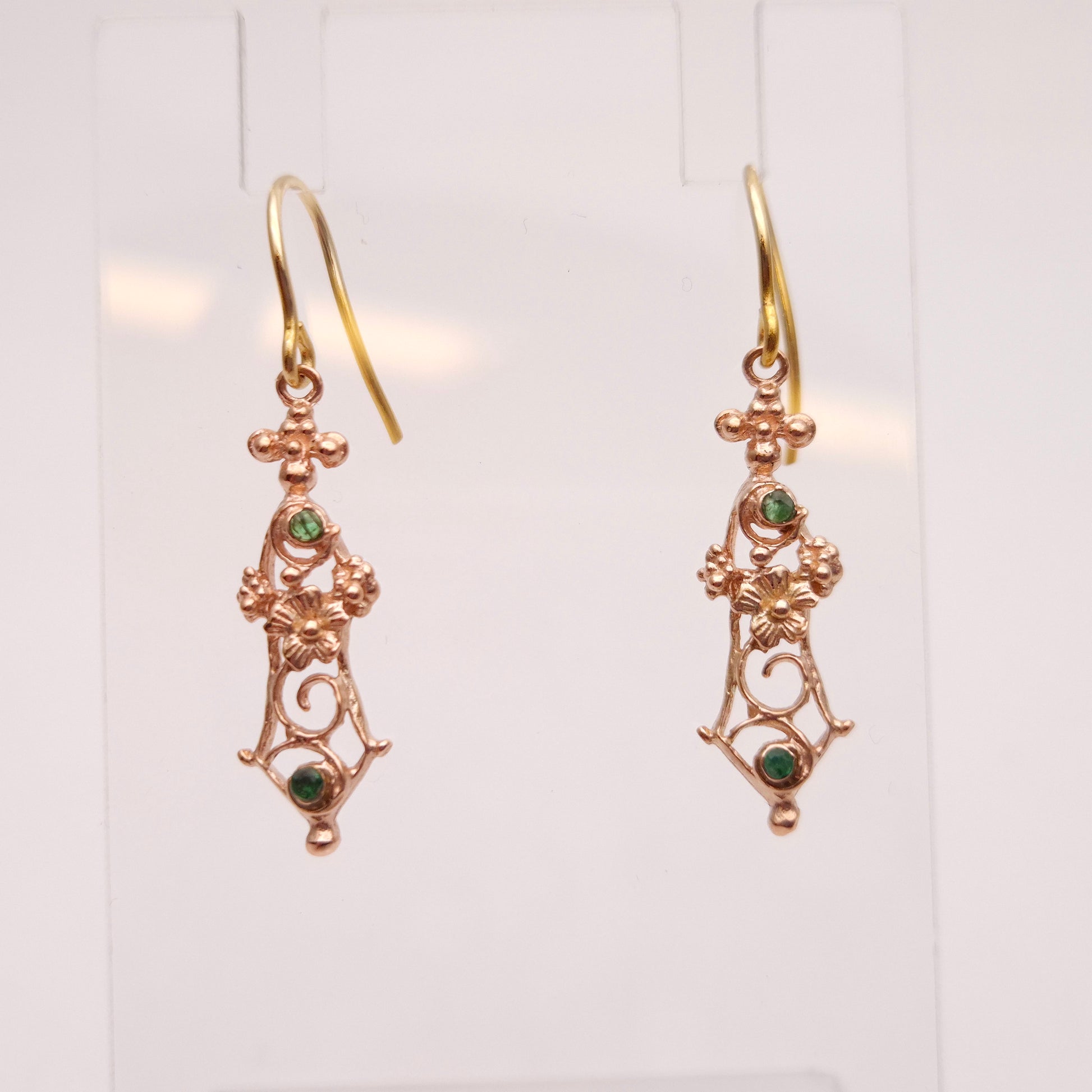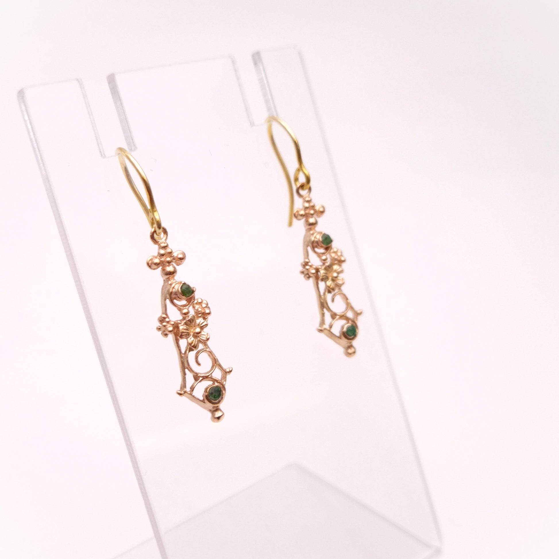 9ct Yellow gold Vintage Emerald Floral Cut out Drop Earrings