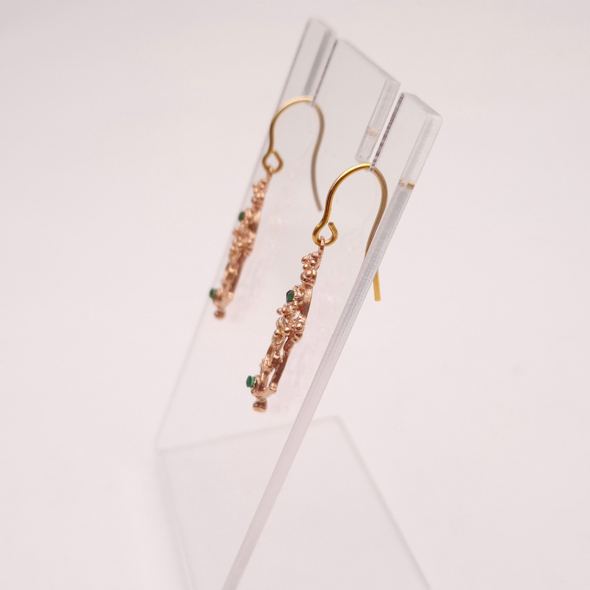 The design is intricate and airy, featuring an Edwardian-inspired or Art Nouveau-inspired openwork pattern. Each earring showcases a fine floral and scrollwork cut-out motif, creating a graceful, elongated drop. Adding a sophisticated pop of colour are small, round-cut green emeralds nestled within the floral design and at the base of the drop. These stones add a subtle, refined sparkle and contrast beautifully with the warm gold.