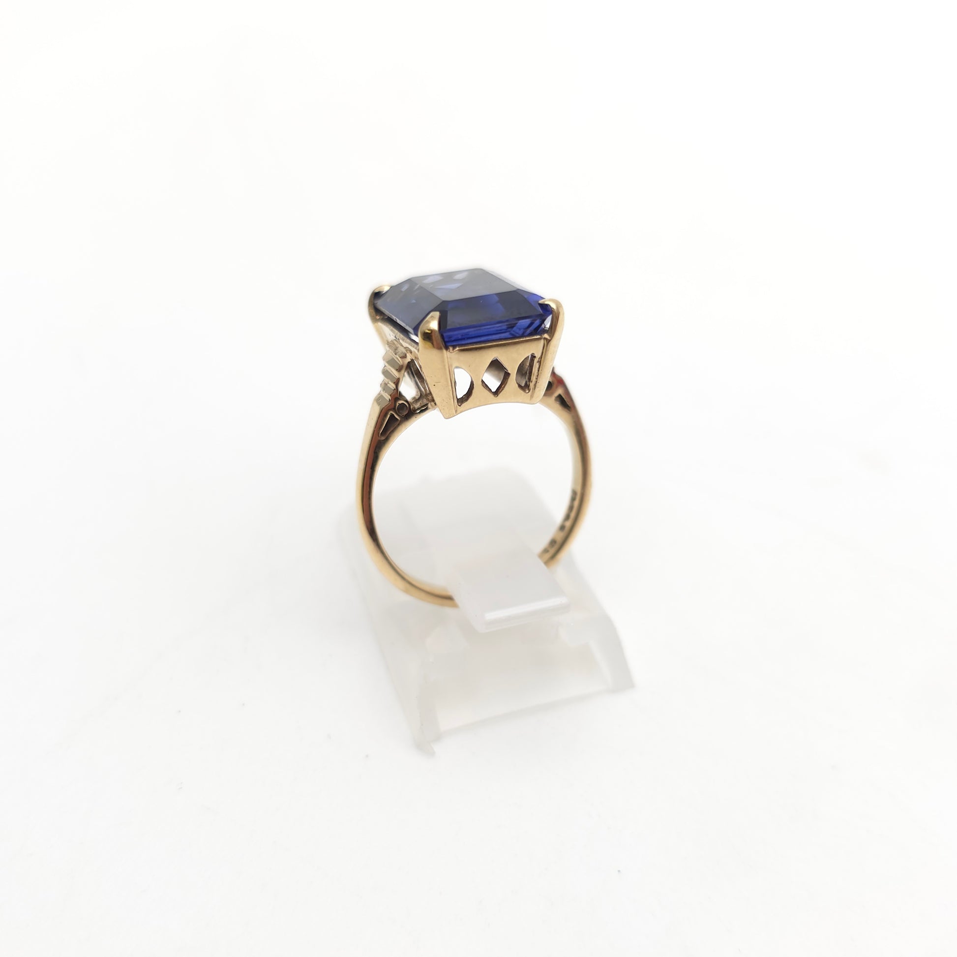 The vibrant blue stone is securely held in a classic four-prong setting, elevated slightly to allow maximum light to pass through the pavilion. The mounting is crafted in solid 9ct yellow gold, providing a rich, warm contrast to the cool tones of the blue centrepiece. The shoulders of the ring feature subtle, elegant detailing that leads into a smooth, polished band, ensuring a comfortable fit despite the ring’s substantial presence.