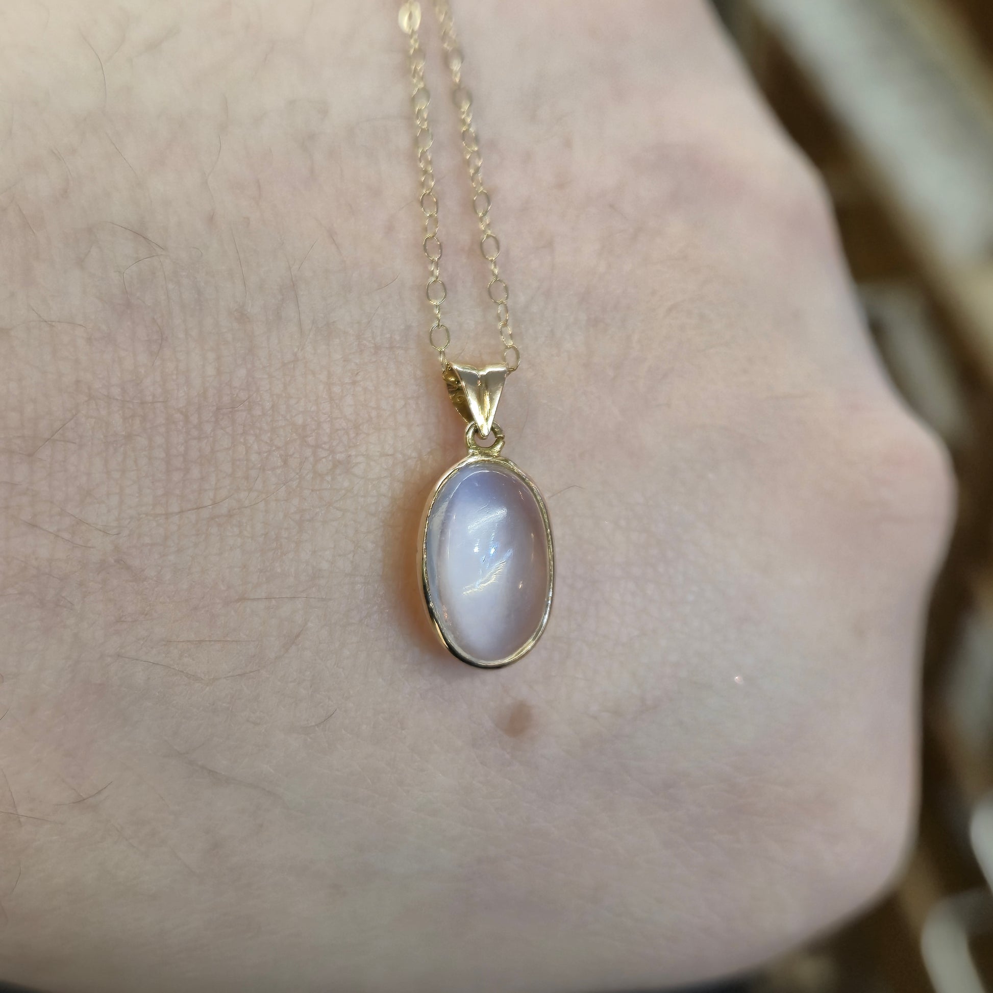The centrepiece is a smooth, polished oval Cabochon Moonstone. This stone is highly prized for its unique optical effect known as adularescence—a billowy, bluish-white or silvery light that appears to float just beneath the surface and shifts subtly as the pendant moves. This characteristic shimmer gives the stone its serene, moonlit appearance. The cabochon cut emphasizes this effect and gives the stone a smooth, domed finish.