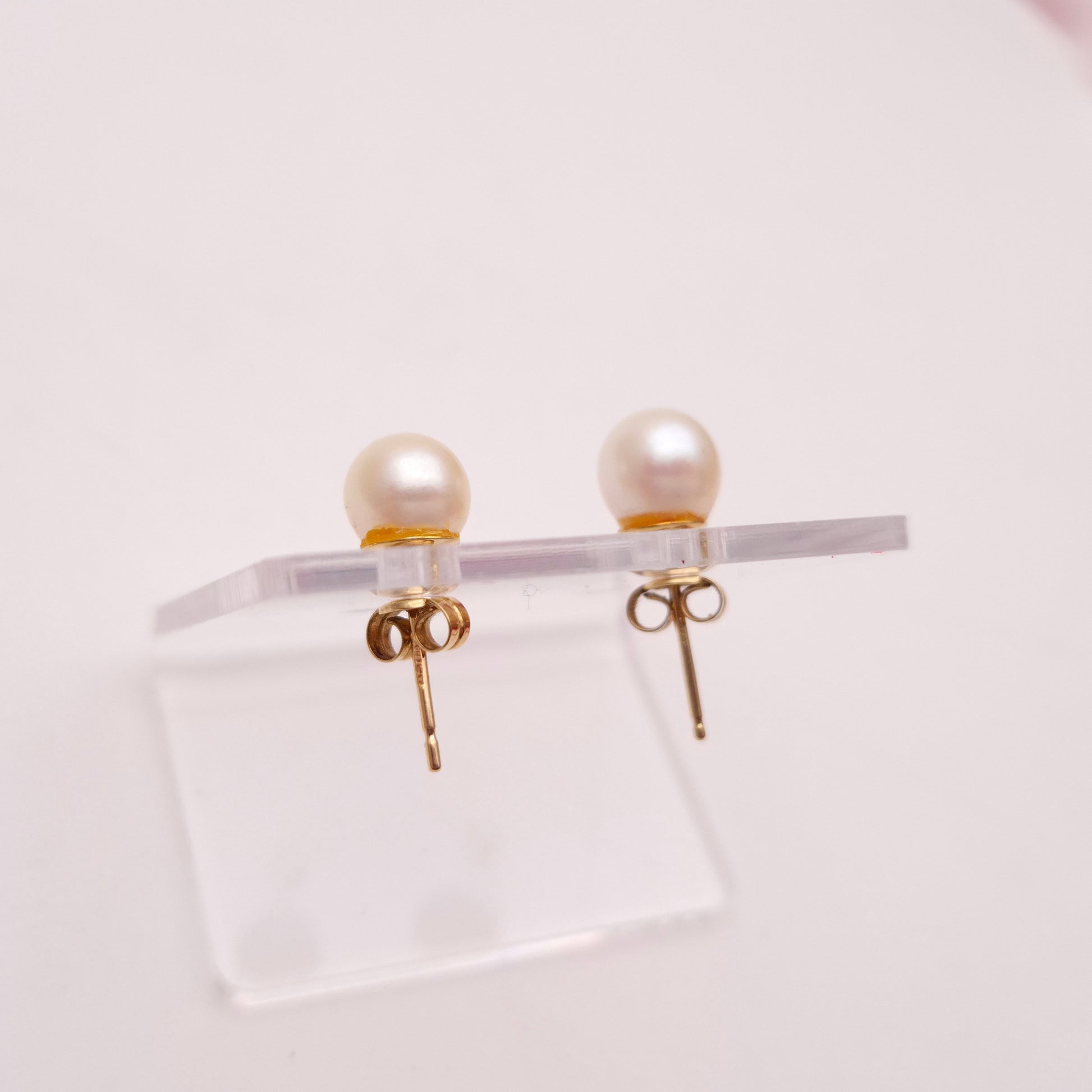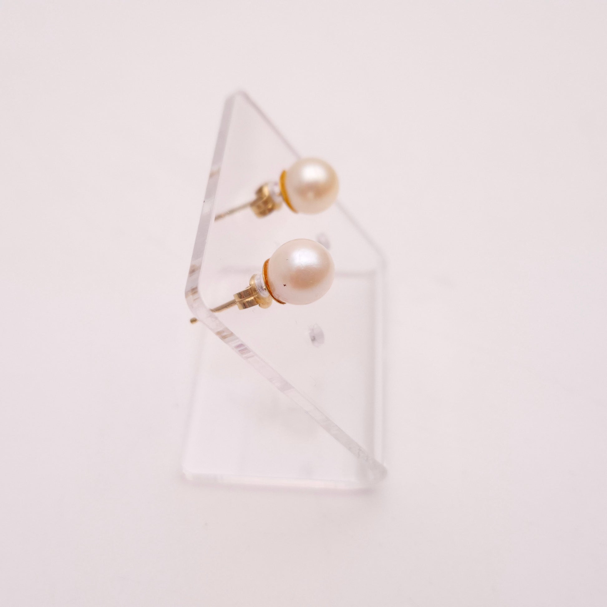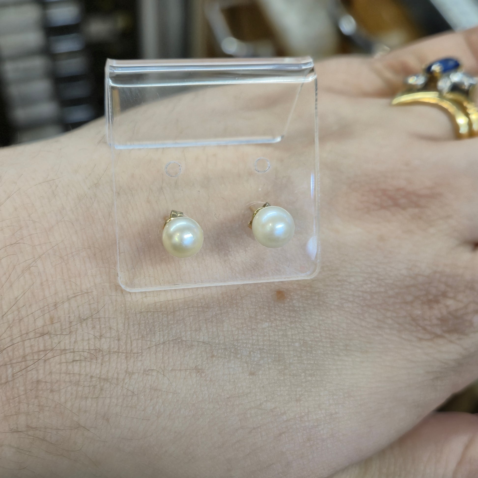 The pearls are set on a simple post, with a minimalist cup-style setting that highlights the pearl itself. The setting and posts are crafted from 9ct yellow gold, providing a beautiful contrast to the pearl's creamy white tone and enhancing its overall elegance. They are fitted with standard butterfly backings for secure and comfortable wear.