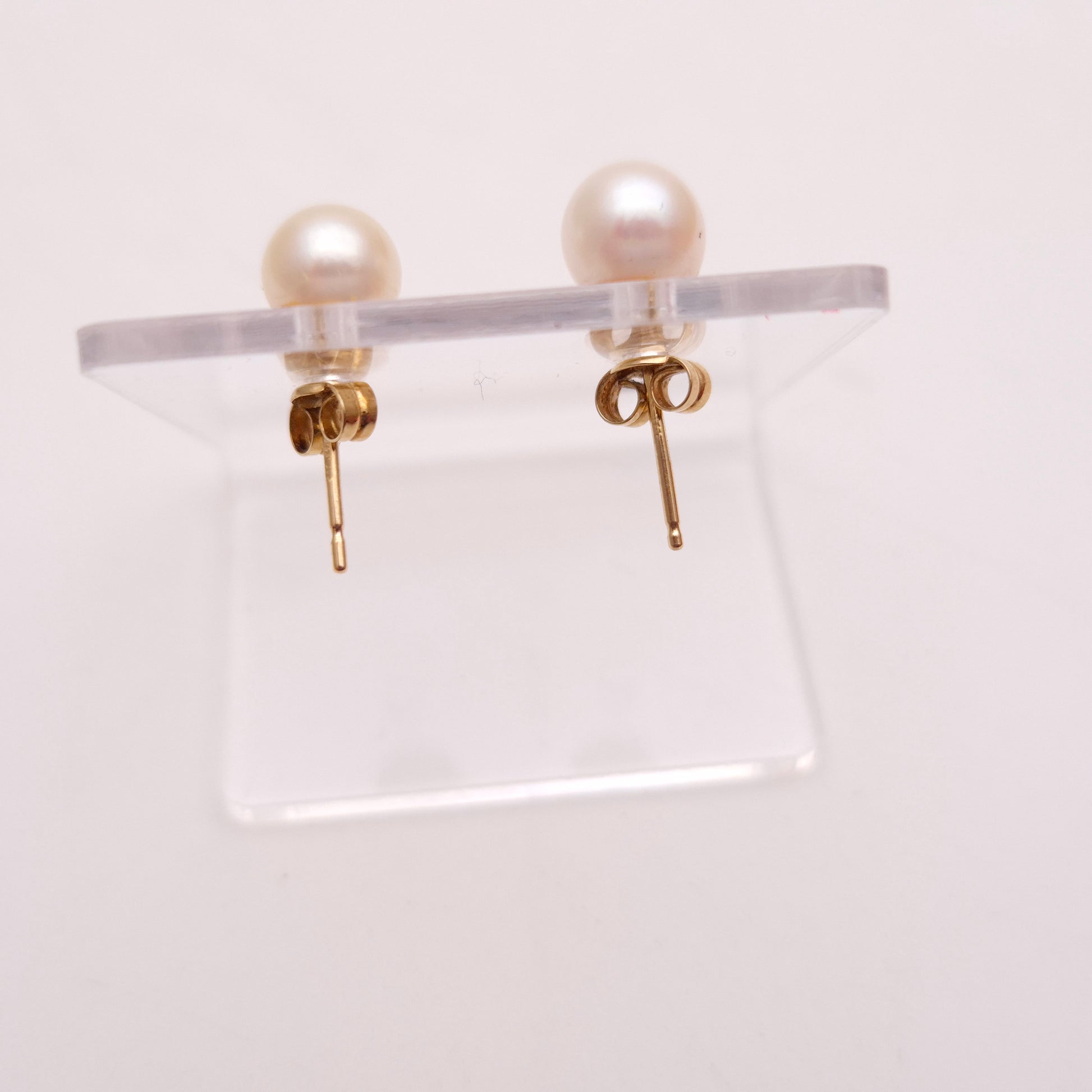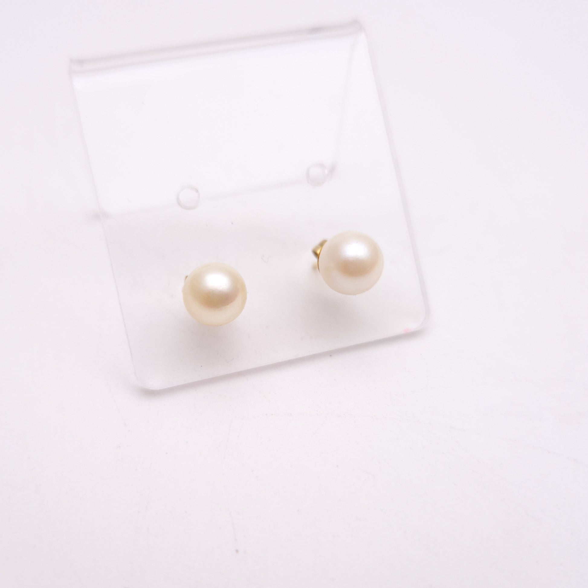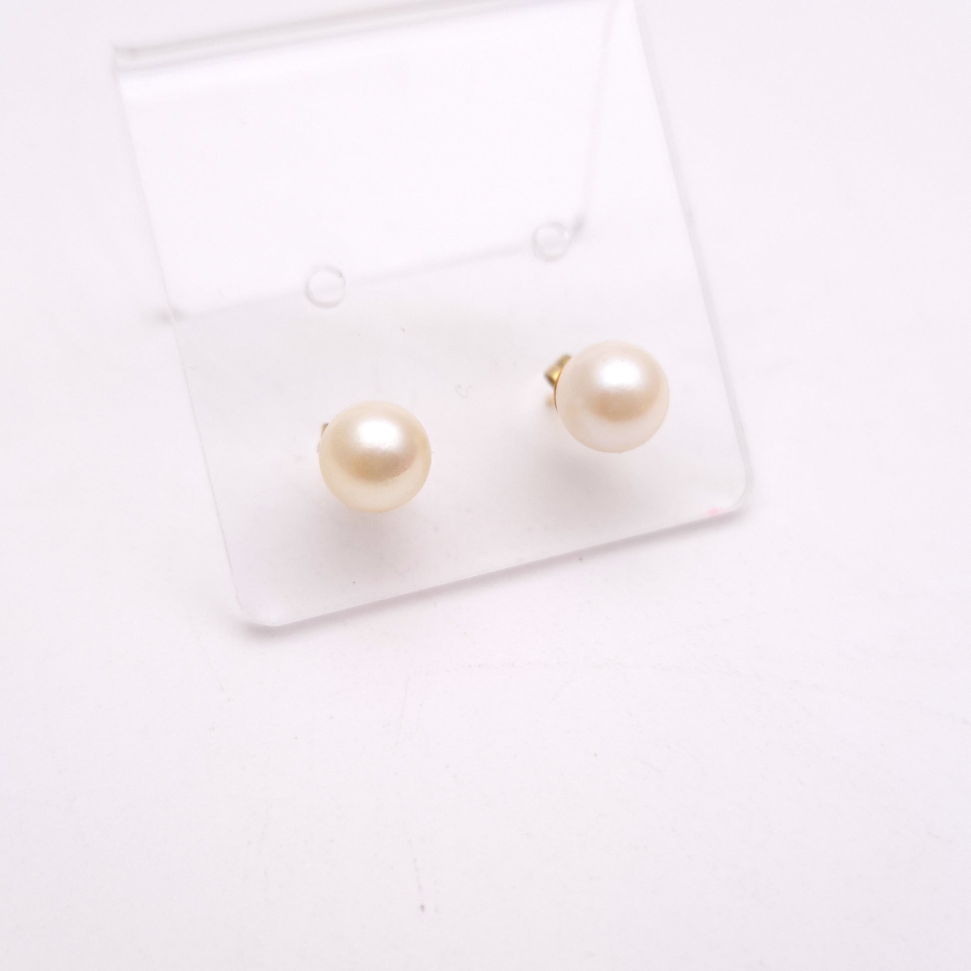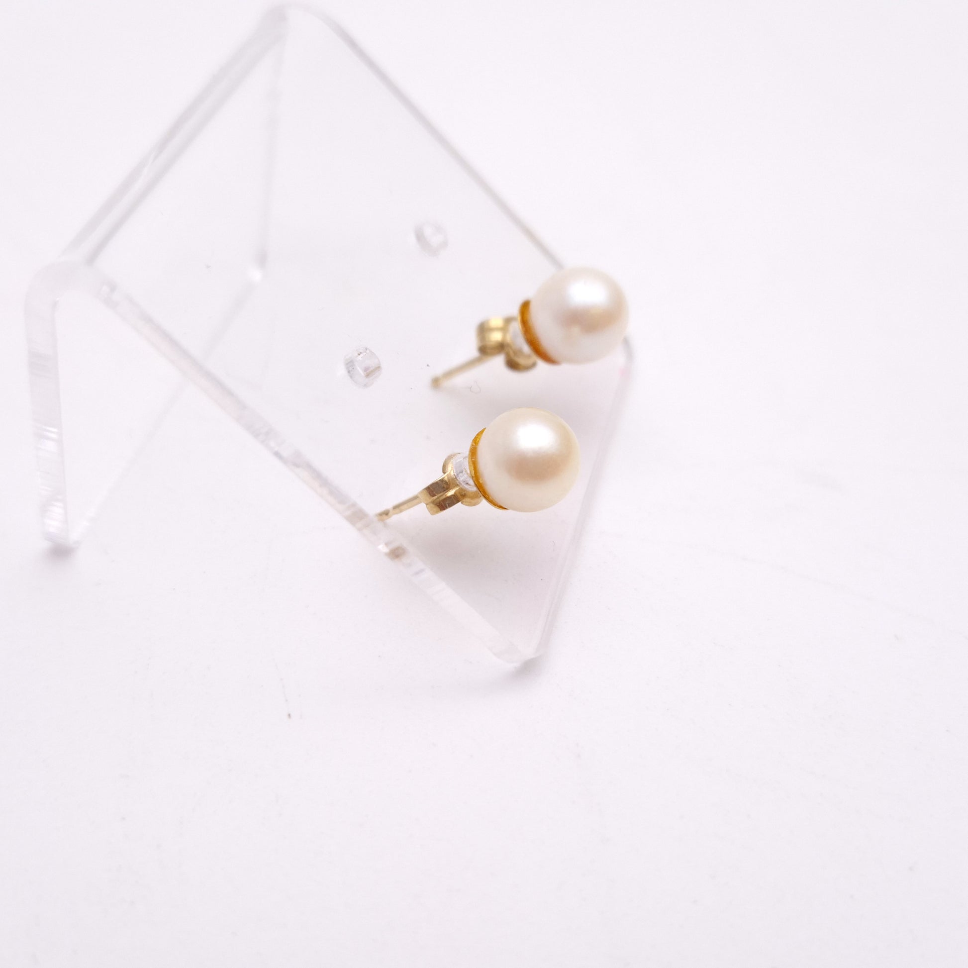 The pearls are set on a simple post, with a minimalist cup-style setting that highlights the pearl itself. The setting and posts are crafted from 9ct yellow gold, providing a beautiful contrast to the pearl's creamy white tone and enhancing its overall elegance. They are fitted with standard butterfly backings for secure and comfortable wear.