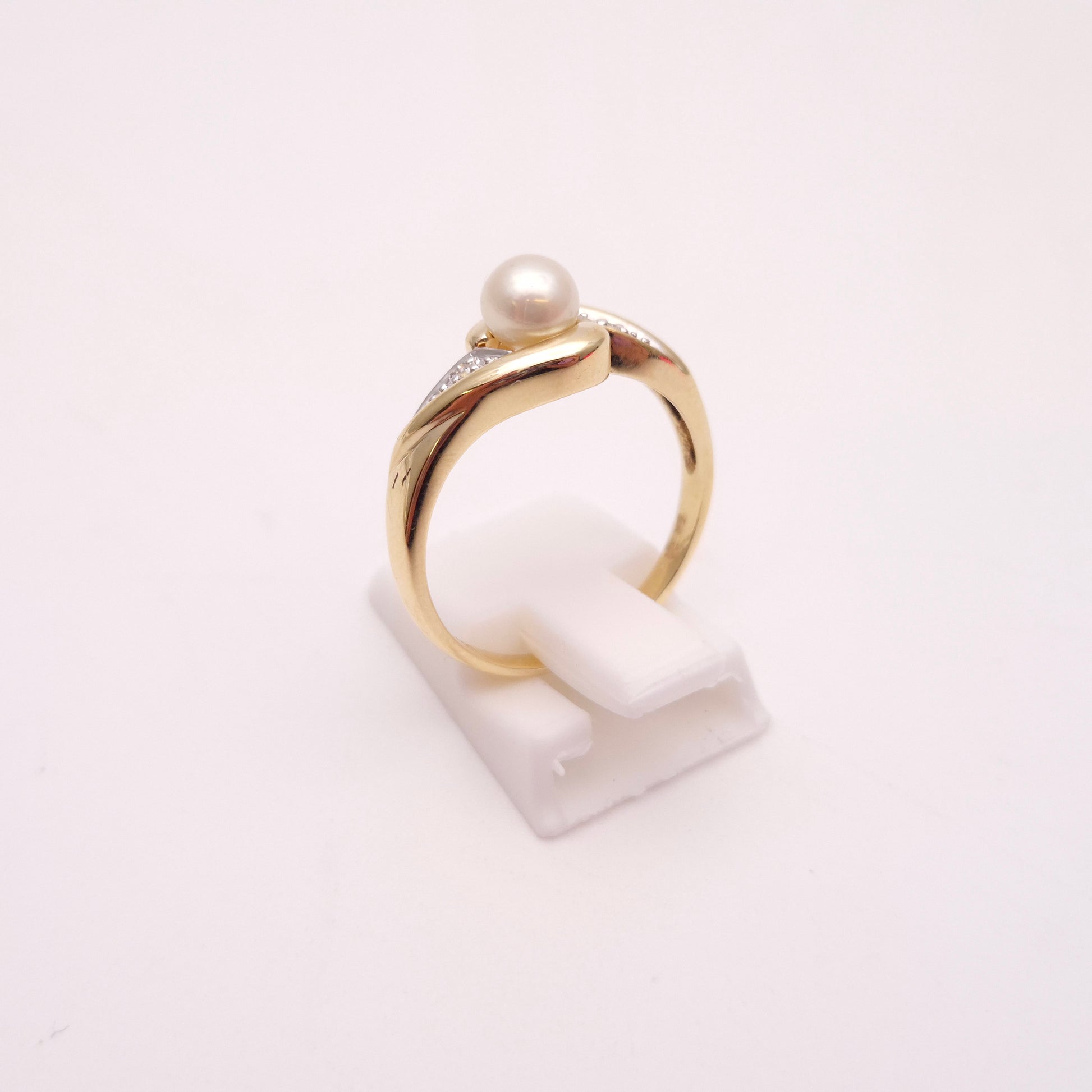 The shoulders of the ring are elegantly accented with small, shimmering diamonds set along the curves of the swirl. These diamond accents provide a touch of bright sparkle, drawing the eye towards the luminous pearl centrepiece. The swirl design gives the ring fluid movement and a contemporary feel, making it an ideal choice for a June birthstone gift (Pearl), or a beautiful accessory for any occasion.