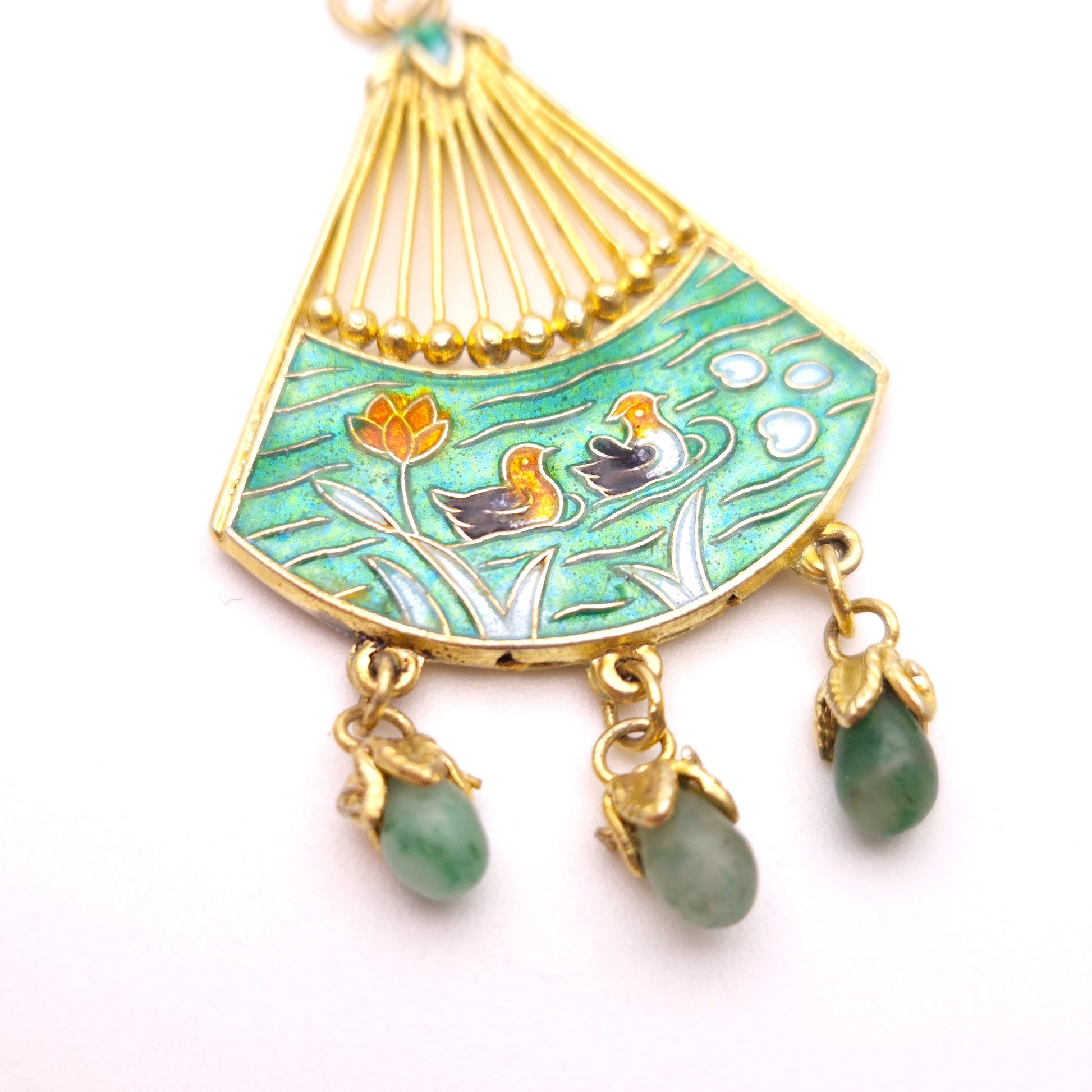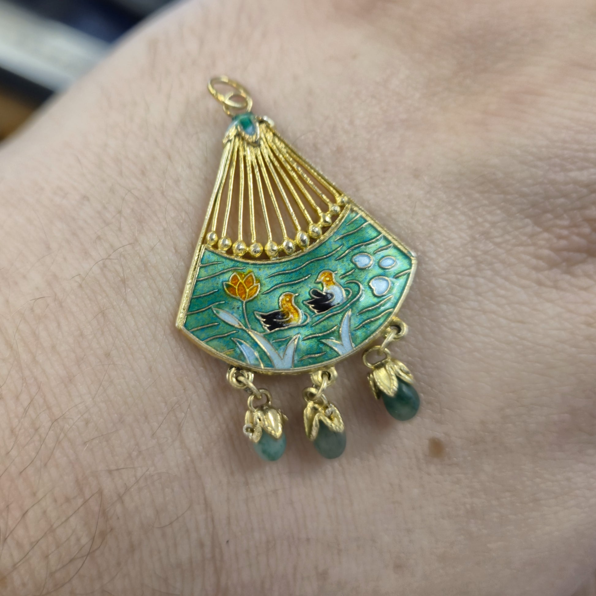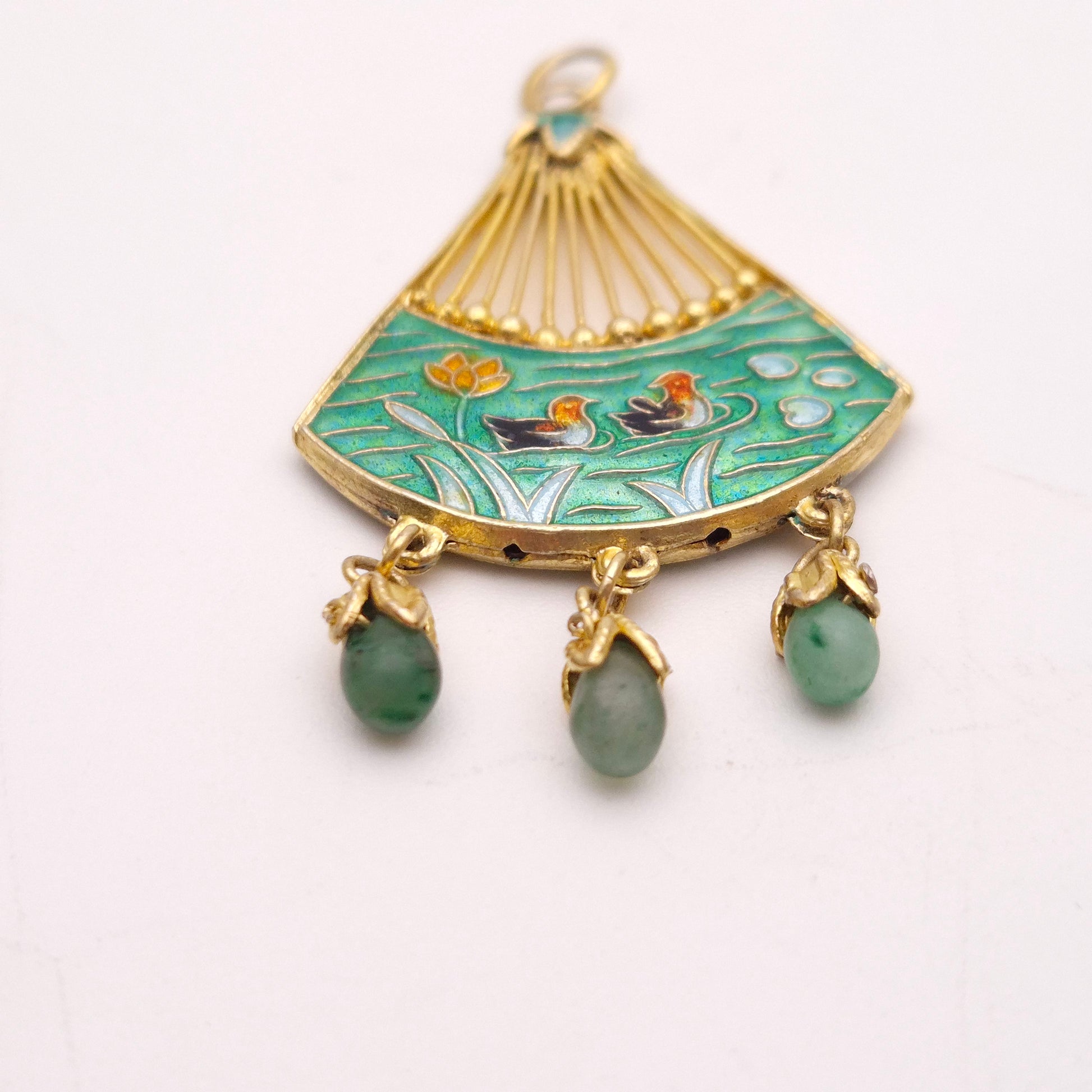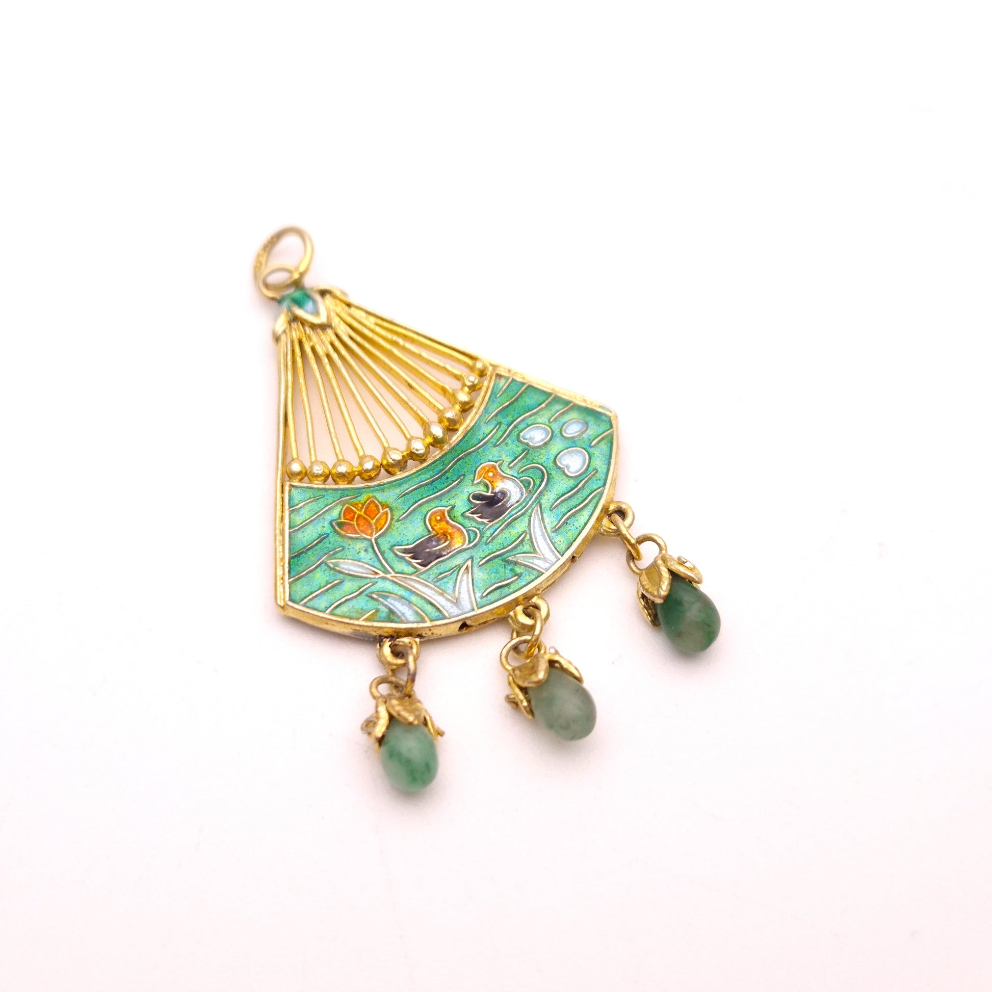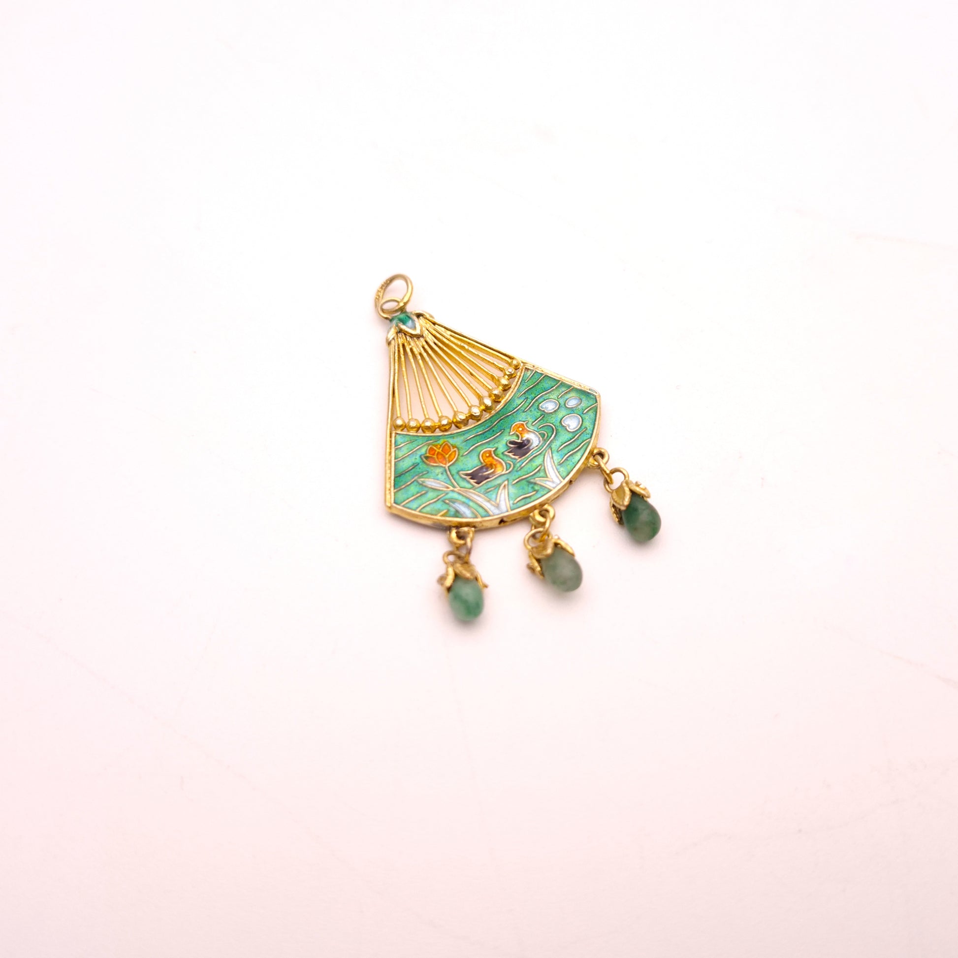 Gold Plated Silver Vintage Asian Cloisonne Fan With Jadeite Droppers Pendant