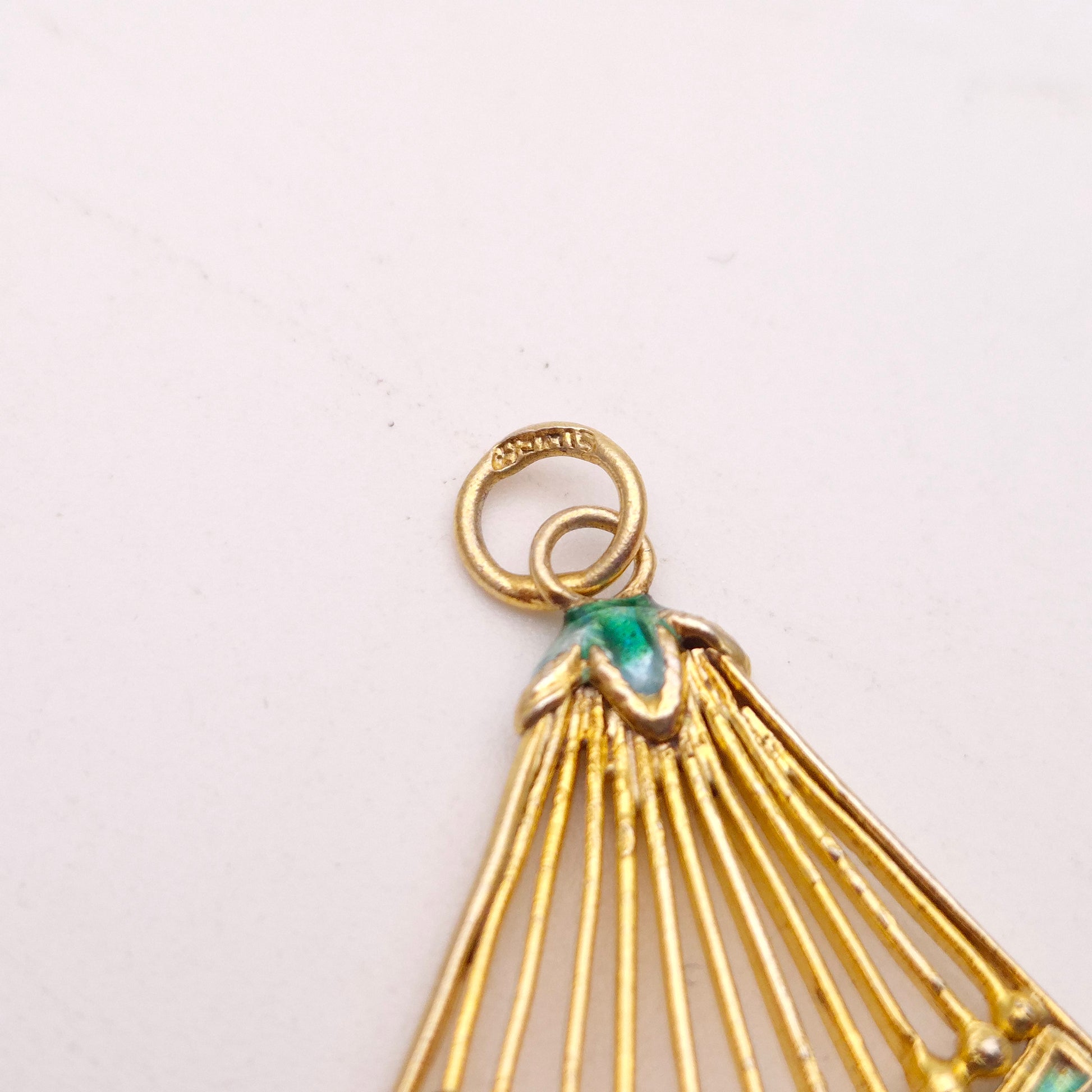 This enchanting vintage pendant is a beautifully crafted piece, featuring a delicate fan design made from gold-plated silver (stamped to jump ring at top and acid tested). It is adorned with vibrant cloisonné enamel work. The intricate cloisonné depicts a miniature scene, with birds and floral elements, in lovely shades of green, black, and orange, showcasing the traditional Asian artistry.