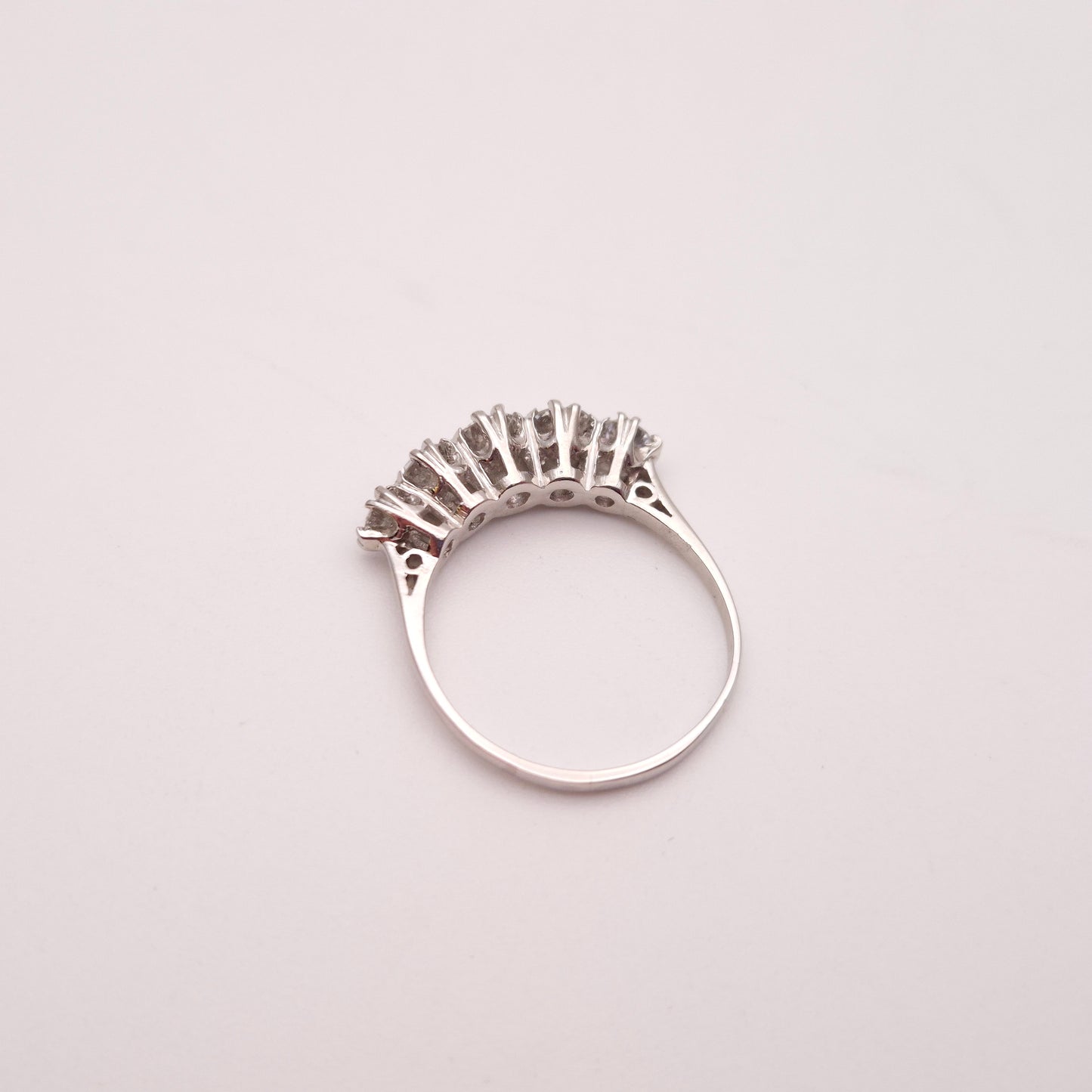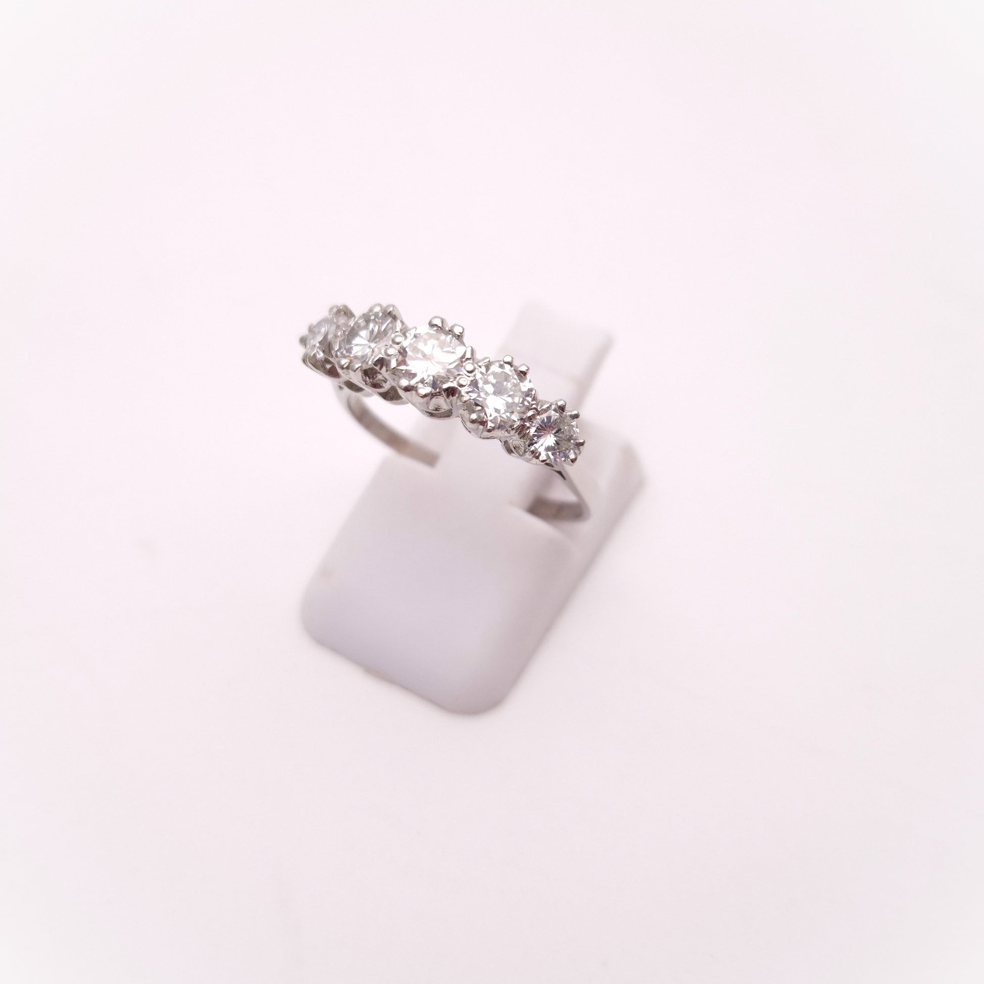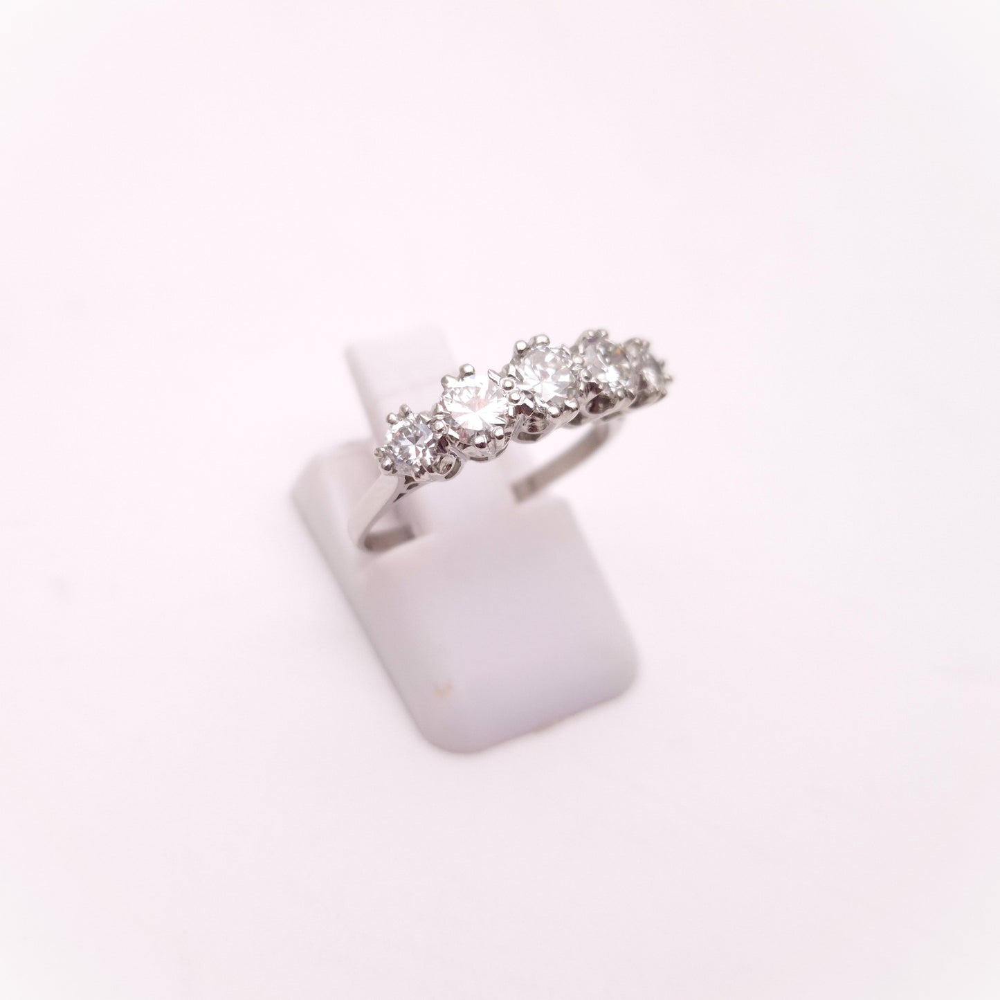This spectacular ring is a timeless piece of antique craftsmanship, featuring a magnificent row of five brilliant-cut diamonds set in luxurious platinum, celebrated for its incredible strength, durability, and cool, bright lustre, which never fades.