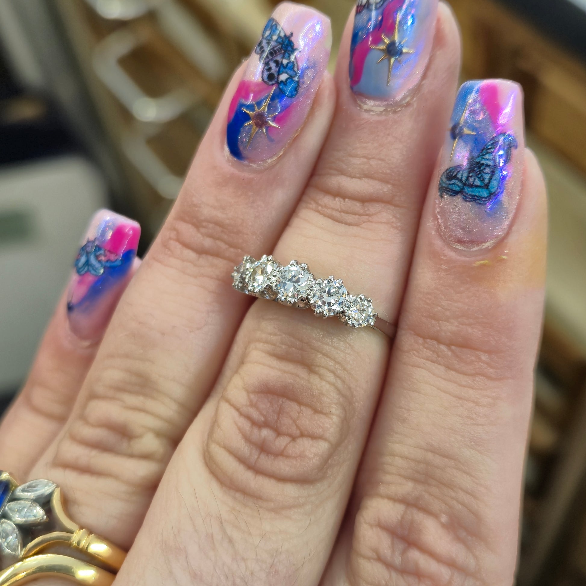 The five diamonds are beautiful examples of Old Cut stones, characterized by their unique faceting. This antique cutting style gives the diamonds a distinctive, deep, and romantic sparkle, highly prized by collectors. The stones are set closely together in individual claw settings, maximizing the light entering them and creating a continuous band of dazzling fire across the finger. The setting style and the substantial nature of the ring are highly characteristic of early 20th-century jewellery. This ring would make a perfect alternative wedding band, an elegant anniversary ring, or a stunning addition to an antique jewellery collection. It’s a classic, piece that offers genuine historical charm and enduring quality.