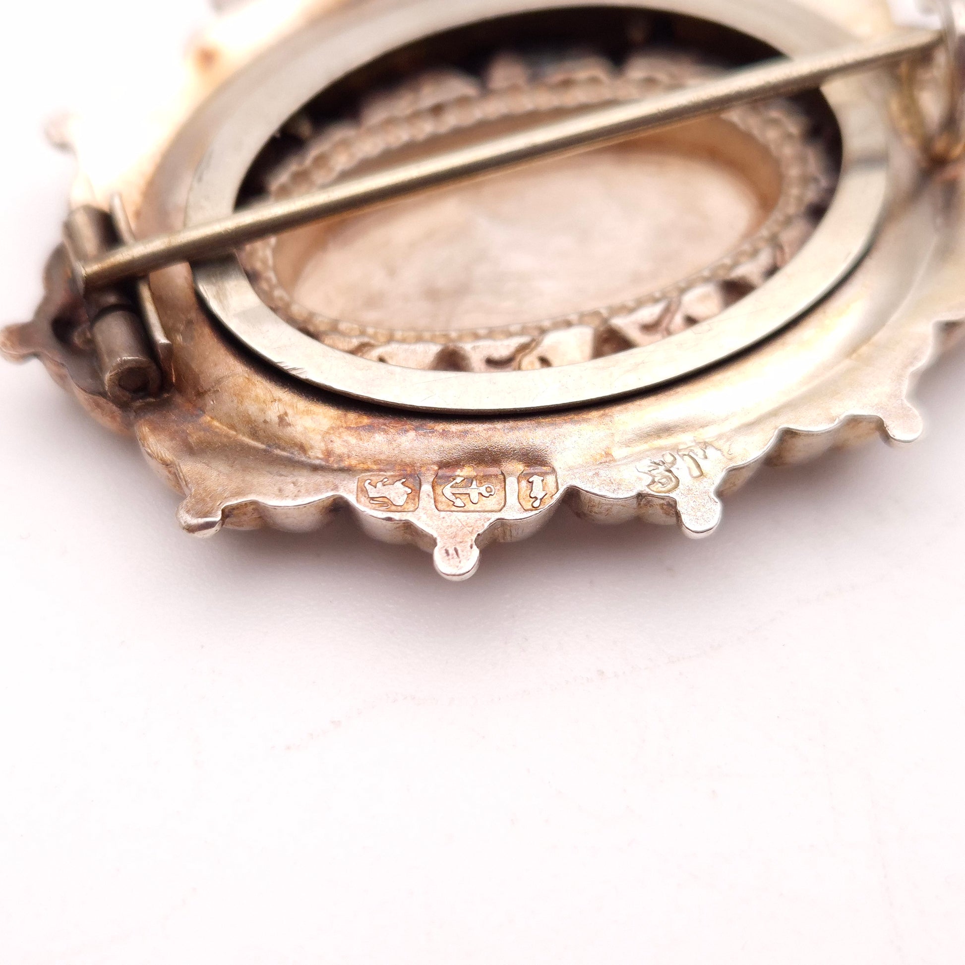 The brooch features a central oval motif made of sterling silver with a contrasting gold overlay to highlight the floral details. This central panel is meticulously engraved with a detailed floral pattern, including a prominent rose, showcasing the popular "Aesthetic Movement" style of the era which celebrated nature and art.
