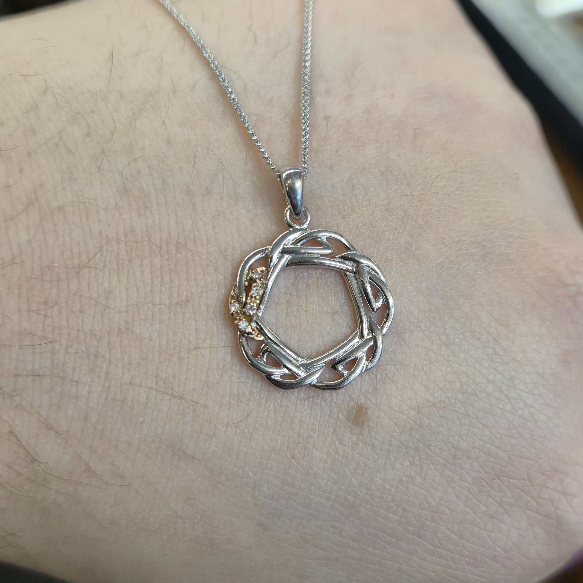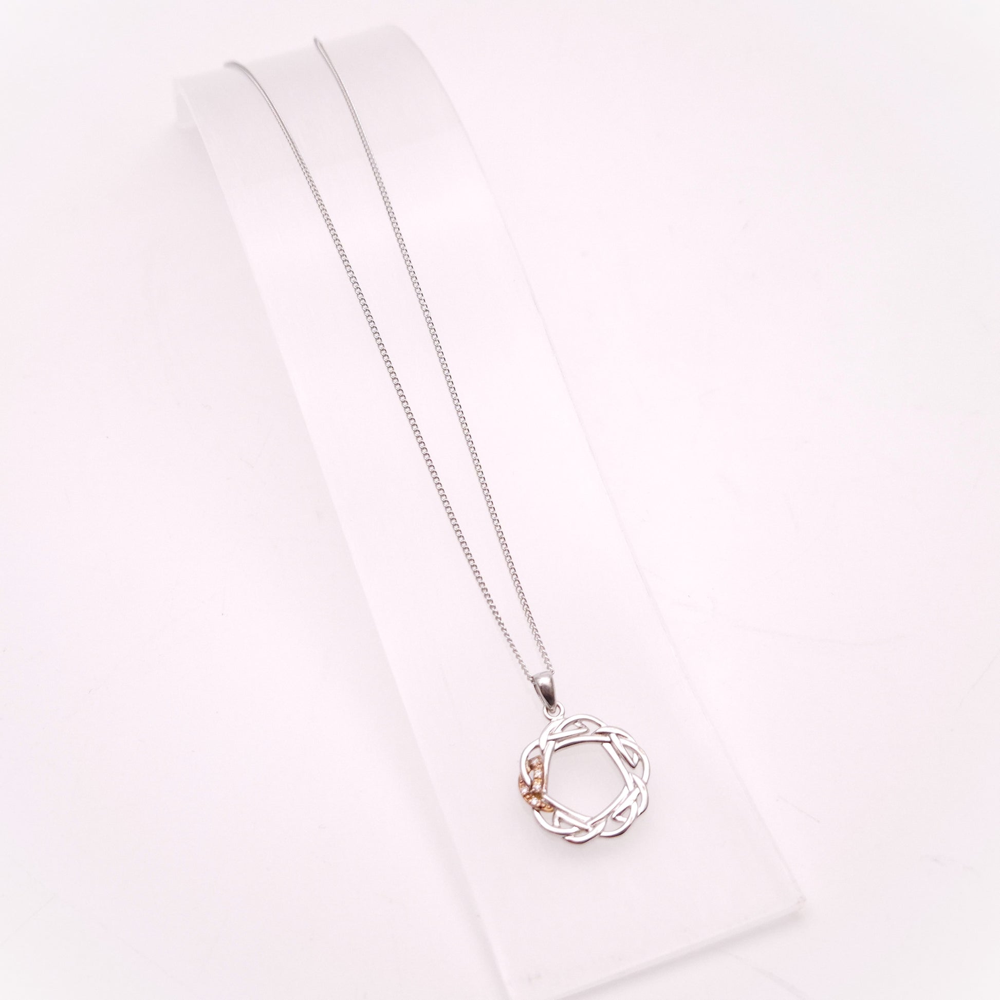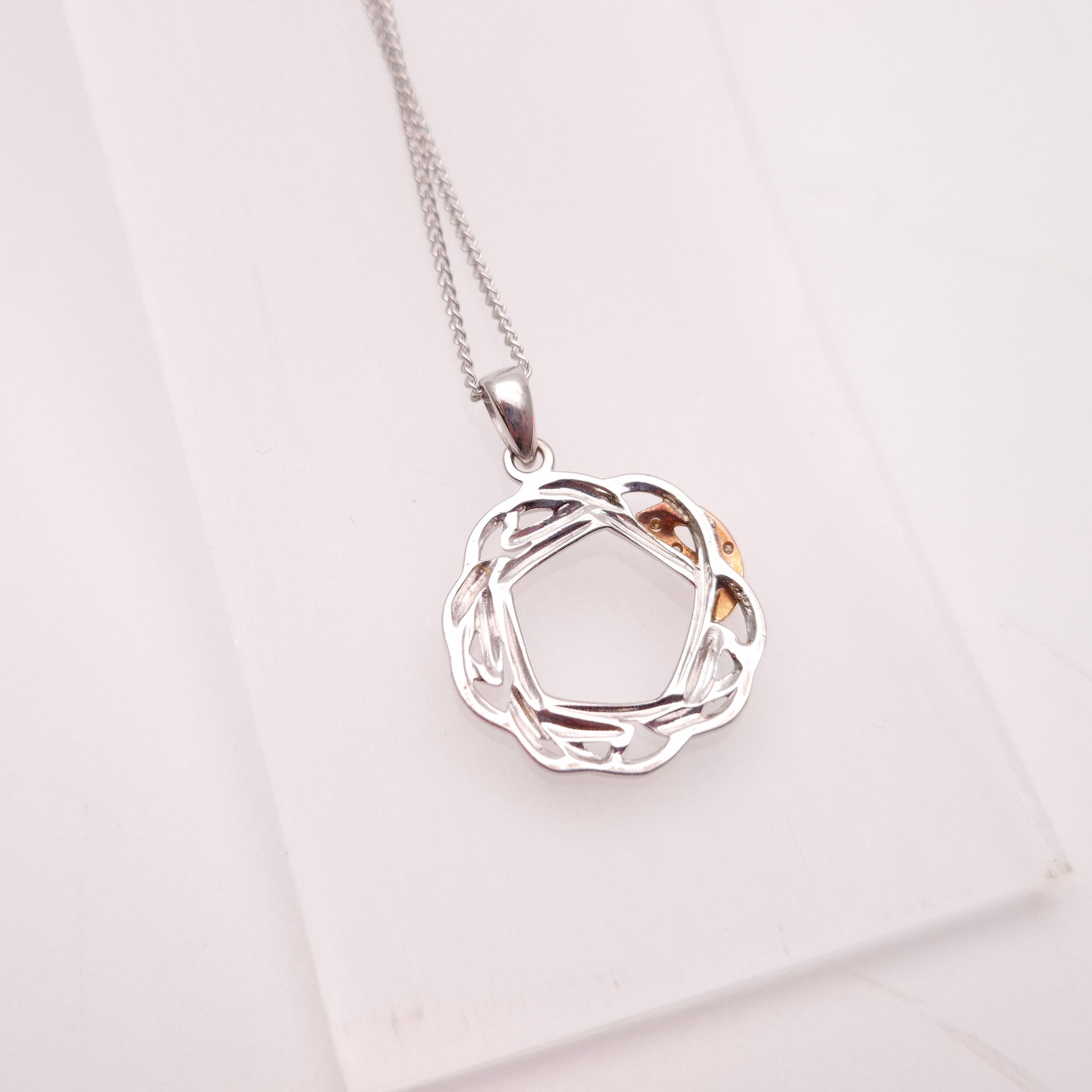 This beautiful necklace embodies the rich history and romantic symbolism of Welsh jewellery, often associated with the Clogau brand. It is crafted primarily in polished Sterling Silver and features a touch of rare Welsh Rose Gold and diamonds as an accent.