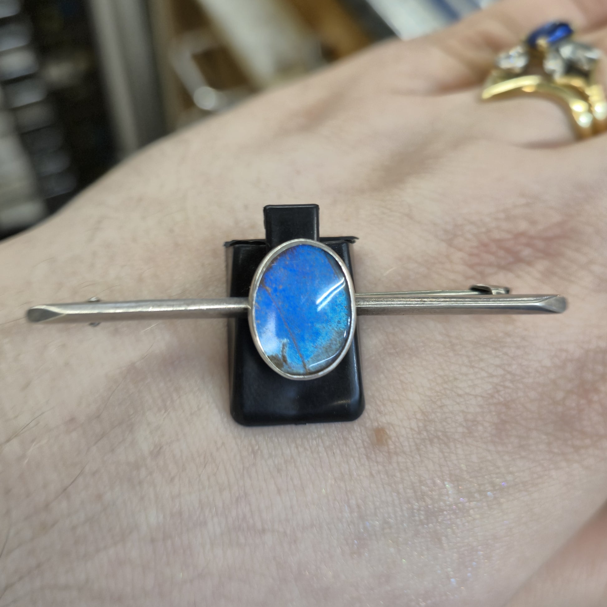 This remarkable brooch is a rare, dated piece of antique jewellery, highly sought after for its unique and mesmerizing use of natural elements. It is crafted in polished Sterling Silver, forming a sleek, horizontal Bar Brooch style, characteristic of the early 20th century.