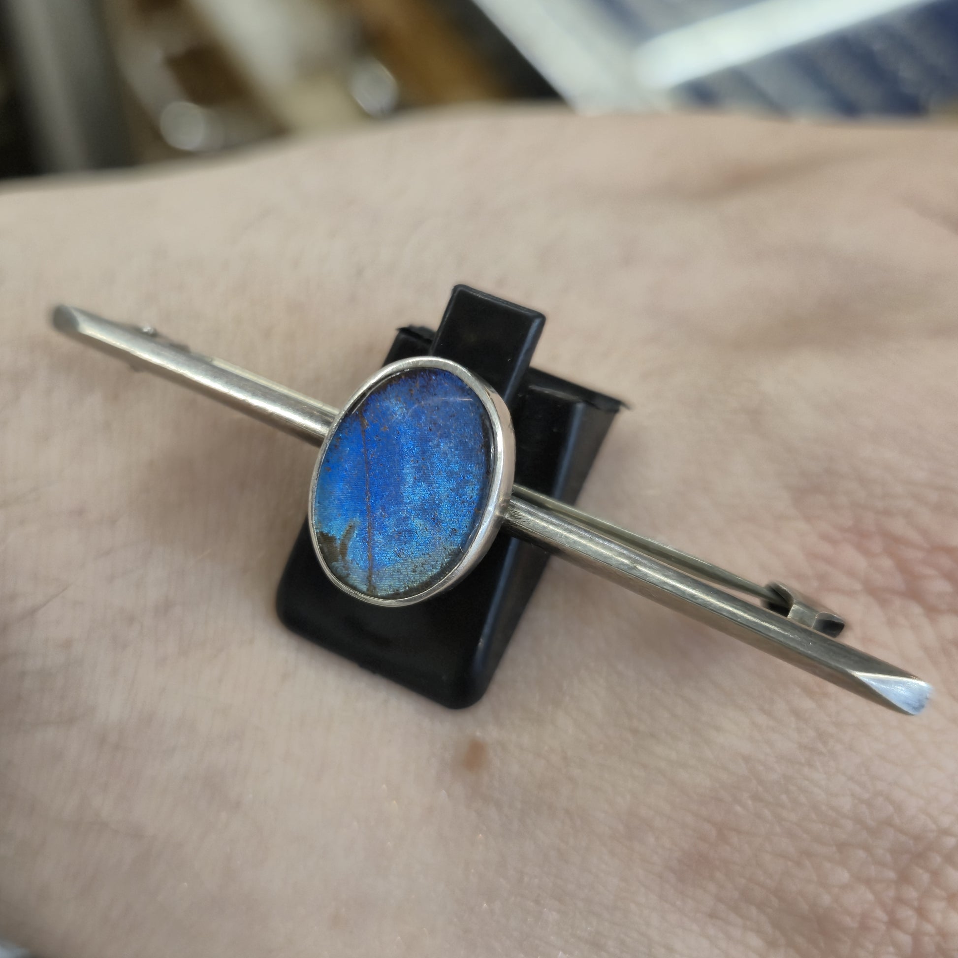 The central feature is the genuine Butterfly Wing section, which is set beneath a protective clear covering. This piece showcases the spectacular, intense blue iridescence of the butterfly wing (often sourced from the Morpho species). The colour shifts and glows with a brilliant, electric blue as it catches the light, creating a vivid effect.