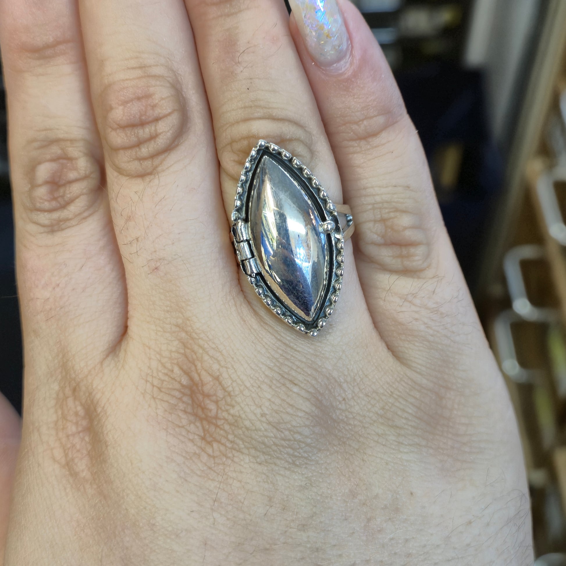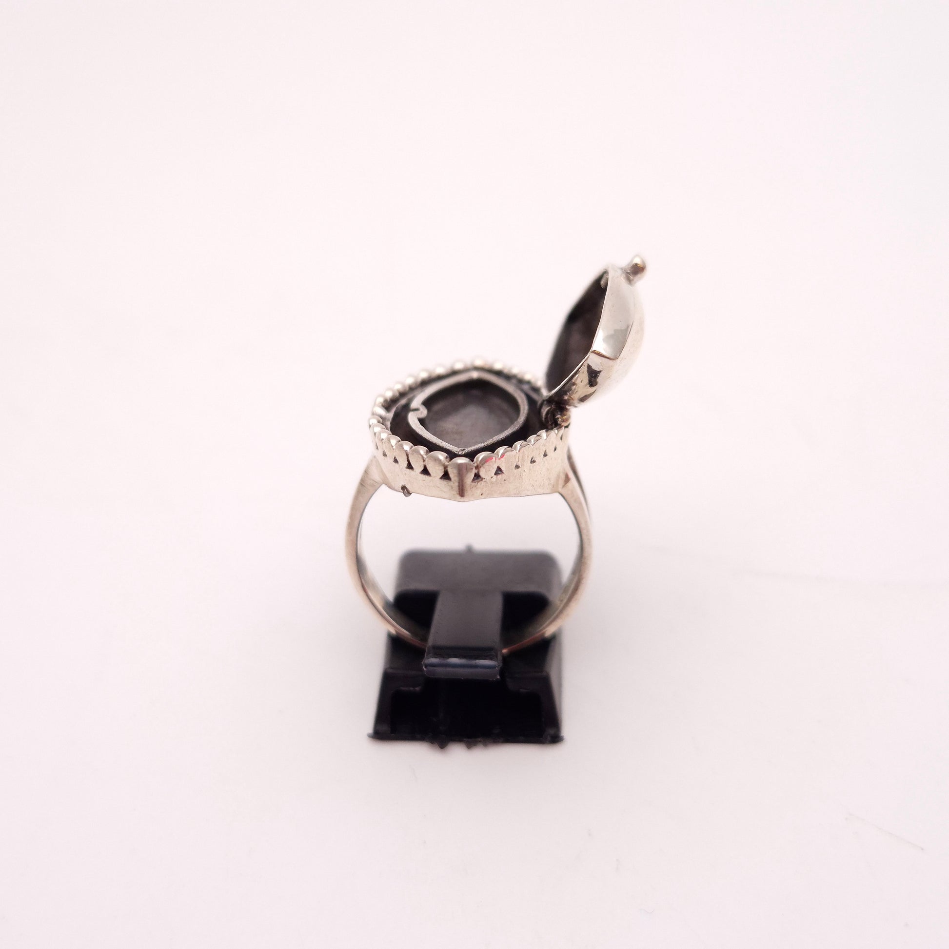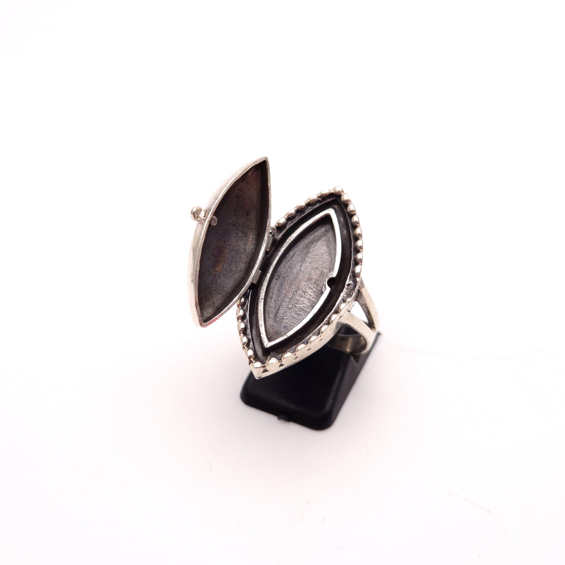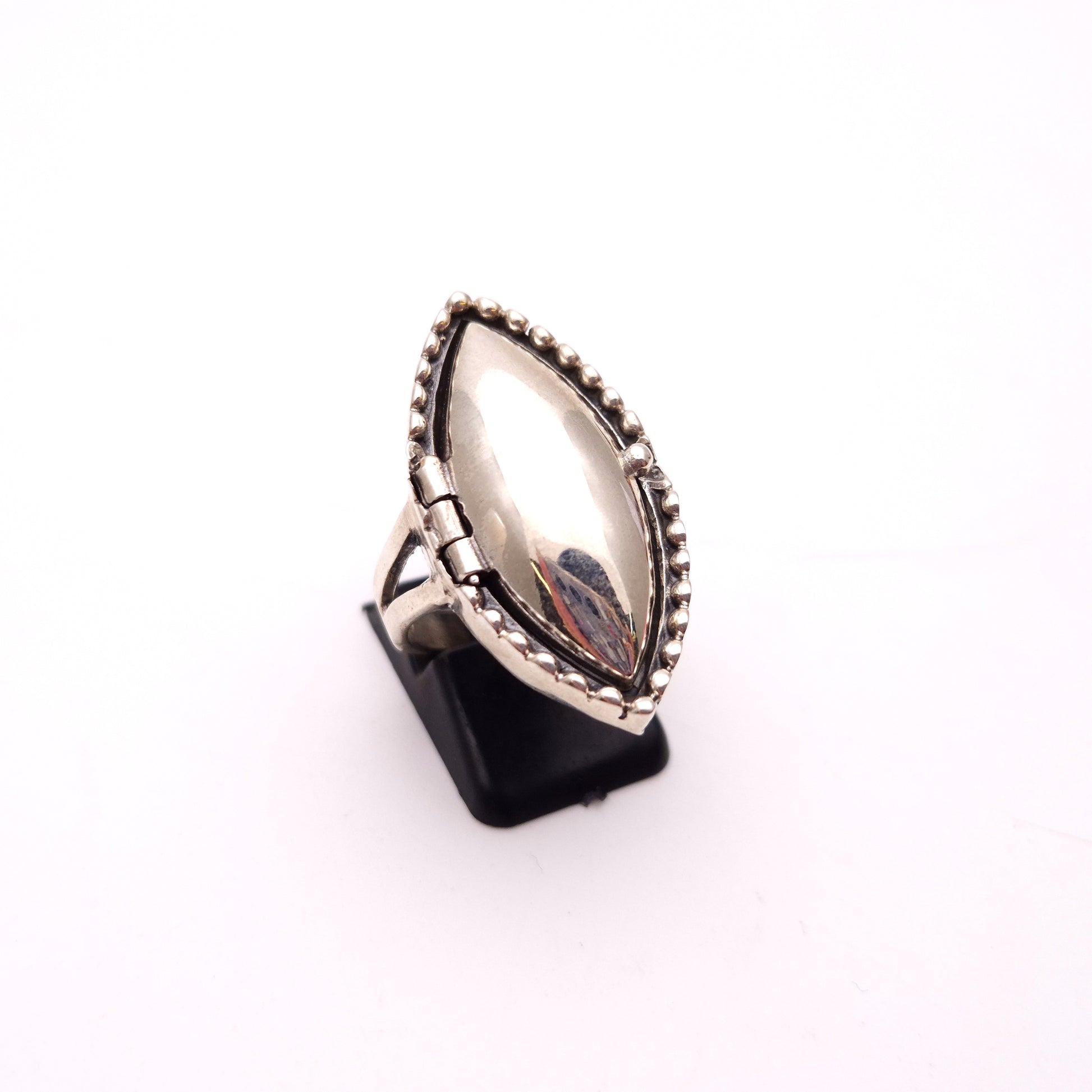 This intriguing and unique sterling silver ring is more than just an accessory—it's a piece of history and mystery. This marquise-shaped ring features a hinged top that opens to reveal a secret compartment, perfect for holding a tiny keepsake, a folded note, or a small memento.