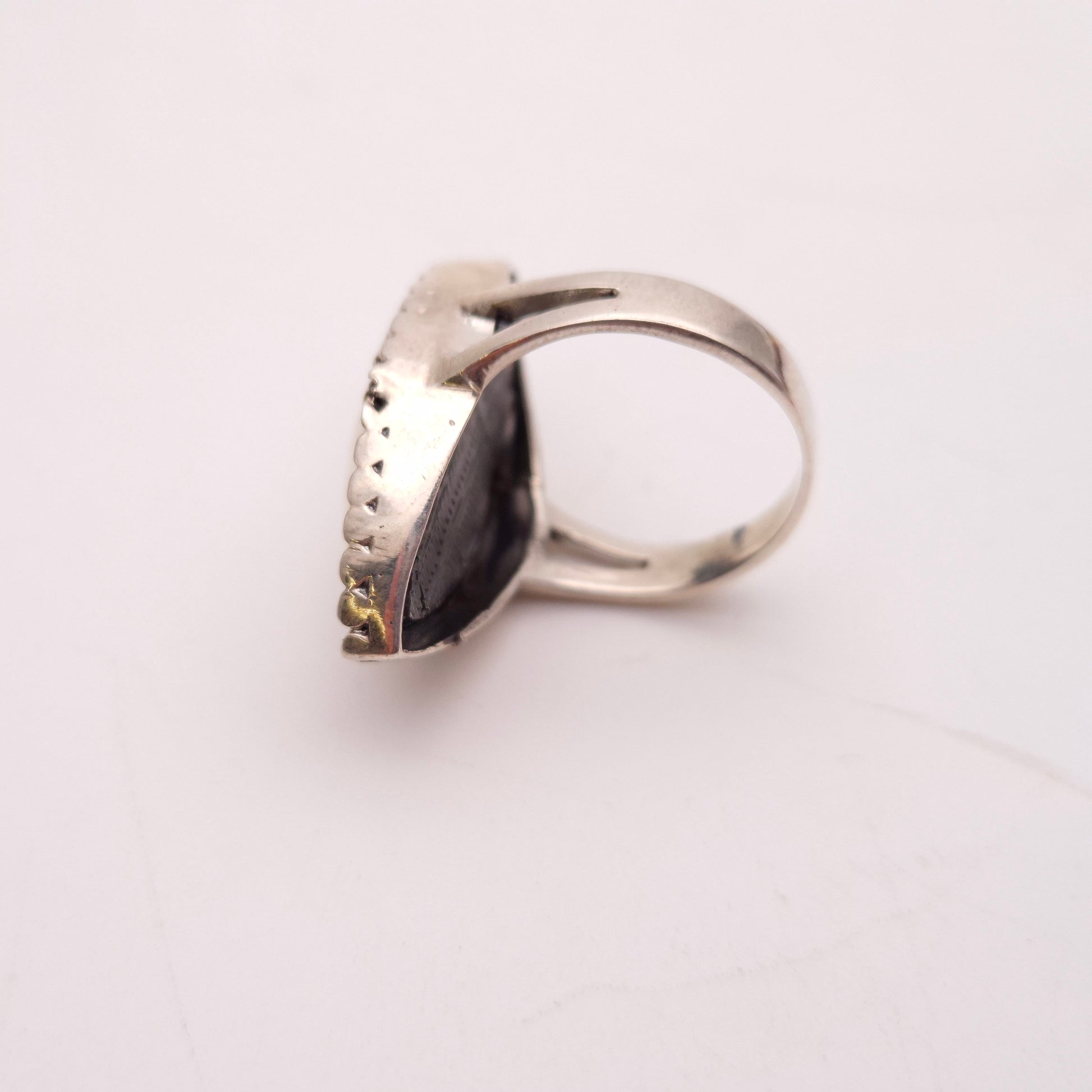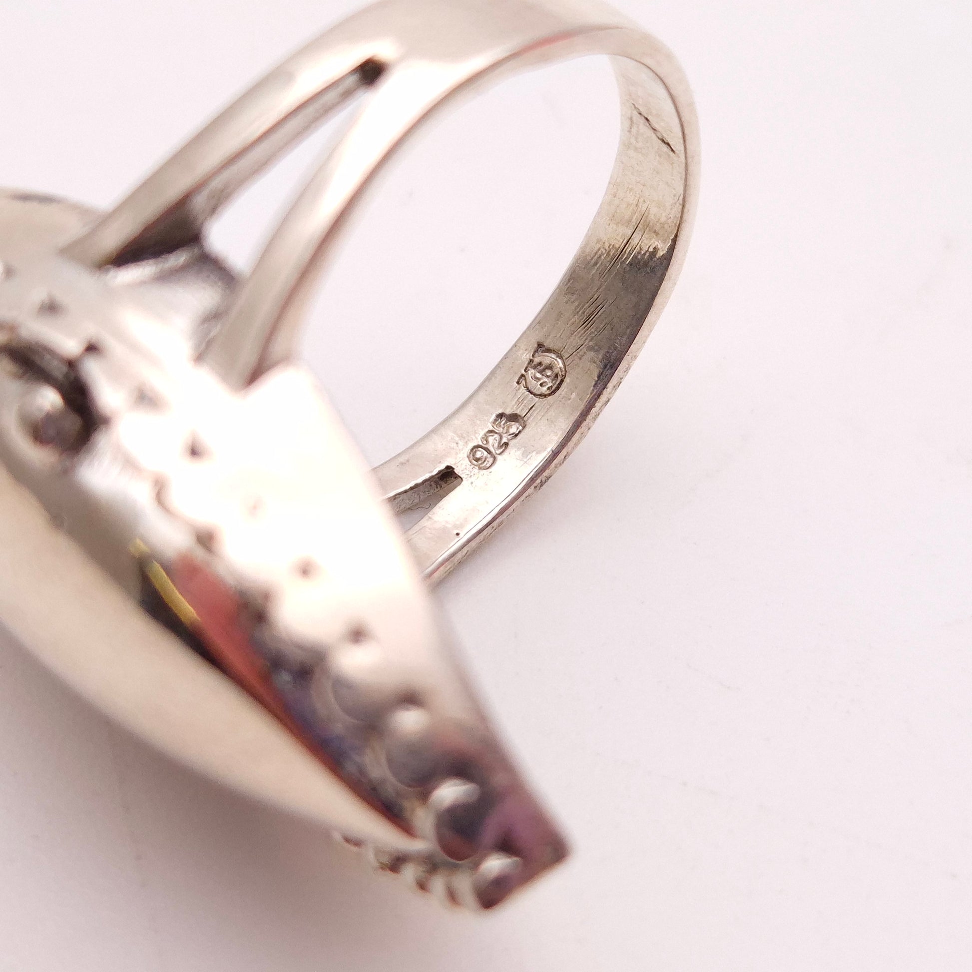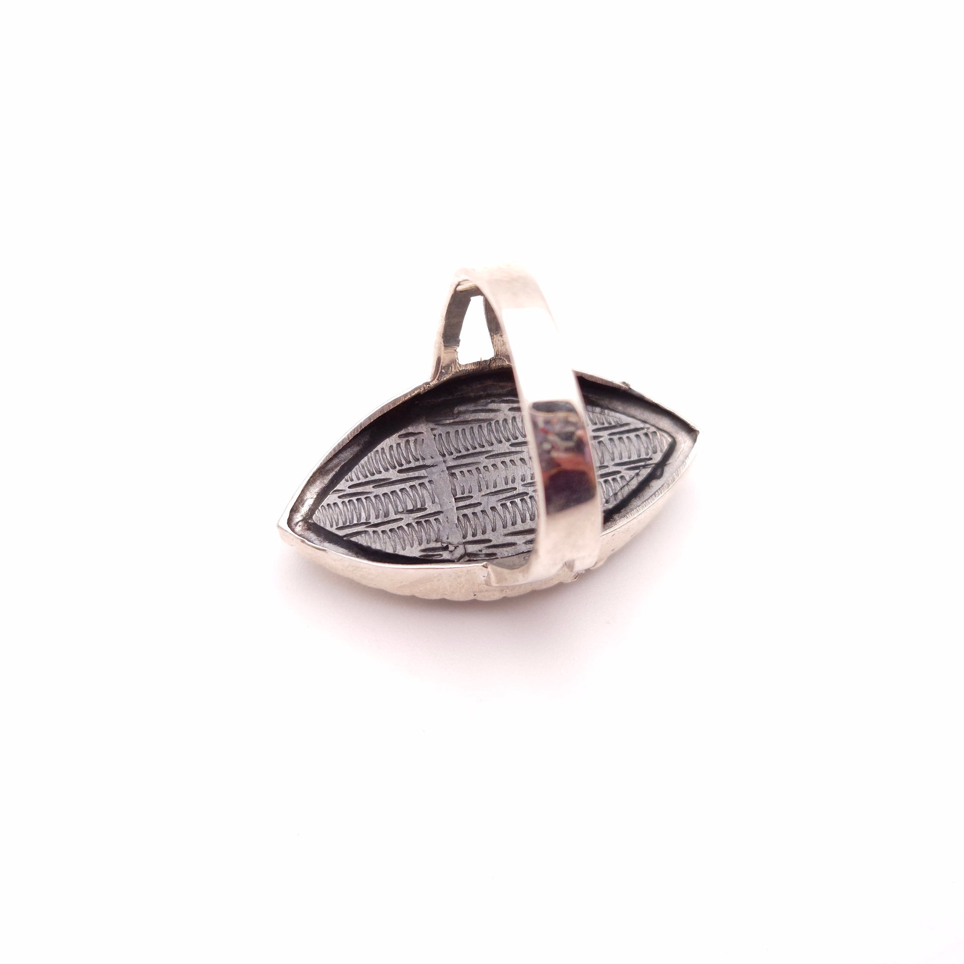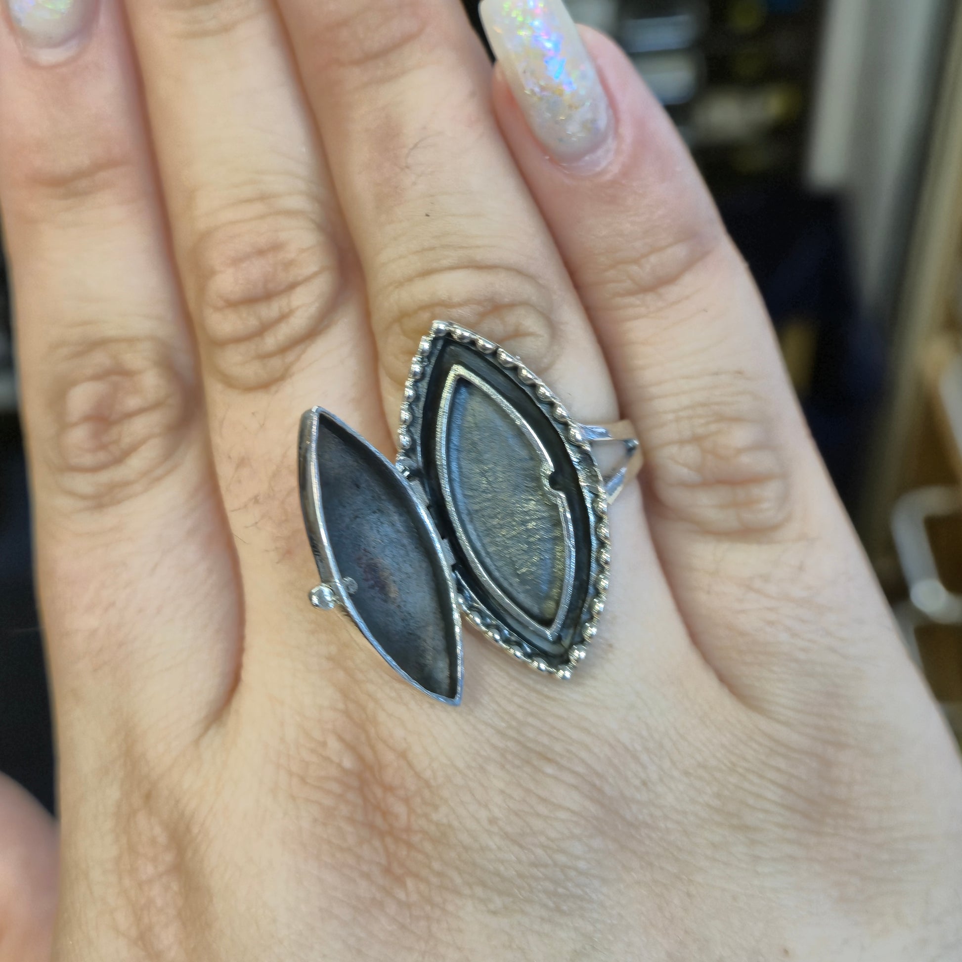 This intriguing and unique sterling silver ring is more than just an accessory—it's a piece of history and mystery. This marquise-shaped ring features a hinged top that opens to reveal a secret compartment, perfect for holding a tiny keepsake, a folded note, or a small memento.