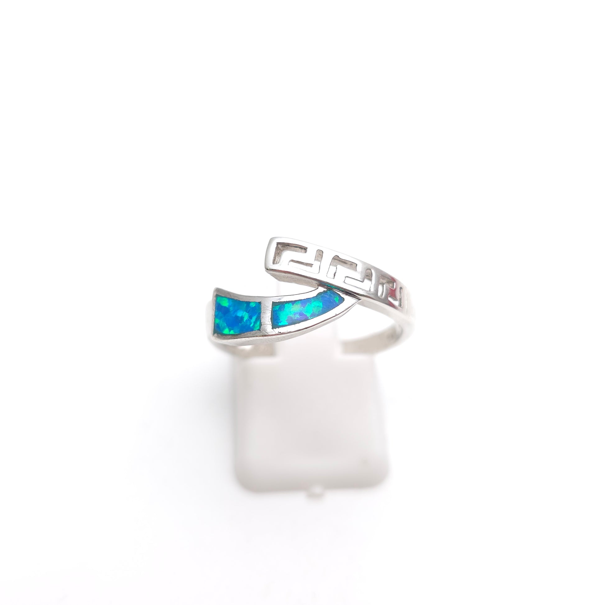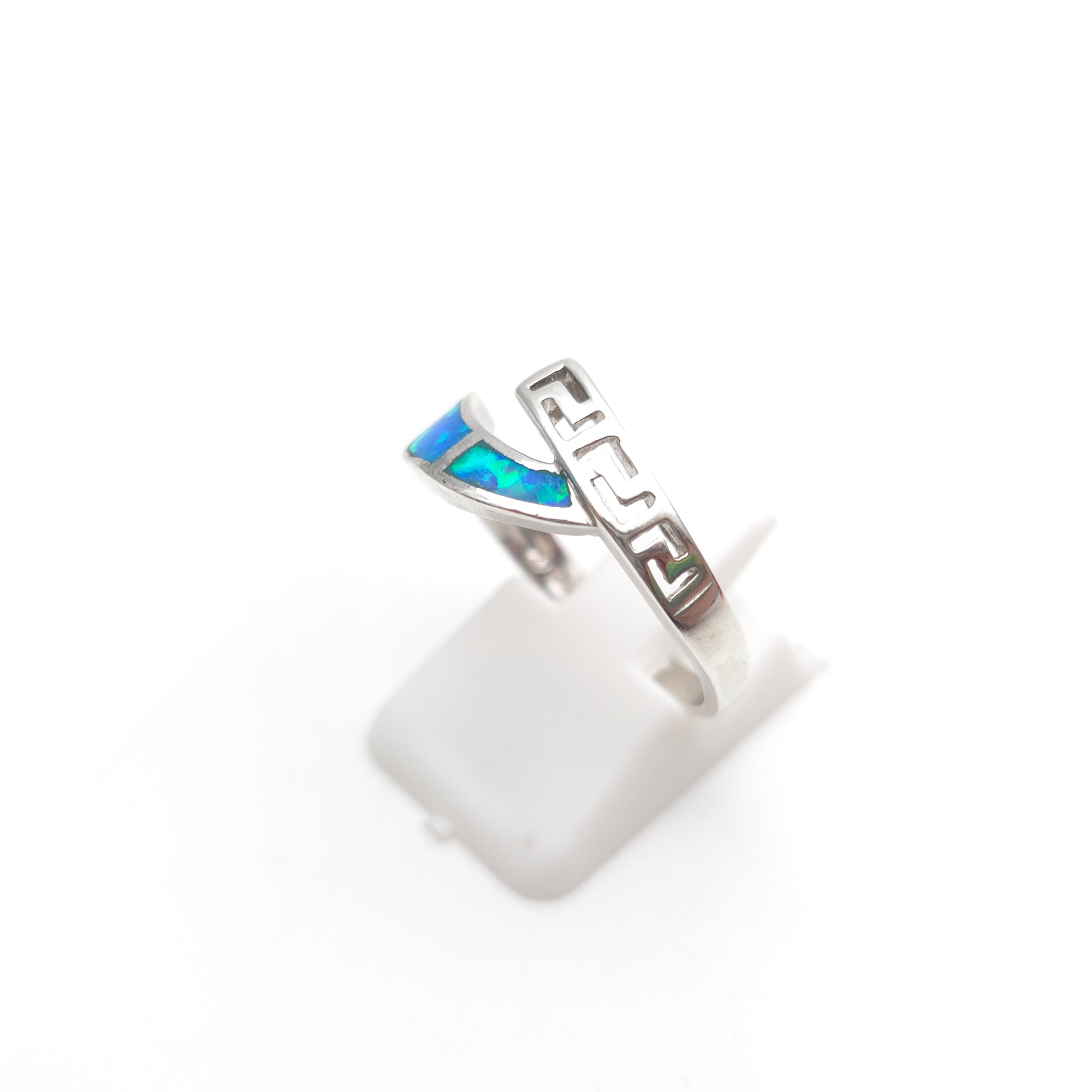 One side of the ring is inlaid with vibrant blue synthetic opal, showcasing a mesmerizing play-of-colour with flashes of turquoise, electric blue, and deep sea green. This is contrasted beautifully by the opposing band, which features an intricate openwork Greek Key (Meander) cut-out pattern. This classic motif adds an architectural, historical touch to an otherwise contemporary piece.
