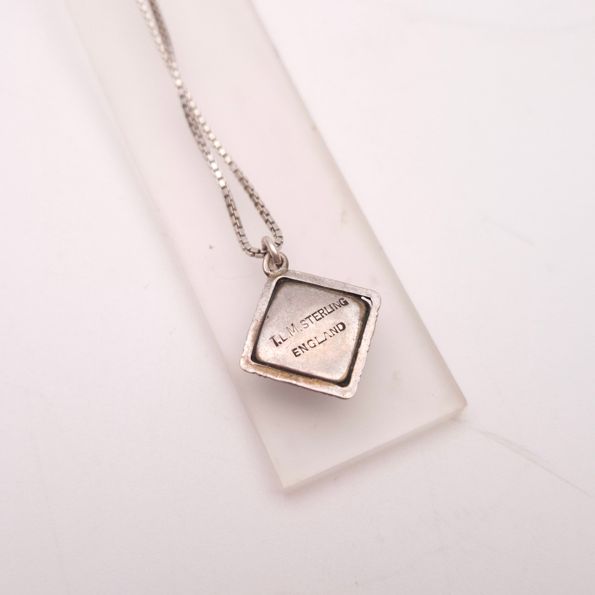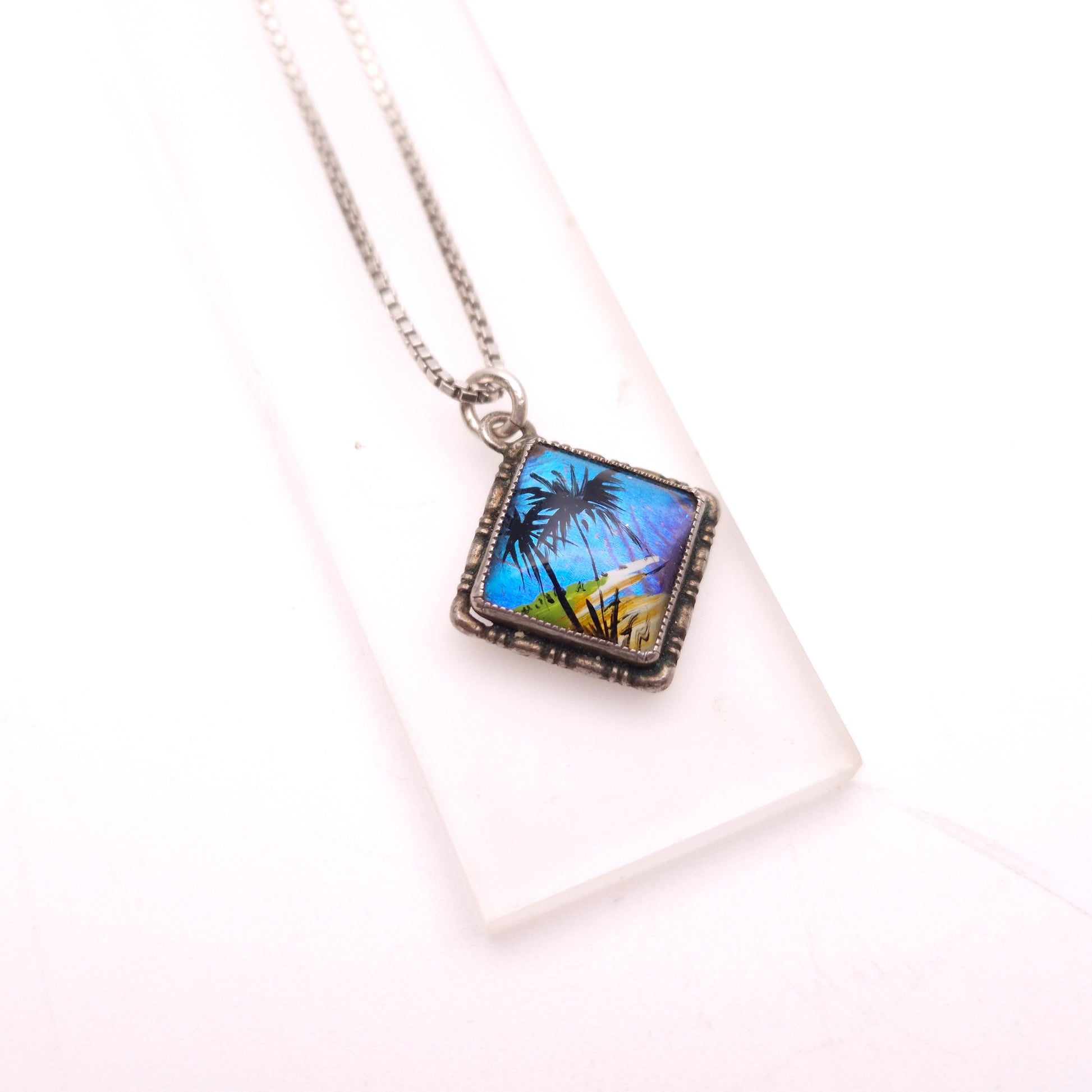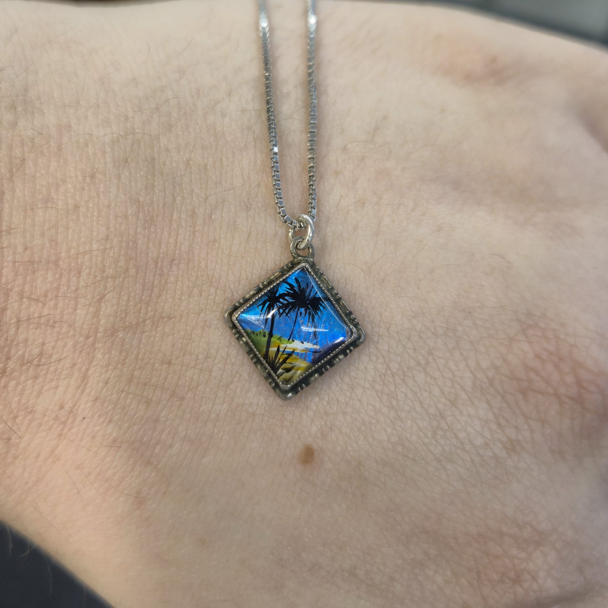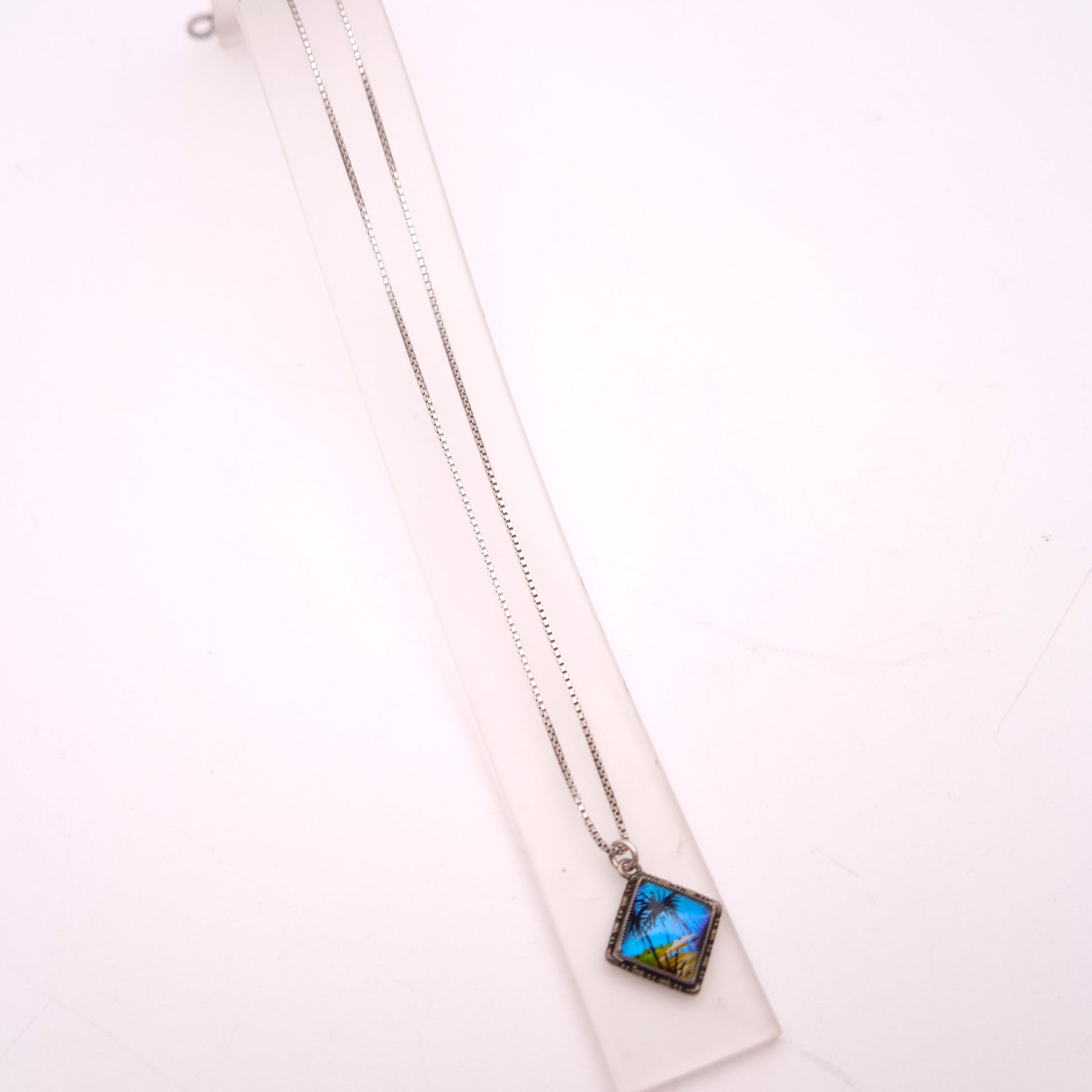 The miniature artwork within the diamond-shaped pendant depicts a serene tropical island with palm trees silhouetted against a brilliant blue sky, evoking a sense of paradise. The sterling silver frame securely encases this delicate art piece and is attached to a fine sterling silver box chain, known for its smooth feel and subtle sparkle.