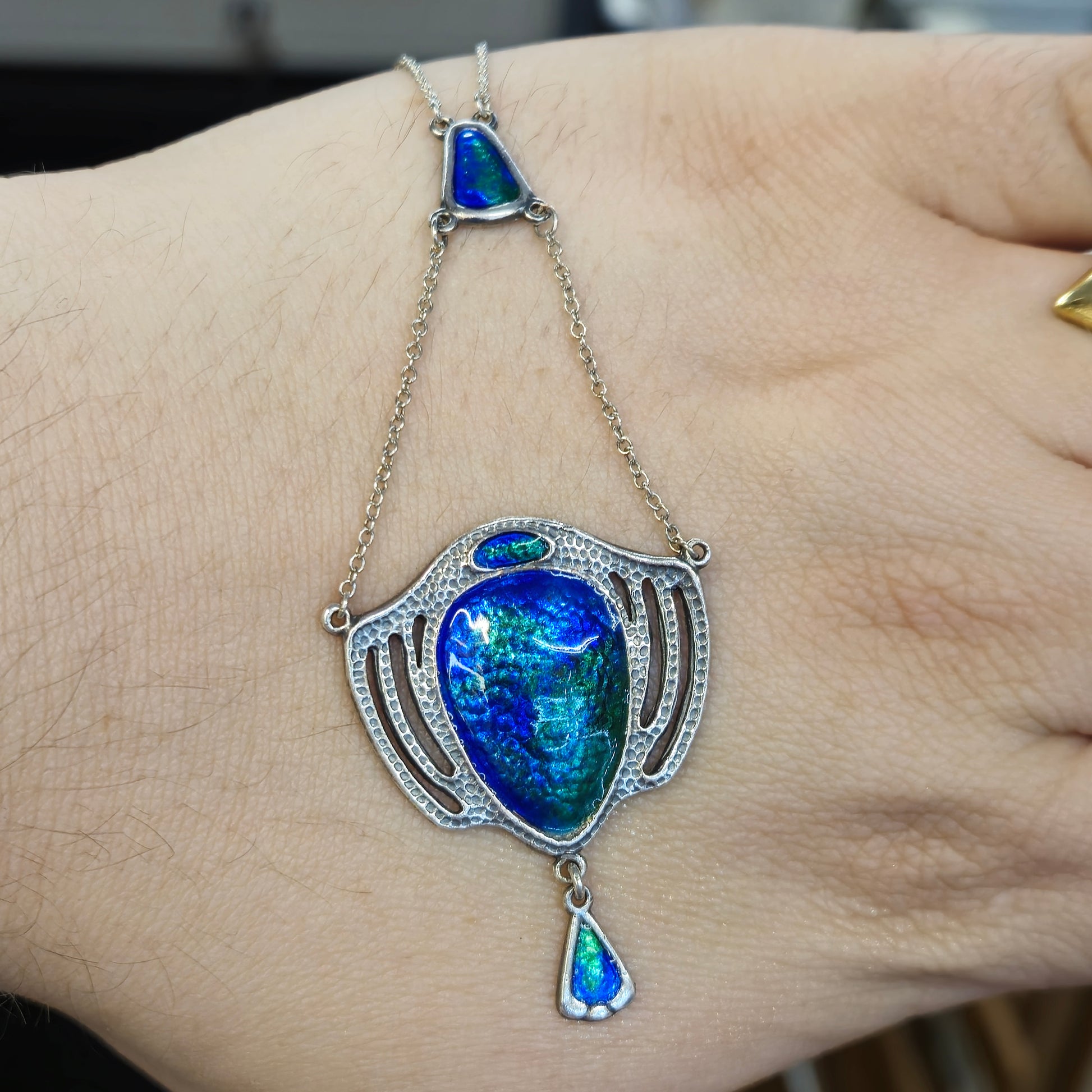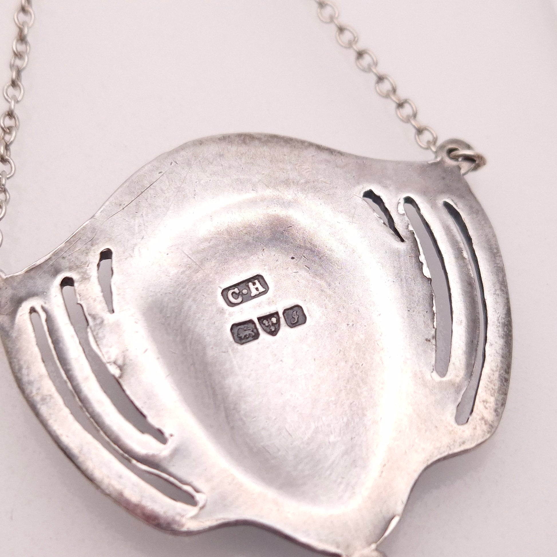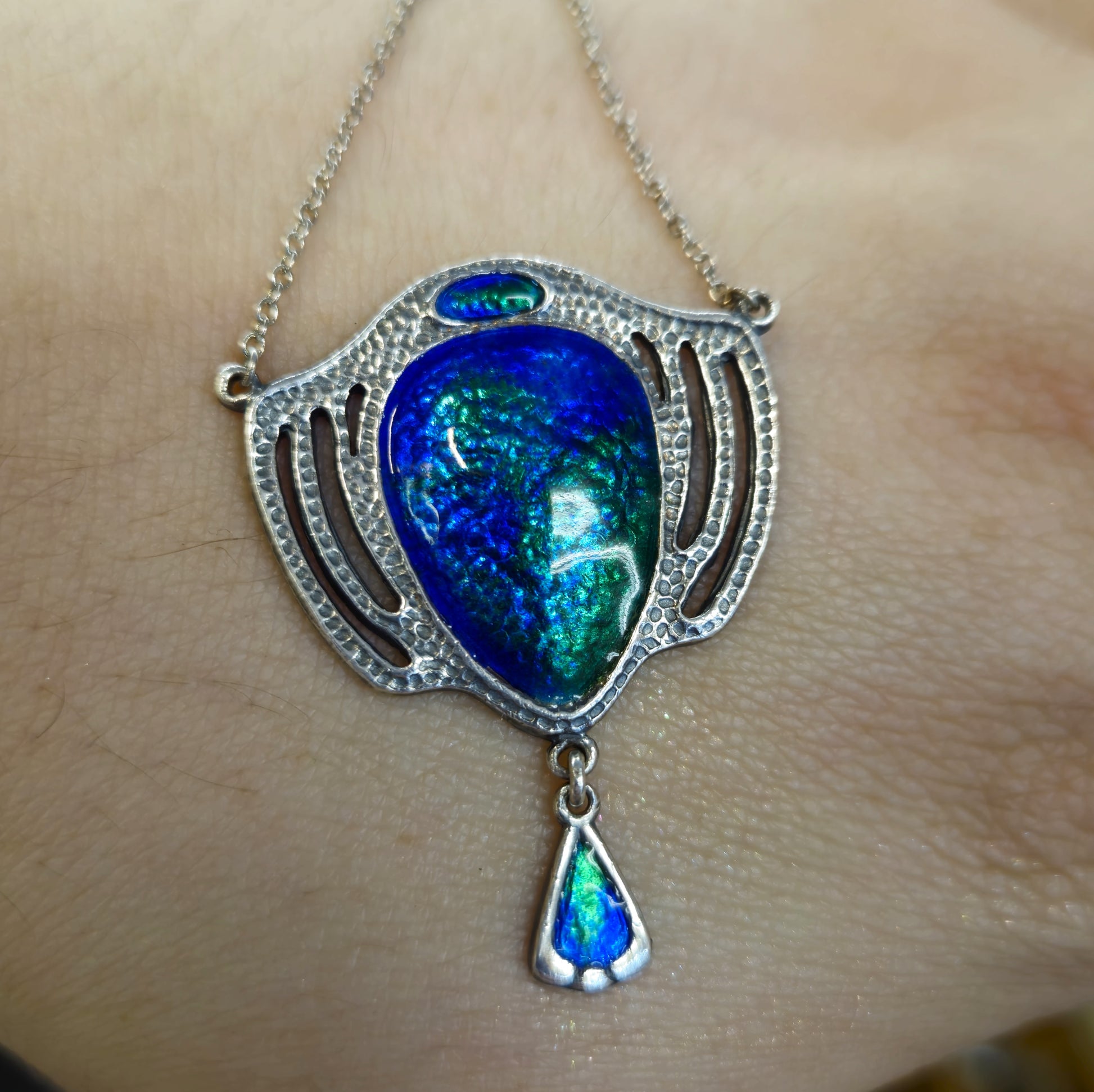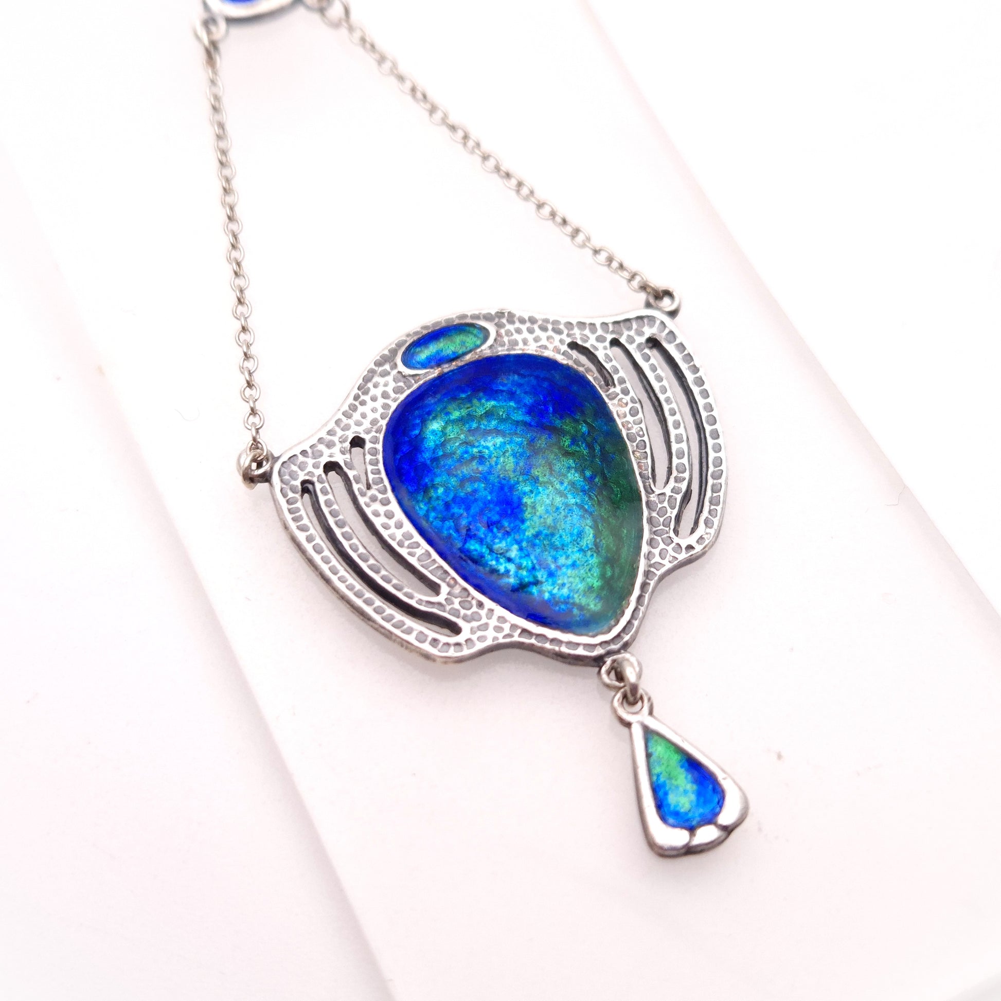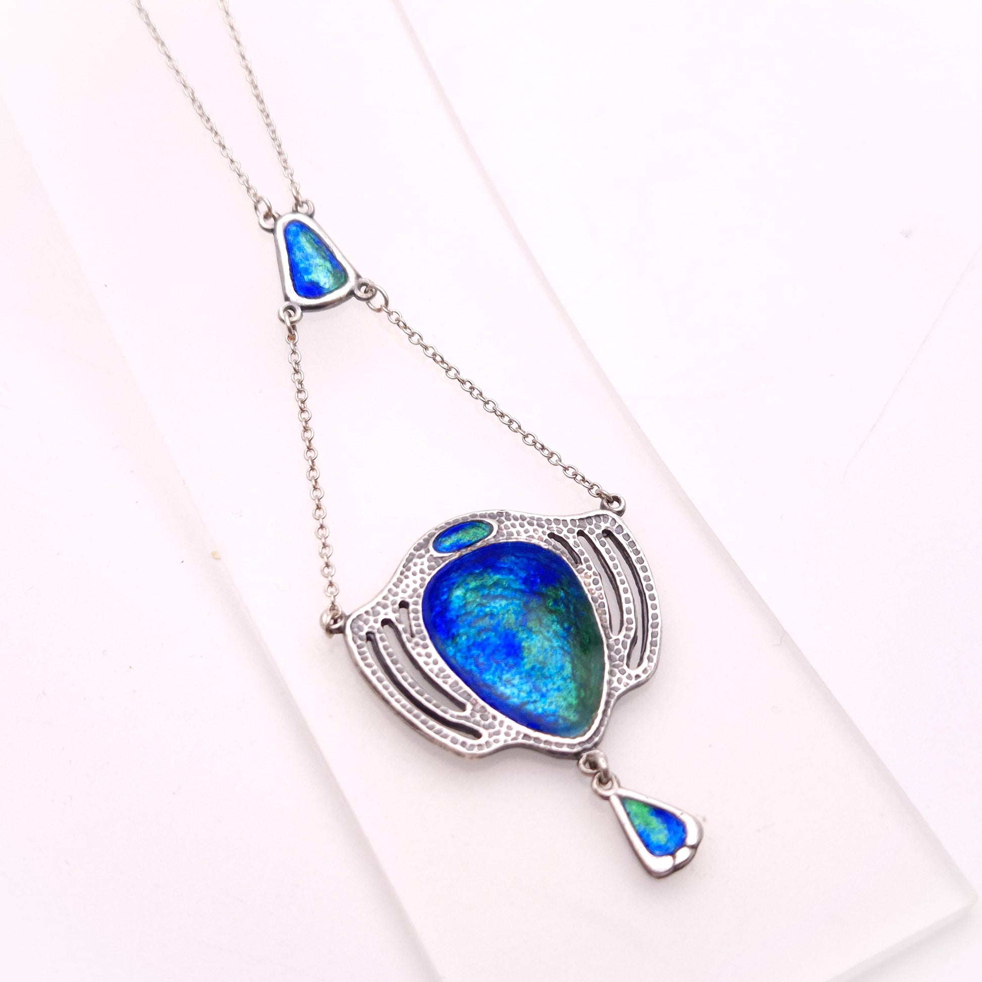 Presenting a captivating antique Sterling Silver necklace crafted by the esteemed Charles Horner in 1909. This exquisite piece showcases the artistry of the Art Nouveau era with its flowing lines and vibrant blue and green enamel detailing. The pendant features a central, organically shaped enamel panel, complemented by smaller enamel accents and delicate silverwork. A rare opportunity to own a genuine piece of early 20th-century design