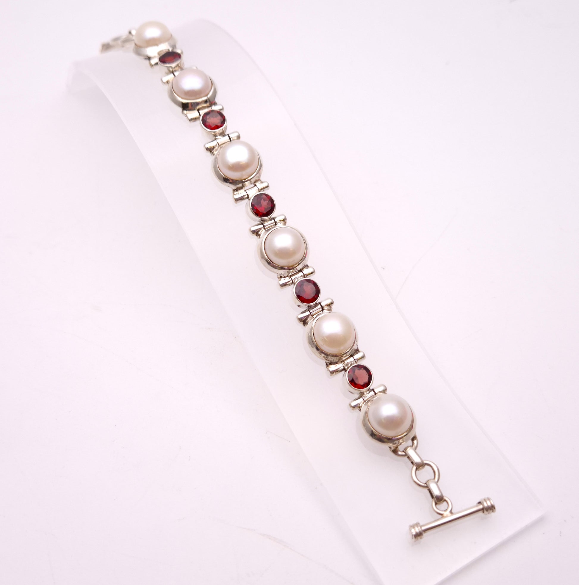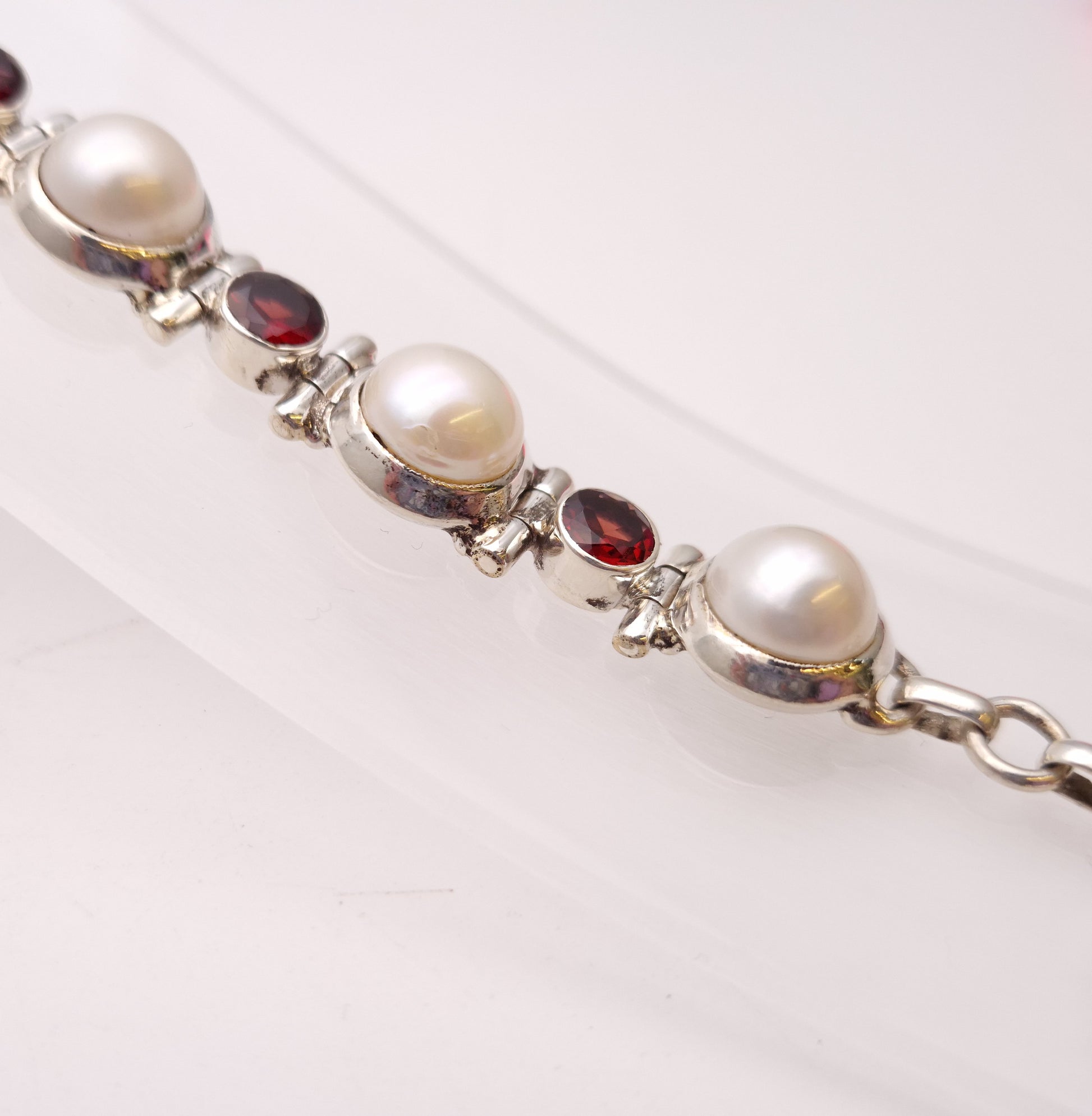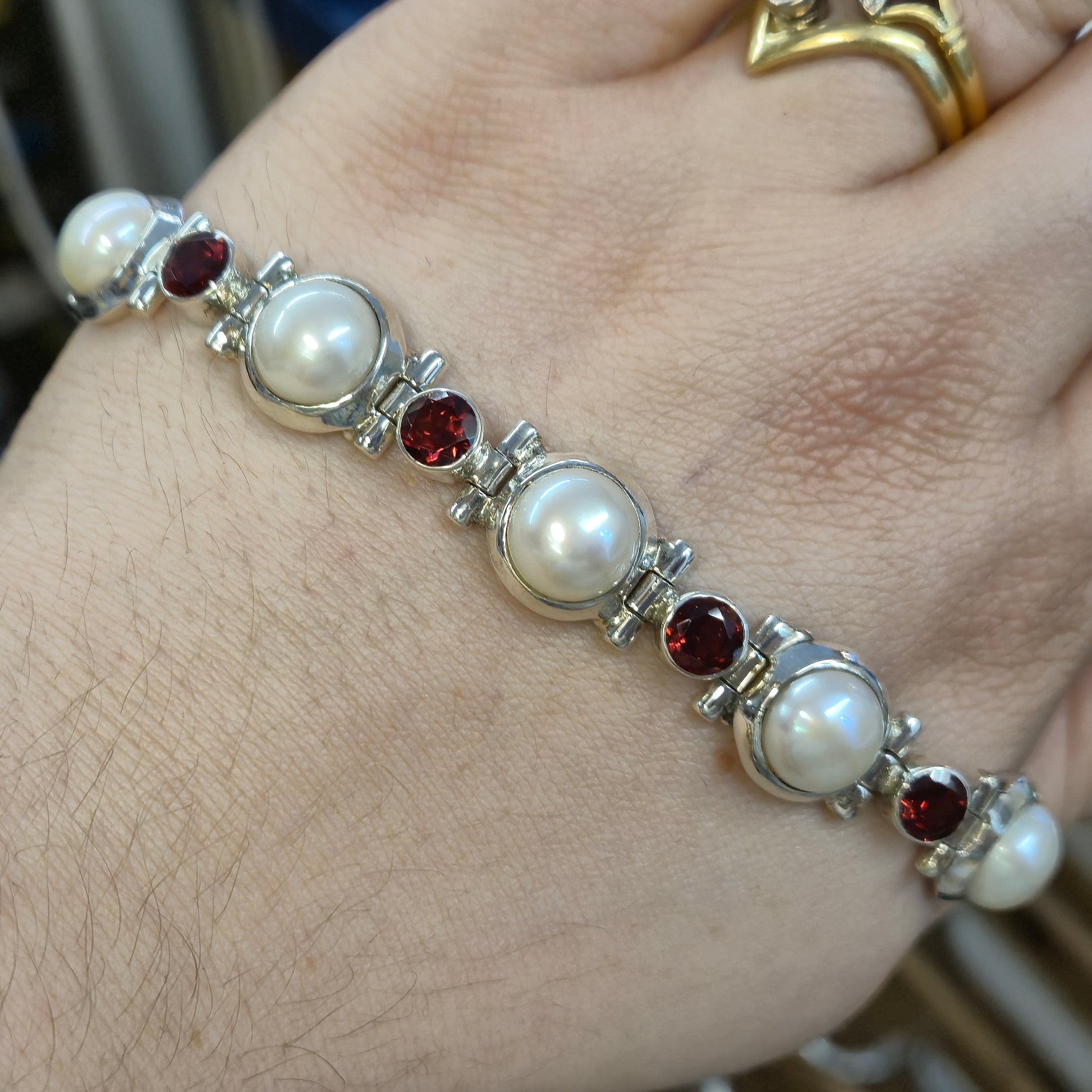 Crafted from high-quality, polished sterling silver, the bracelet features a series of chunky, rectangular links. Each link is meticulously set with either a luminous, creamy freshwater pearl or a dazzling, deep red natural garnet gemstone. The pearls offer a soft, iridescent glow, while the garnets provide a fiery burst of rich crimson, creating a striking and balanced contrast.
