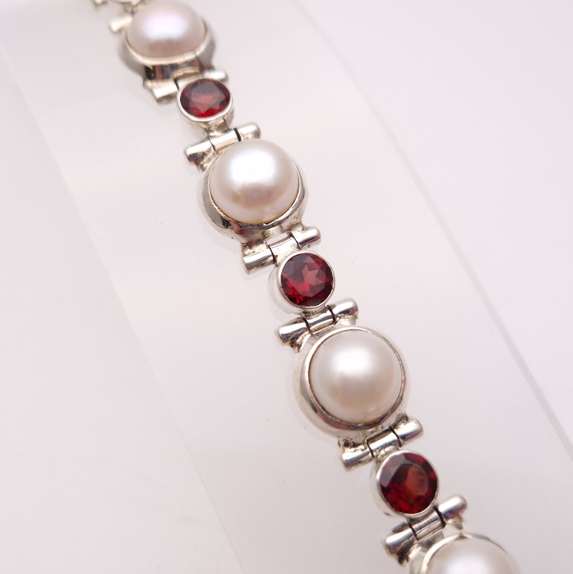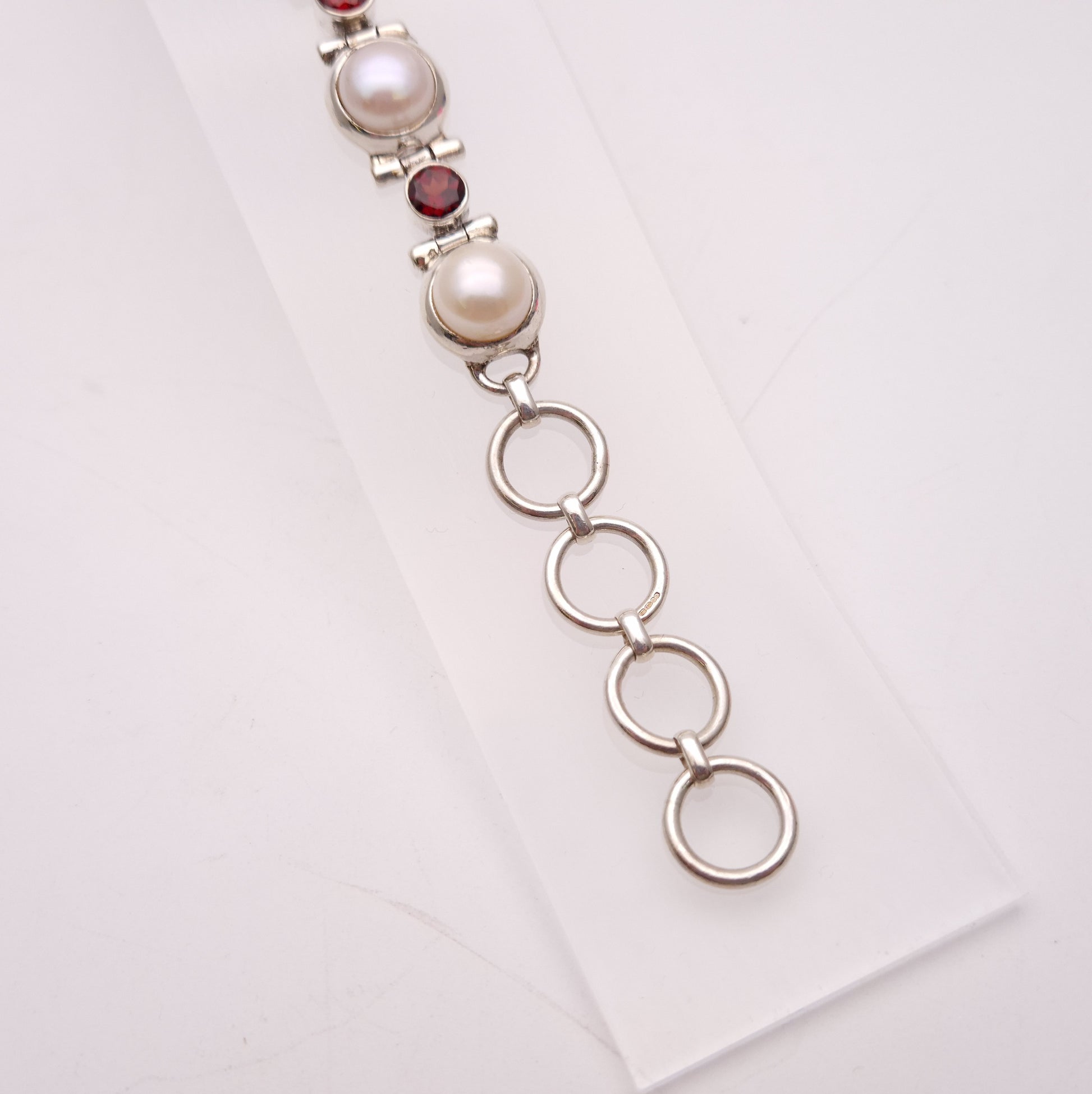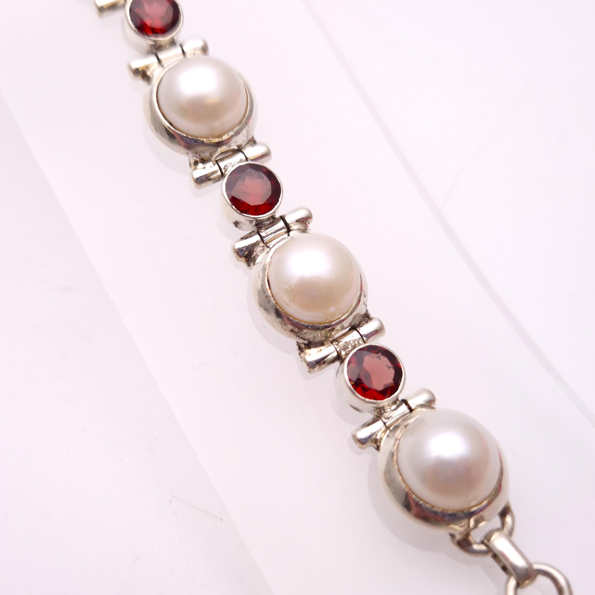 Crafted from high-quality, polished sterling silver, the bracelet features a series of chunky, rectangular links. Each link is meticulously set with either a luminous, creamy freshwater pearl or a dazzling, deep red natural garnet gemstone. The pearls offer a soft, iridescent glow, while the garnets provide a fiery burst of rich crimson, creating a striking and balanced contrast.