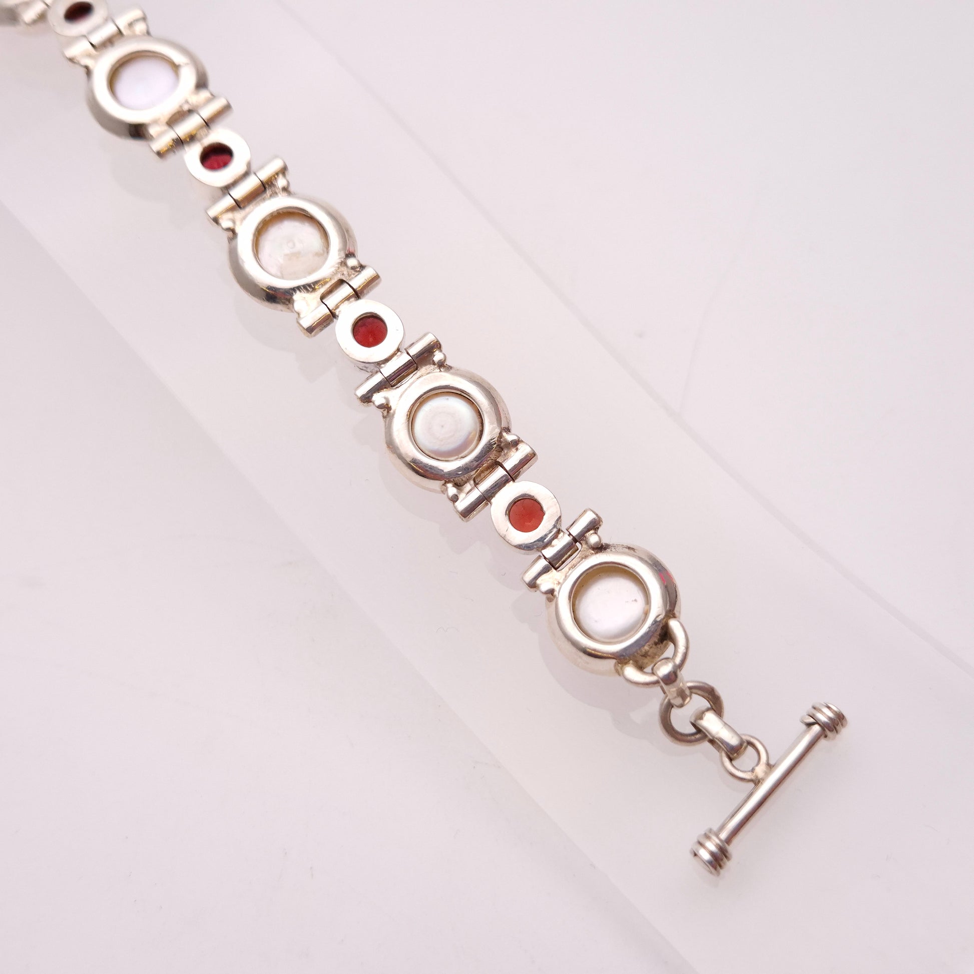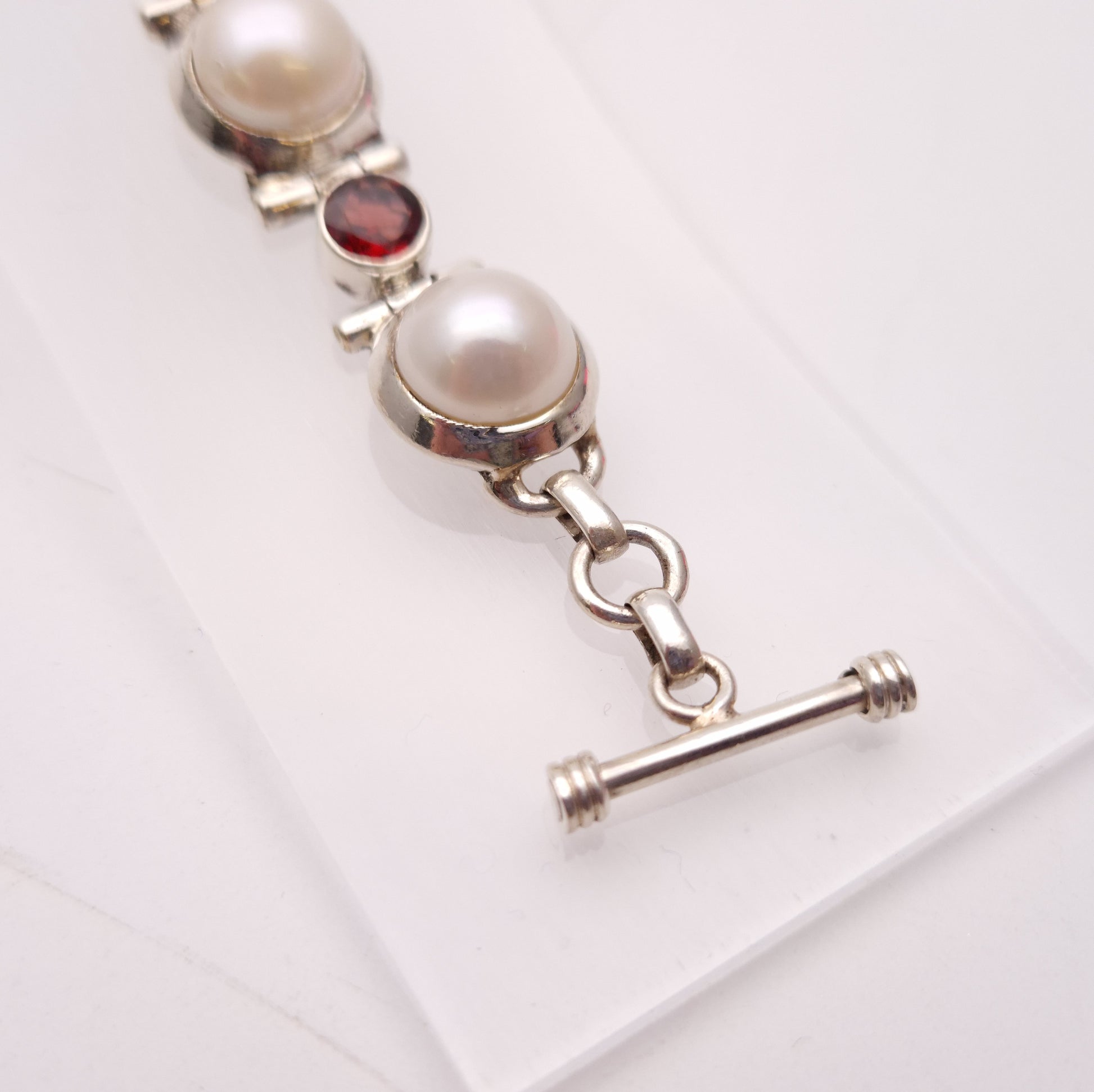 Sterling Silver Chunky Pearl and Garnet Set Link T-Bar Bracelet