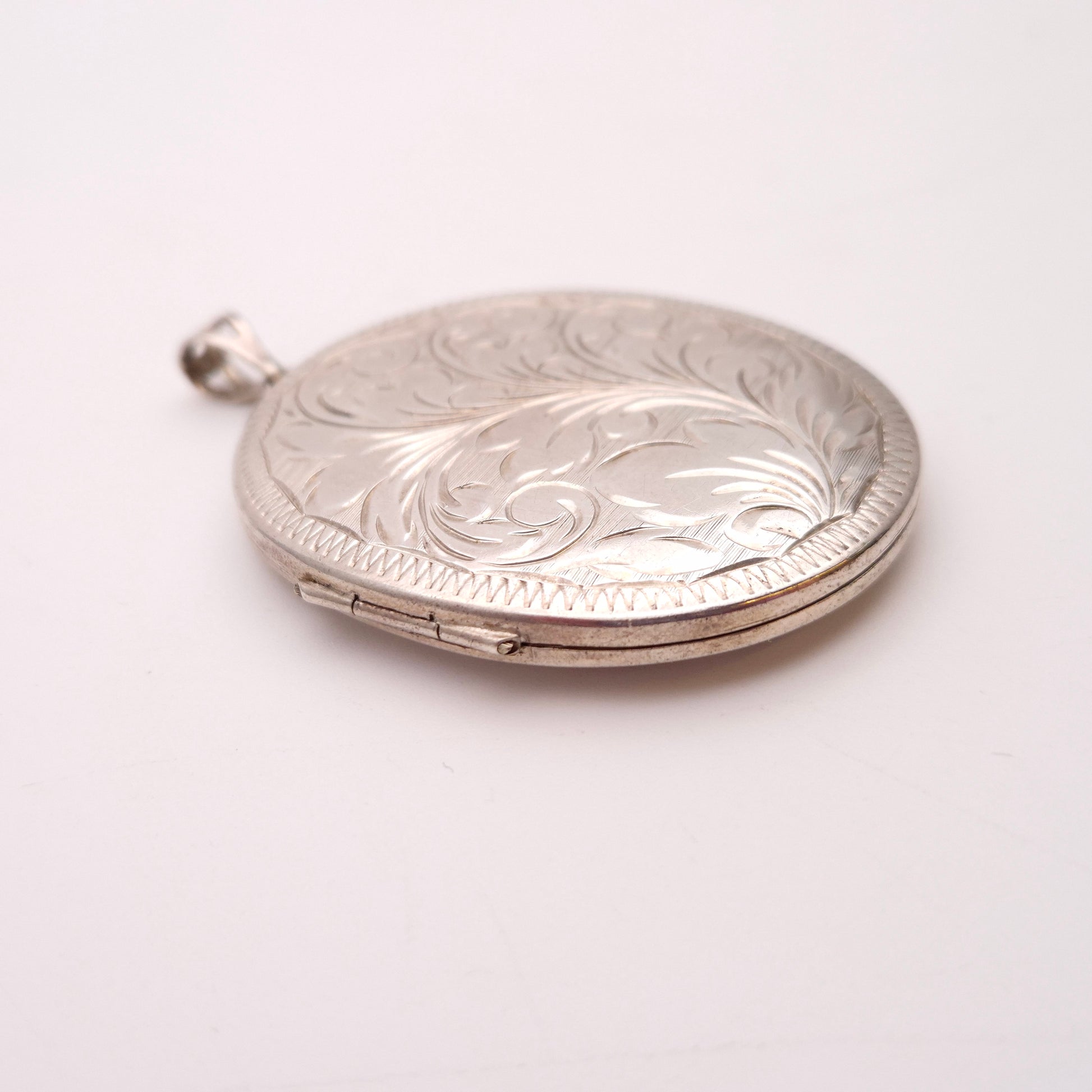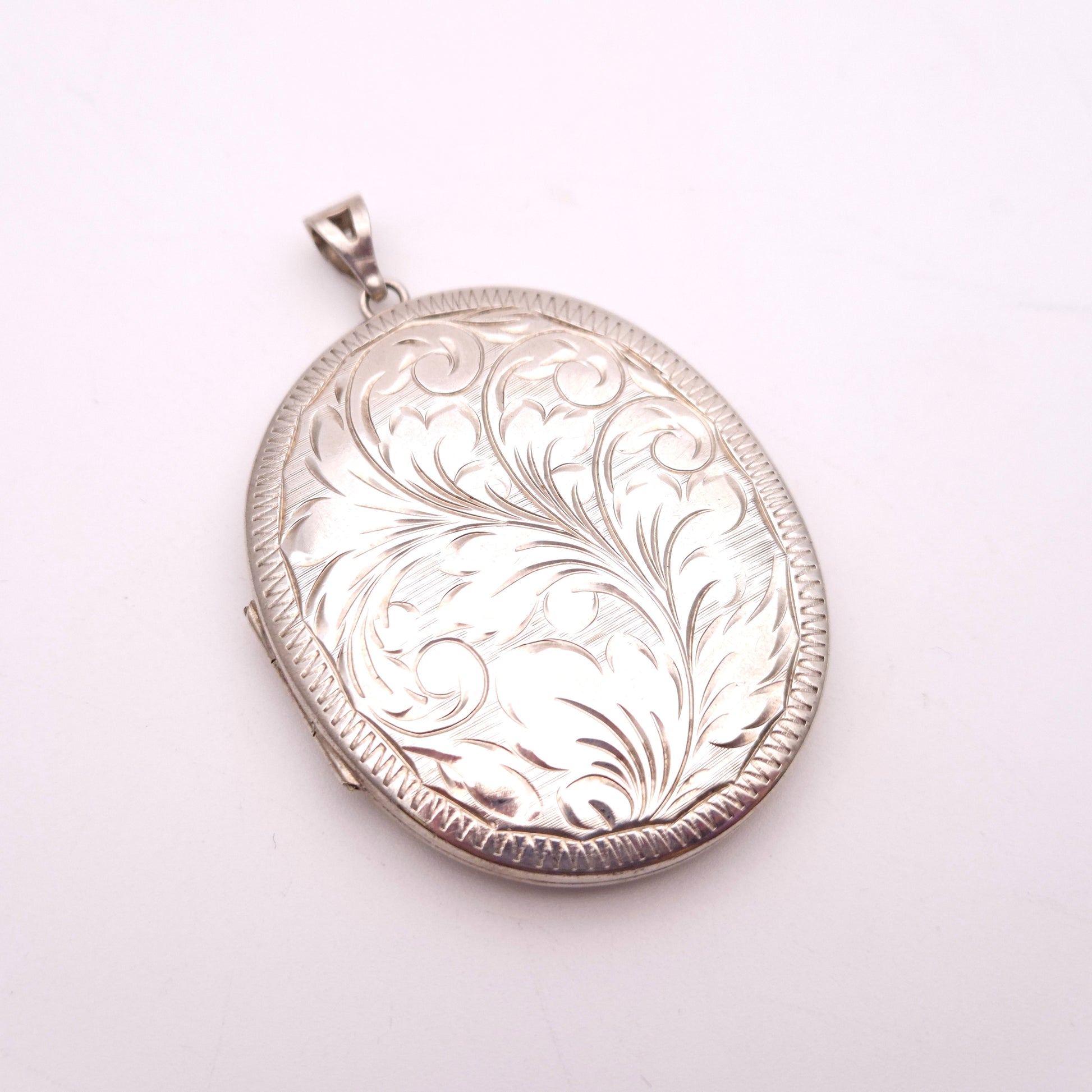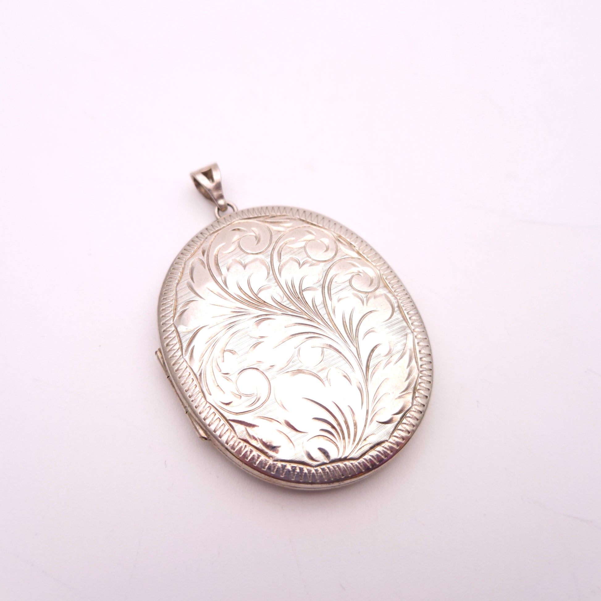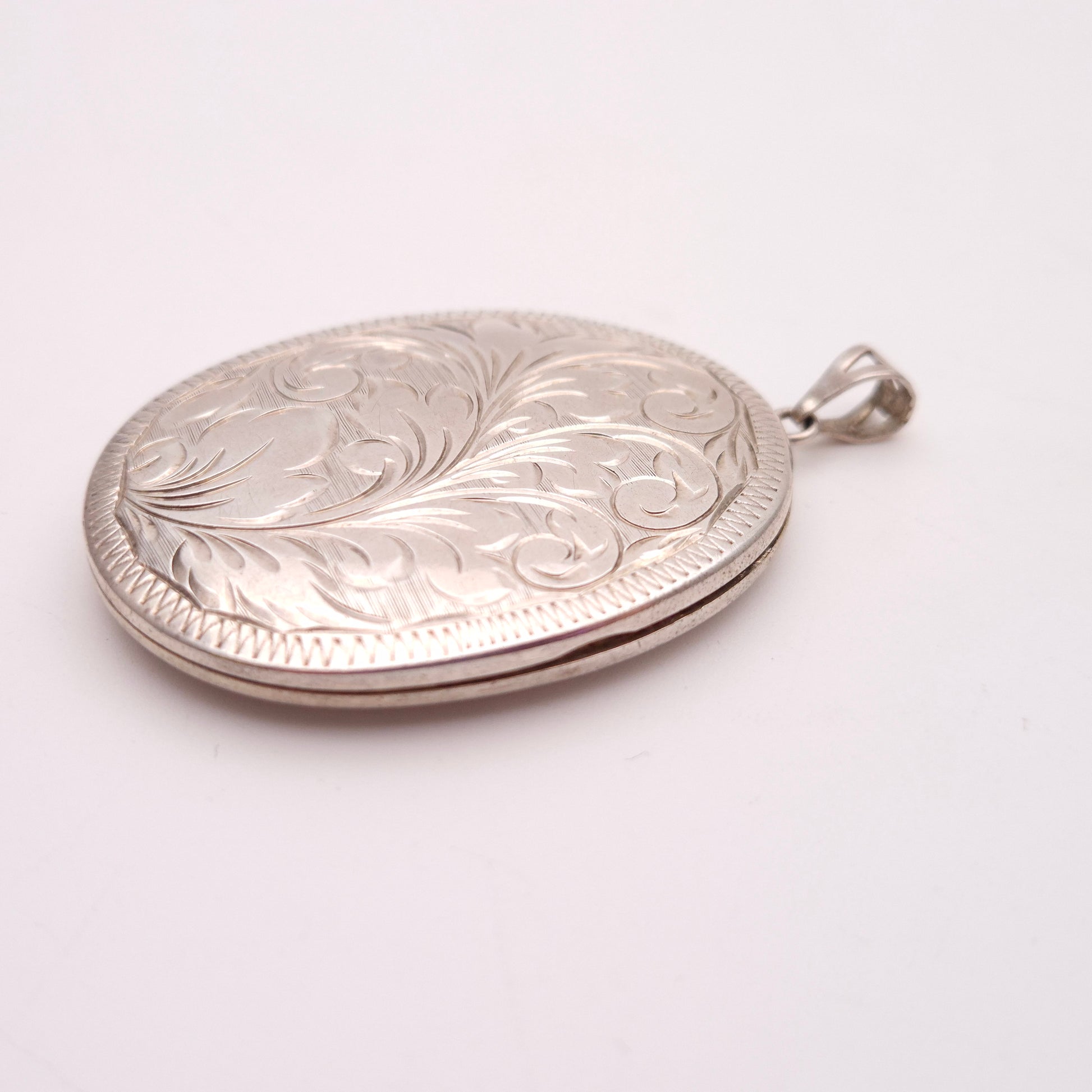 Crafted in gleaming sterling silver, this extra large oval locket showcases a meticulously engraved scrolling foliate pattern. The detailed design covers the surface, adding depth and visual interest. This substantial locket offers ample space inside for photos or mementos, making it a cherished keepsake.