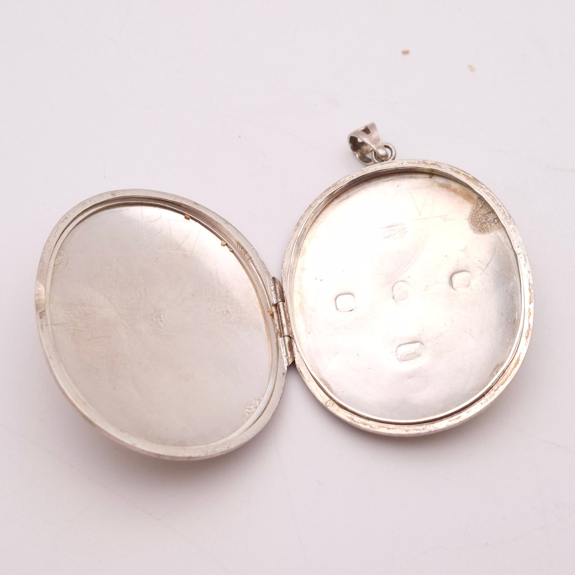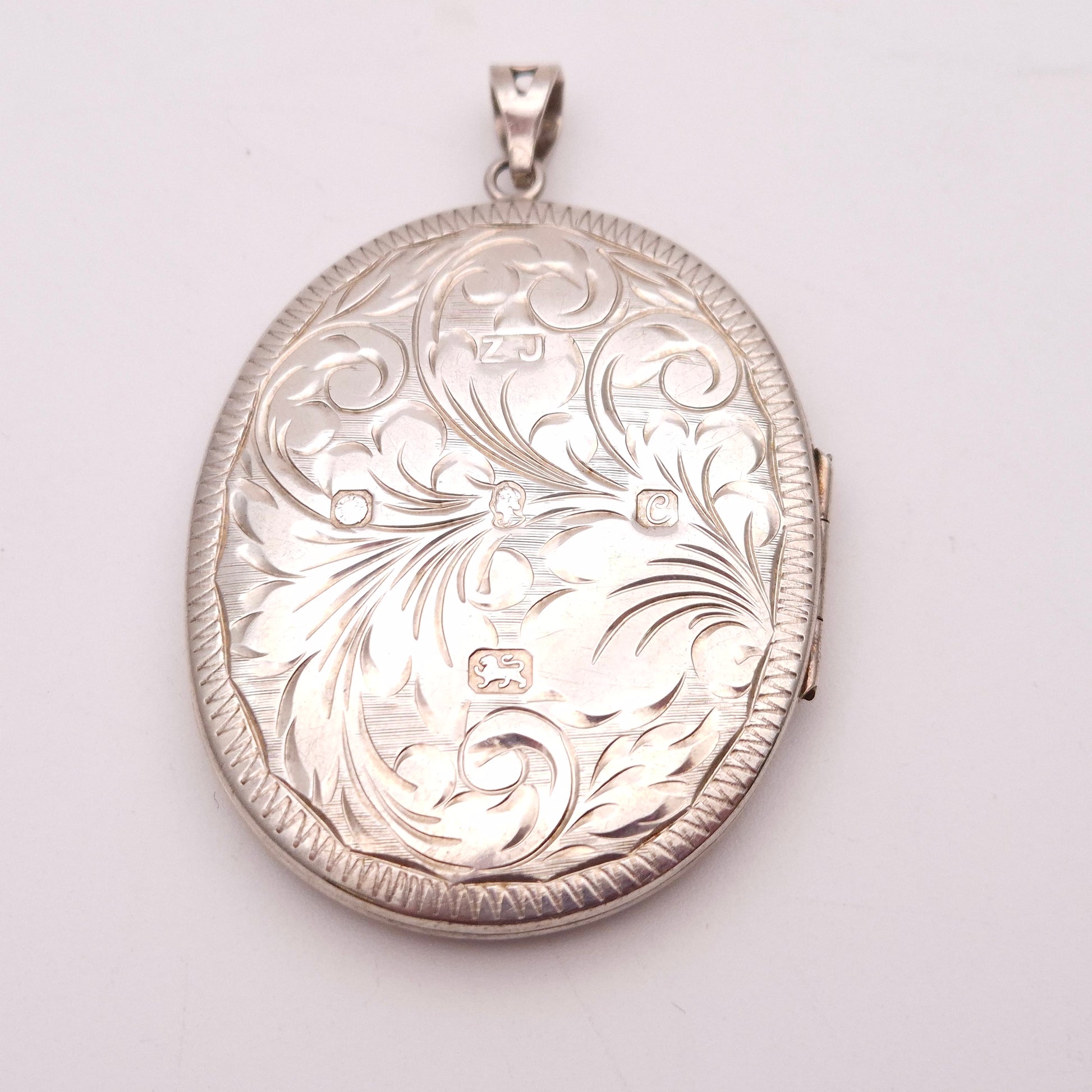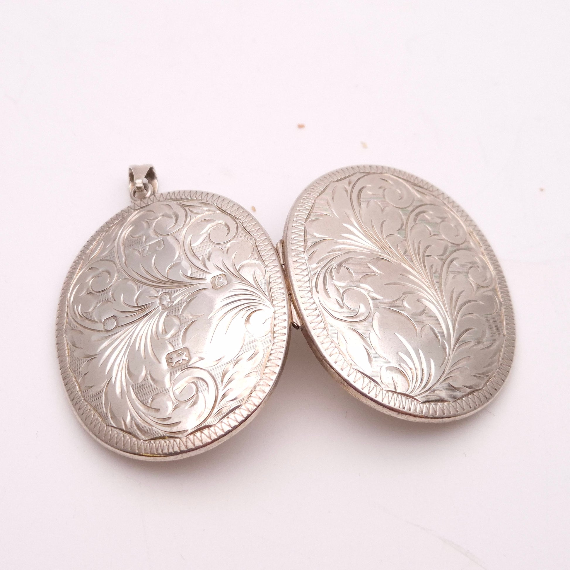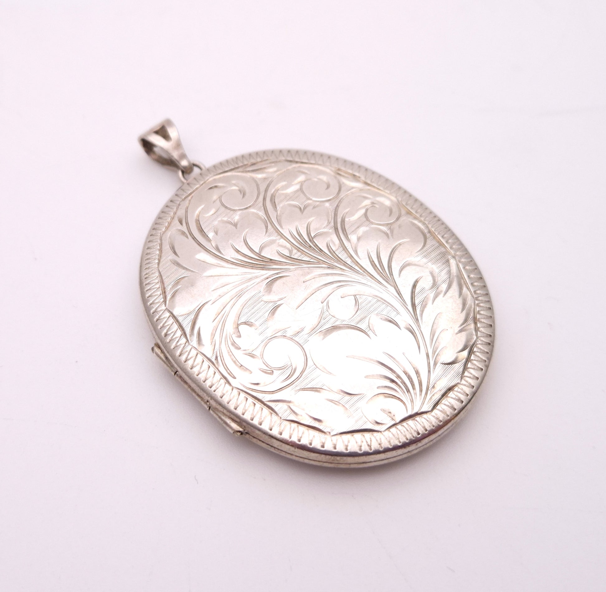 Crafted in gleaming sterling silver, this extra large oval locket showcases a meticulously engraved scrolling foliate pattern. The detailed design covers the surface, adding depth and visual interest. This substantial locket offers ample space inside for photos or mementos, making it a cherished keepsake.