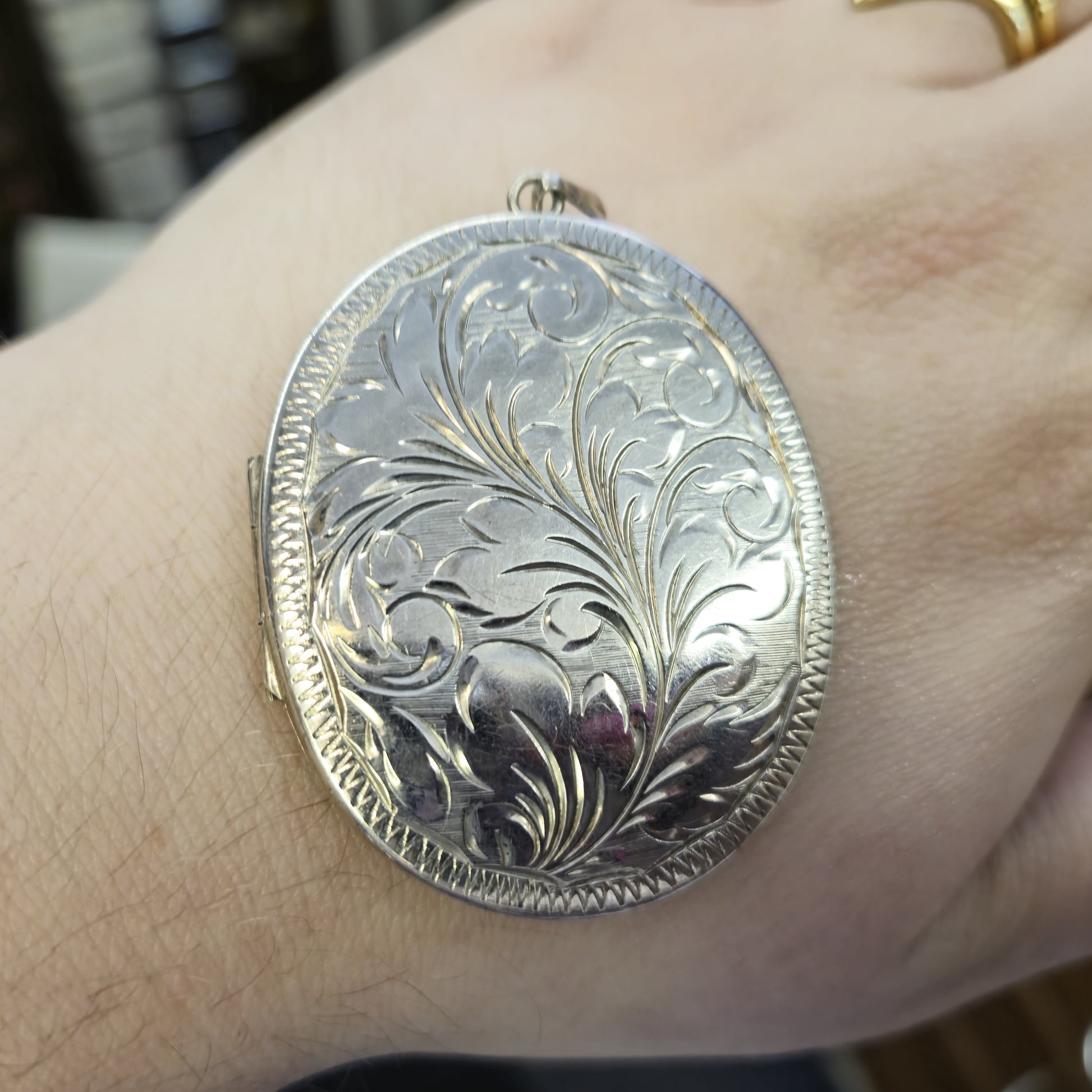 Sterling Silver Extra Large Engraved Scrolling Patterned Oval Locket