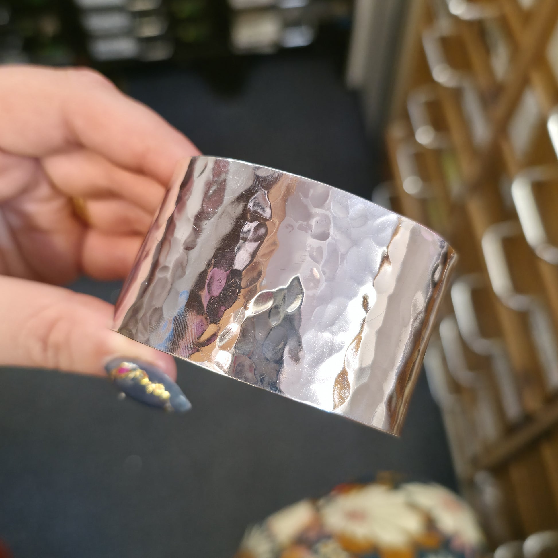 The standout character of this design comes from its stunning hammered finish. The surface has been meticulously hand-worked to create a series of soft, organic indentations that play beautifully with the light. Unlike a smooth high-polish finish, this textured "dimpled" effect provides a multifaceted shimmer, giving the silver a liquid-like, radiant quality that shifts with every movement of your wrist.