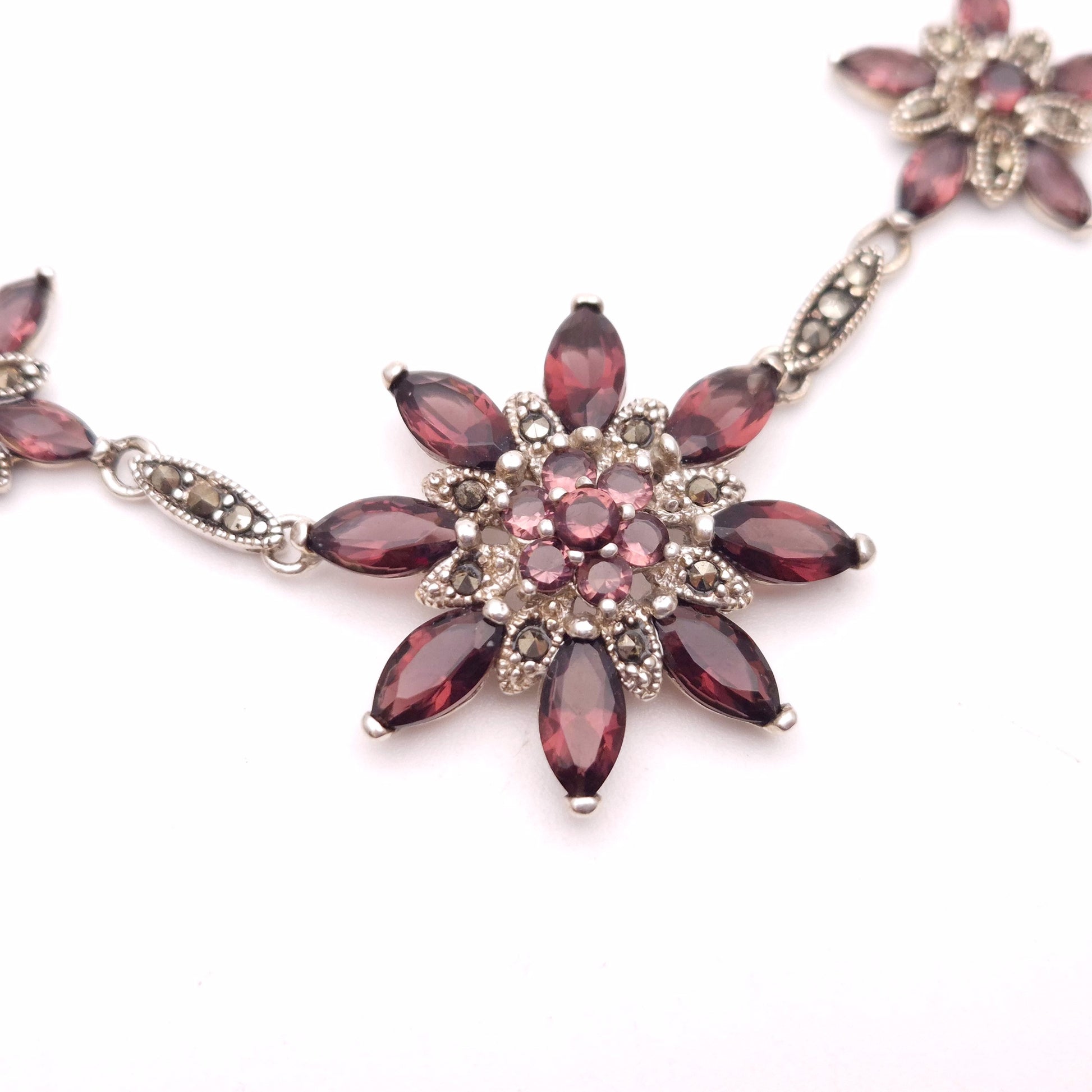 Adorn yourself with the enchanting beauty of this sterling silver necklace, a true testament to vintage-inspired elegance. This captivating piece features a stunning array of garnets and marcasite, meticulously arranged in delicate floral motifs along a graceful chain.