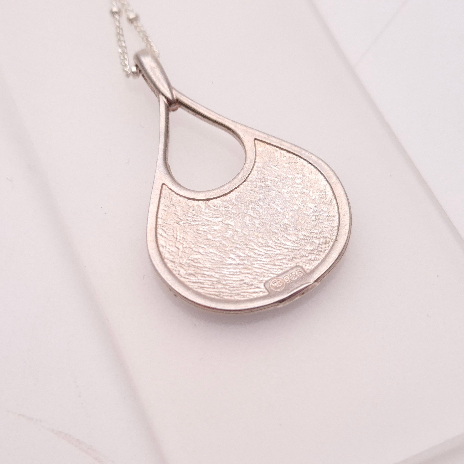 Embrace the warm glow and captivating beauty of natural amber hues with this exquisite sterling silver necklace. This unique piece features a stunning teardrop-shaped pendant, showcasing rich golden and amber-toned enamel that evokes the warmth of a sunset or the depth of polished amber.