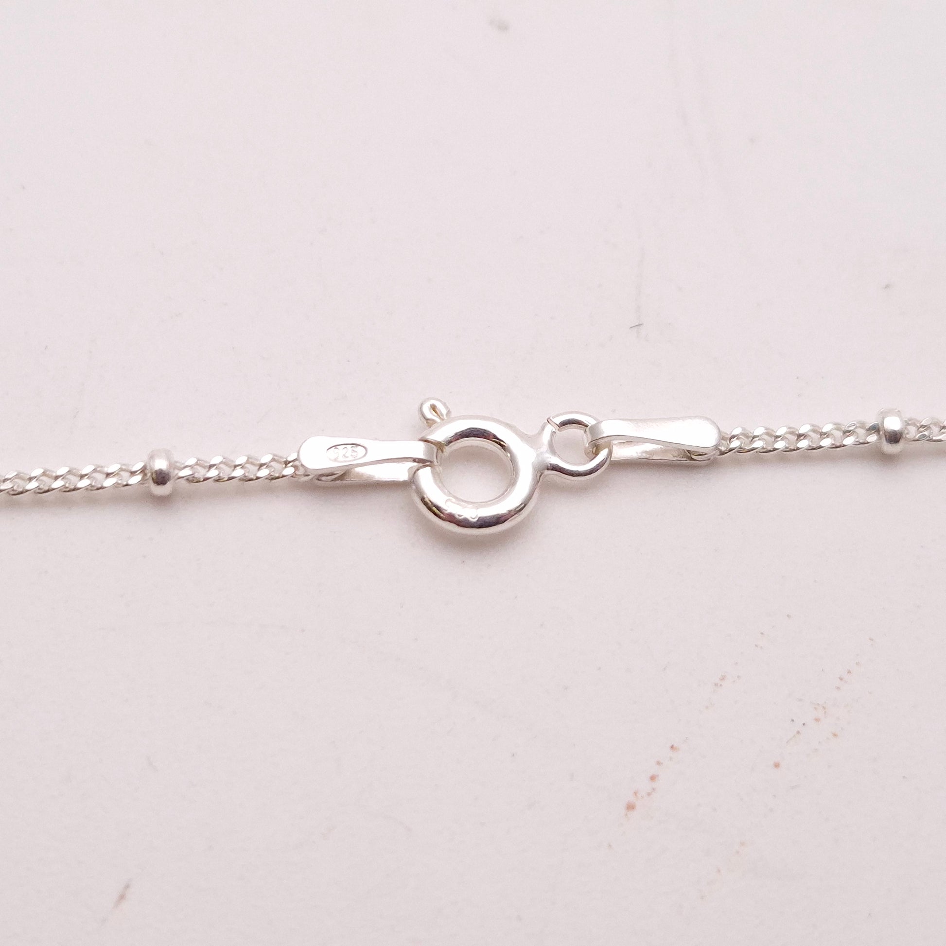 The pendant is gracefully suspended from a delicate yet sturdy sterling silver chain, which complements its elegant design. The chain is typically a beaded style, finished with a secure clasp, ensuring comfortable and reliable wear.