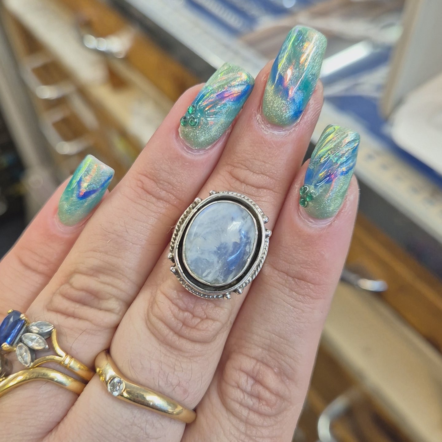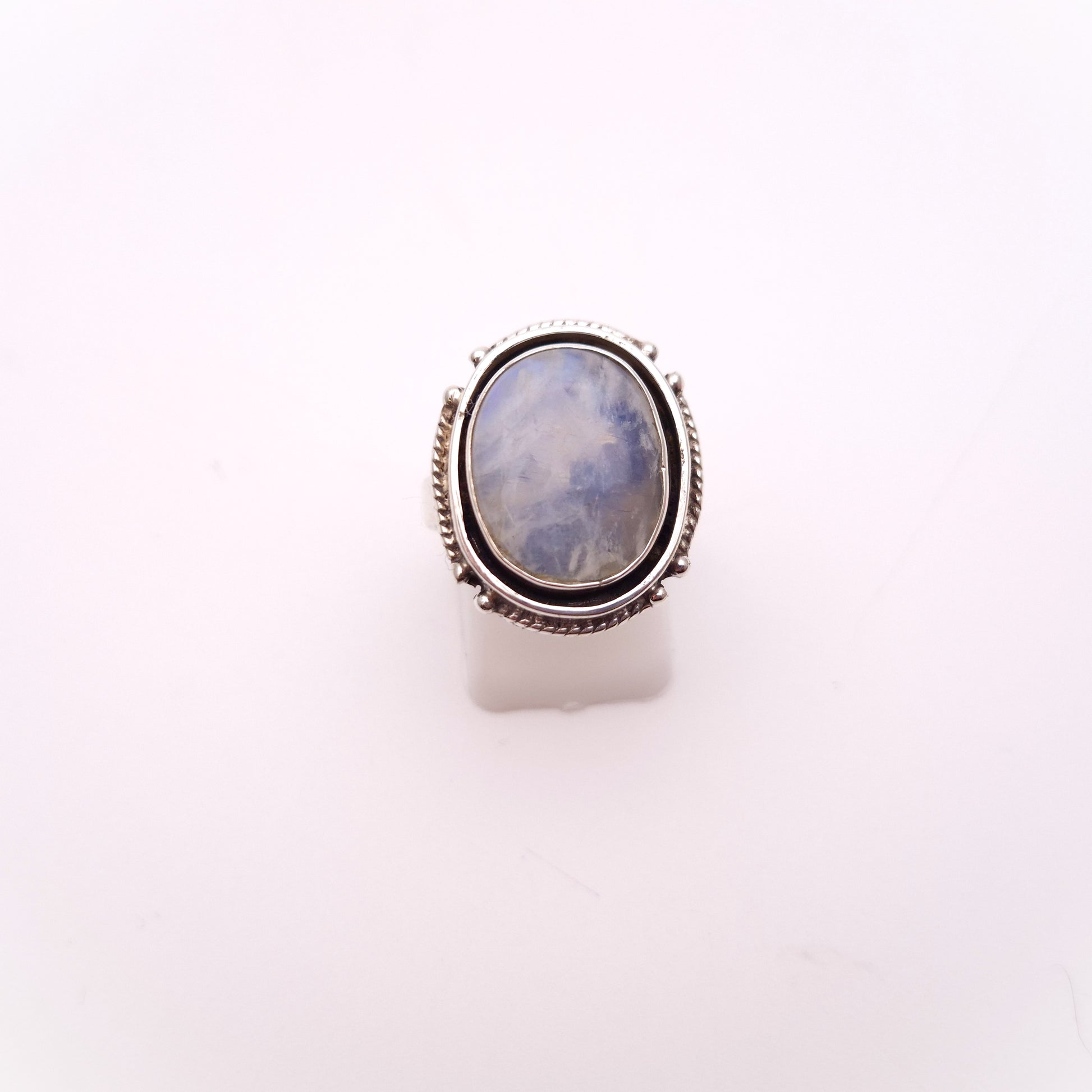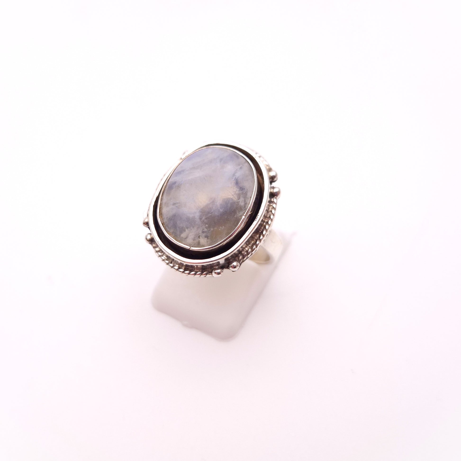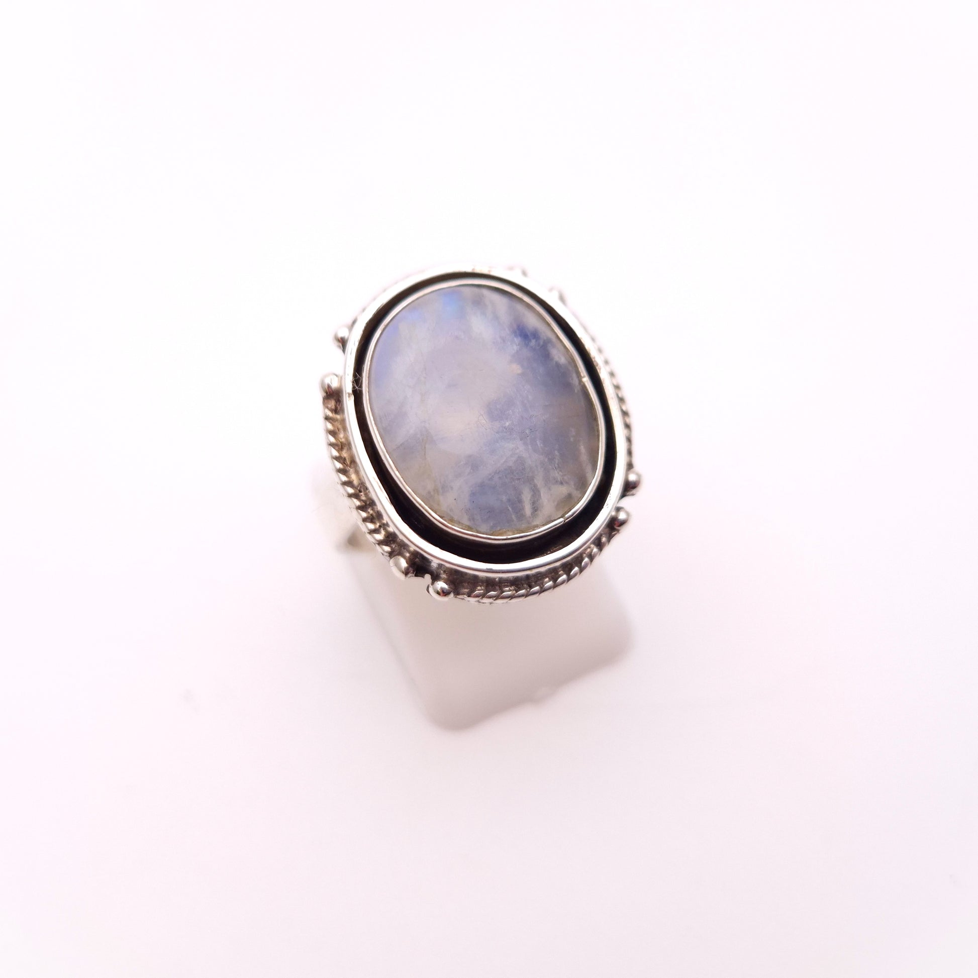 This bold and striking ring features a mesmerizing large oval cabochon of Labradorite set dramatically in substantial sterling silver. Labradorite is famed for its optical phenomenon known as labradorescence, this particular stone in this ring displays a beautiful, silvery-blue sheen that is both ethereal and eye-catching.