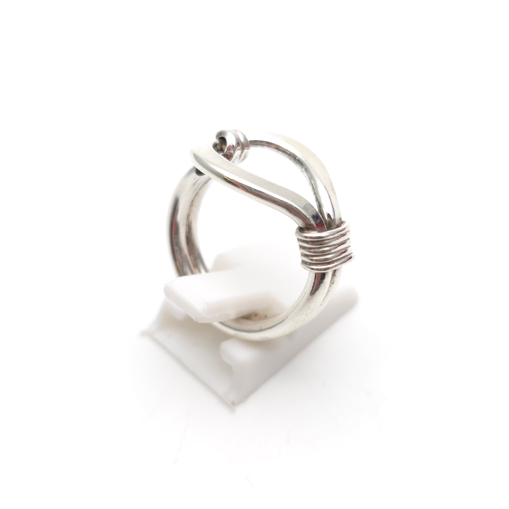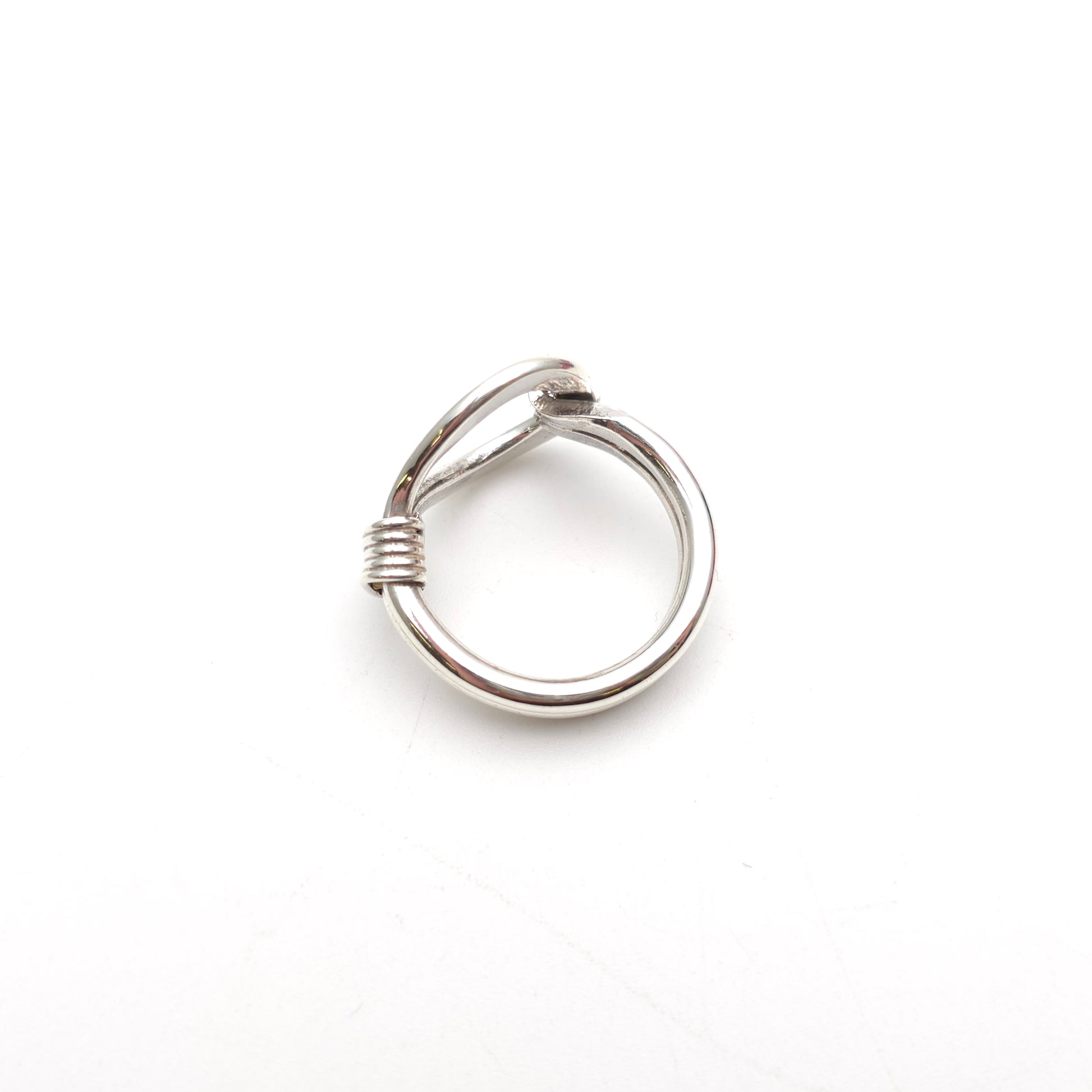 Make a bold, contemporary statement with this unique sterling silver chunky ring. Featuring a bold sculptural design, this piece centres on a stylized hook or loop knot motif. The fluid, polished silver curves wrap around the finger, culminating in a decorative "coiled wire" detail that adds a touch of industrial-chic texture to the overall aesthetic.
