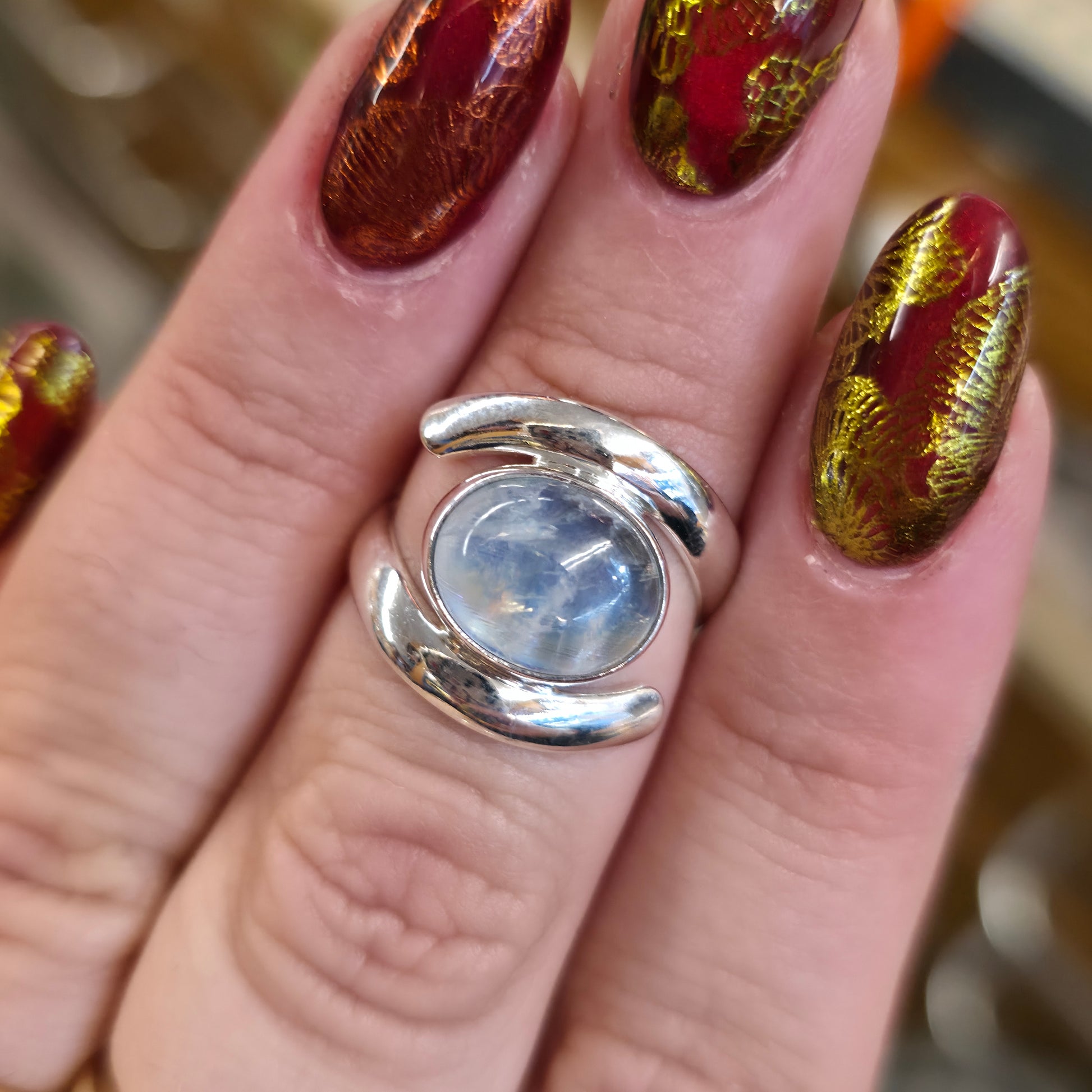 Capture the ethereal glow of the night sky with this captivating sterling silver modern statement ring. The centrepiece features a high-domed, oval moonstone cabochon, celebrated for its enchanting adularescence—a ghostly blue shimmer that dances across the surface as it catches the light.