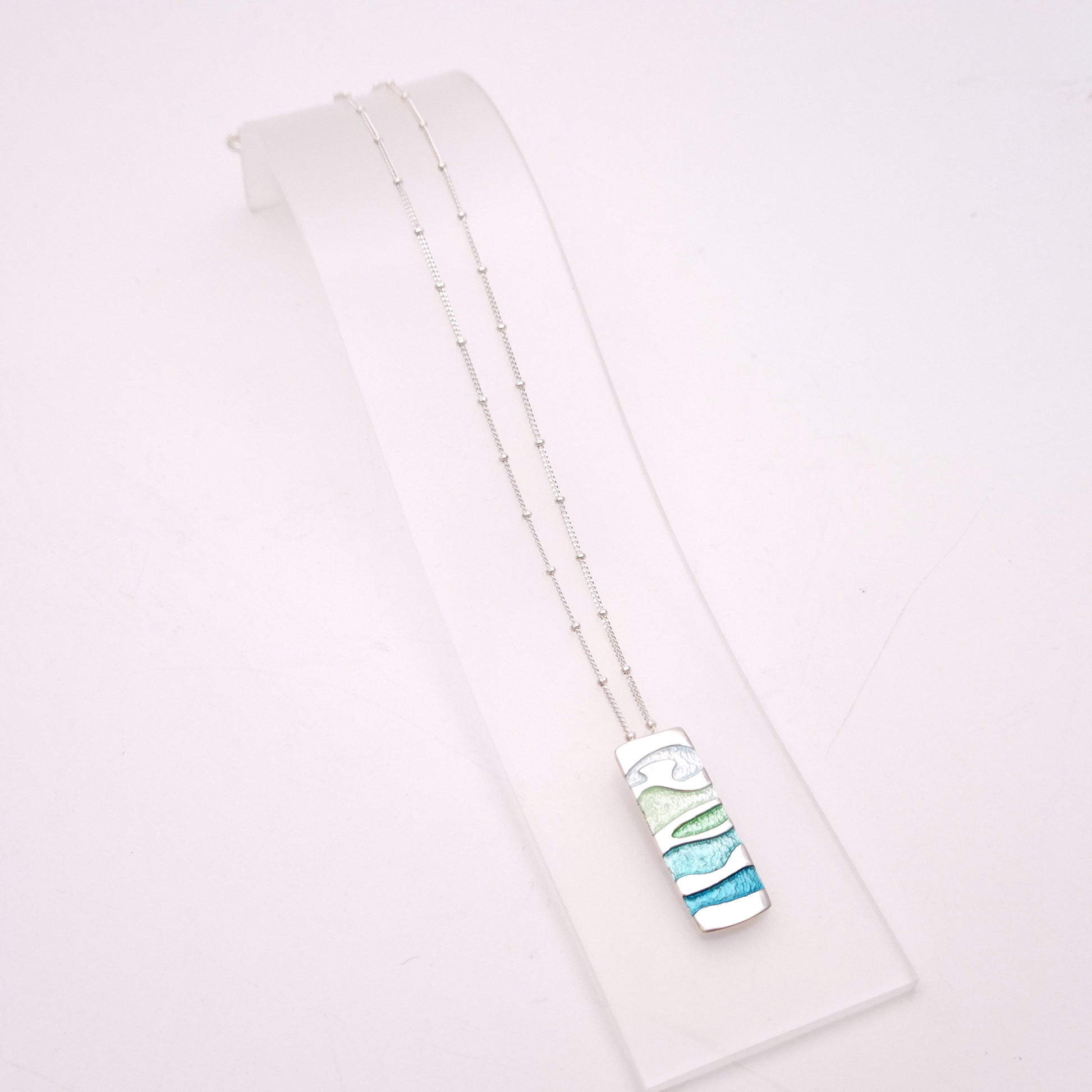 The focal point of this necklace is a sleek, rectangular pendant crafted from polished sterling silver. The surface of the pendant is exquisitely inlaid with a vibrant show of enamel, showcasing a harmonious blend of various shades of blue and green. The enamel is meticulously applied to create abstract, wave-like patterns, giving the pendant a unique depth and fluidity that catches the eye. The cool lustre of the sterling silver frame beautifully highlights the rich colours of the enamel.