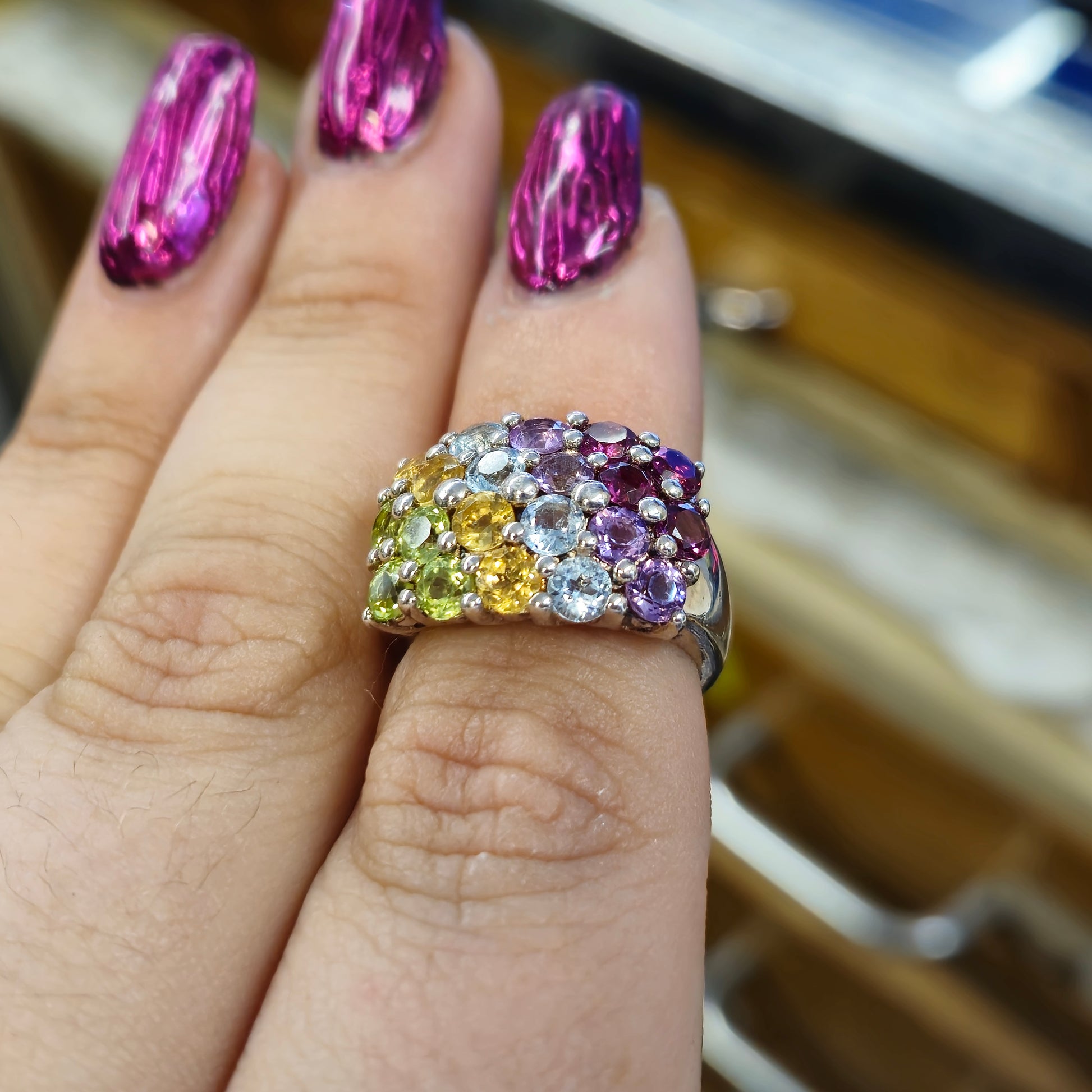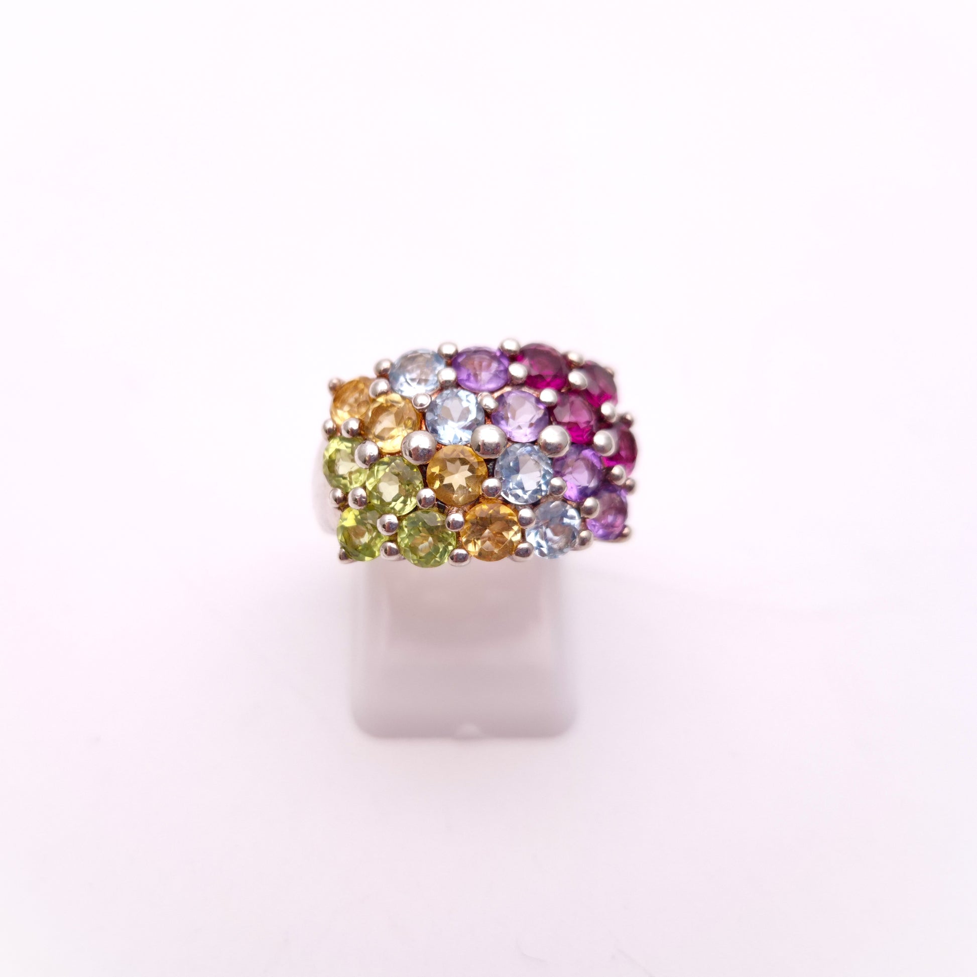 Crafted in gleaming sterling silver, this statement ring features a bold block design densely set with multiple vibrant gemstones, varying through garnet , amethyst , topaz, peridot and citrine. Each gemstone showcases its unique hue, creating a captivating mosaic of colour. This ring is a wonderful way to add a touch of playful elegance and individuality to any look.