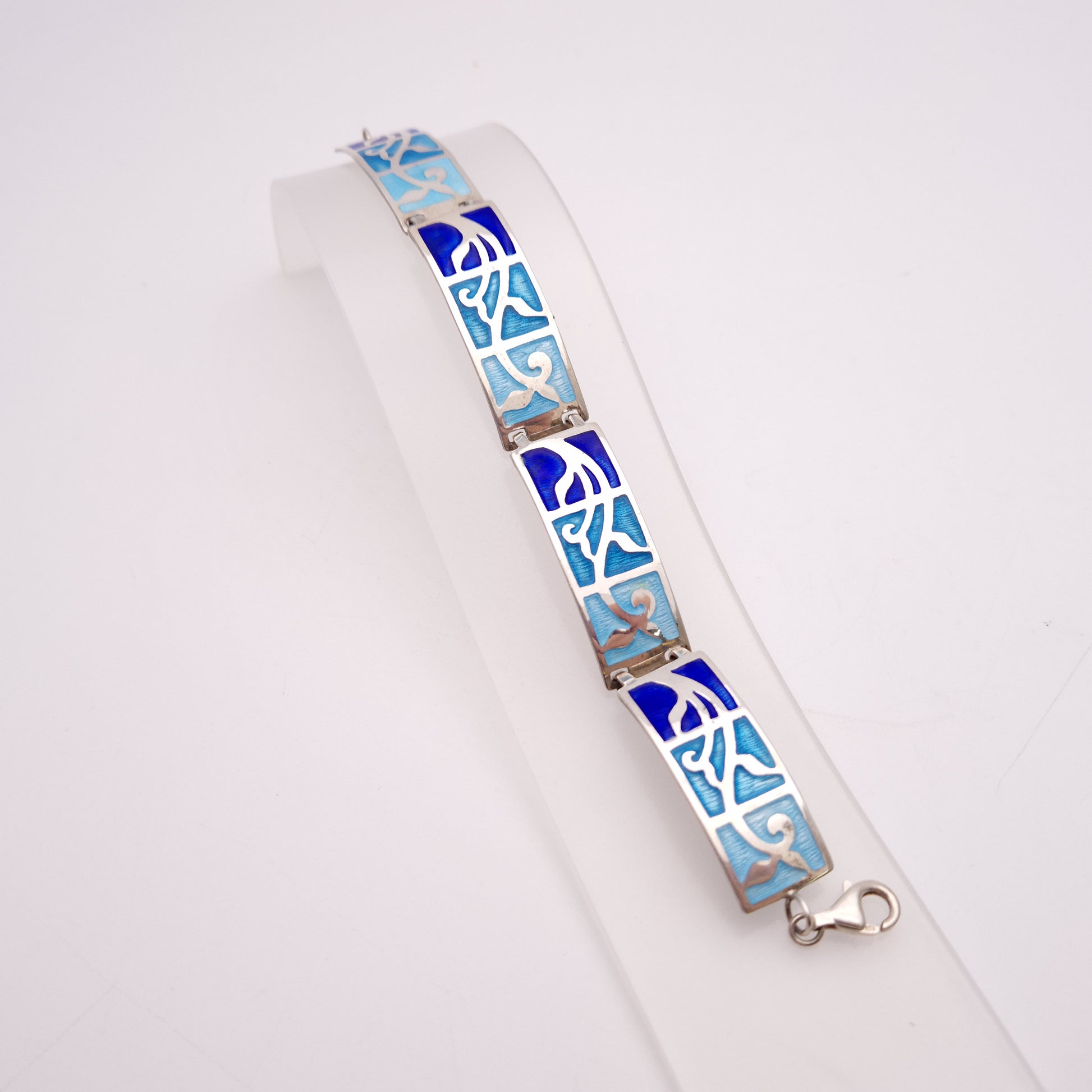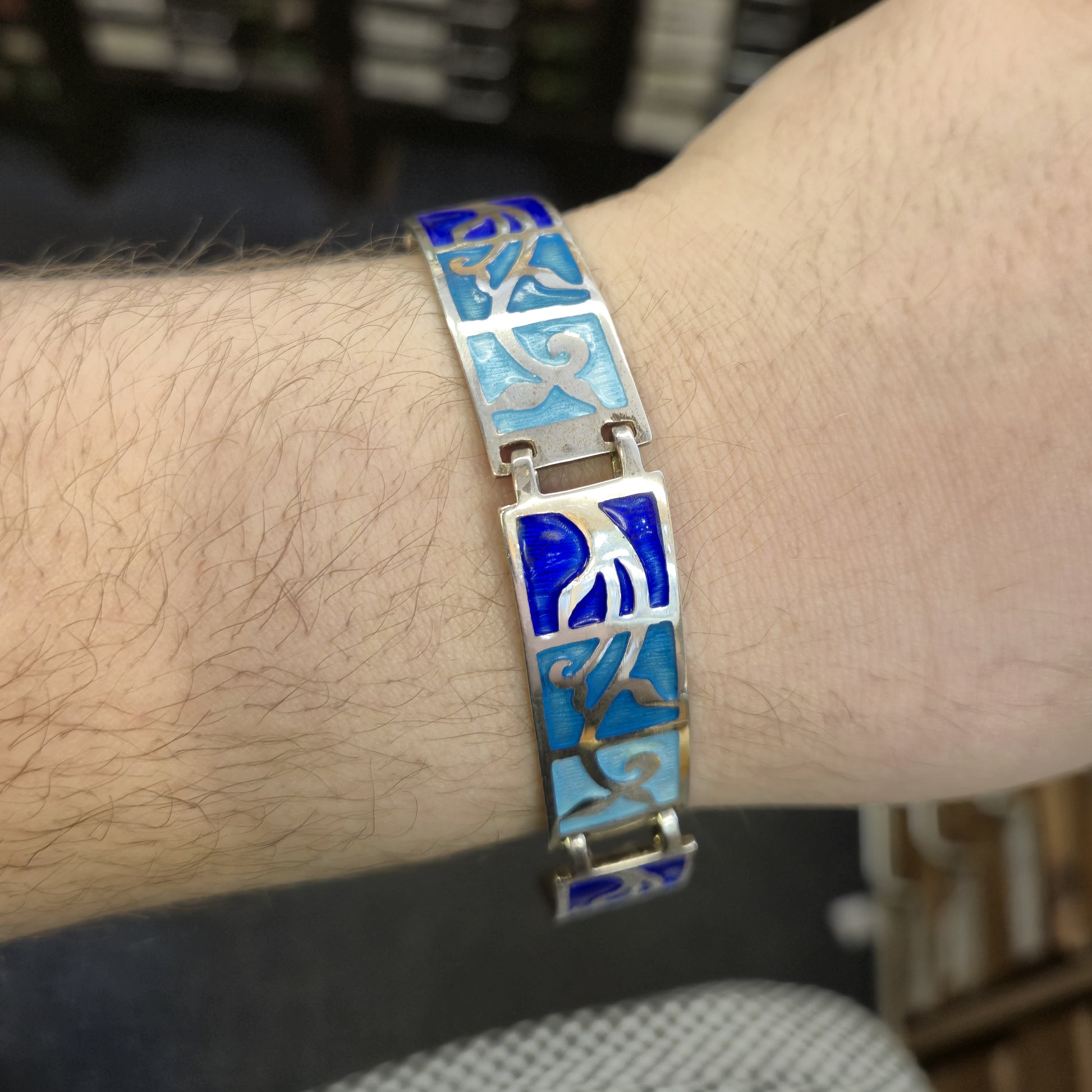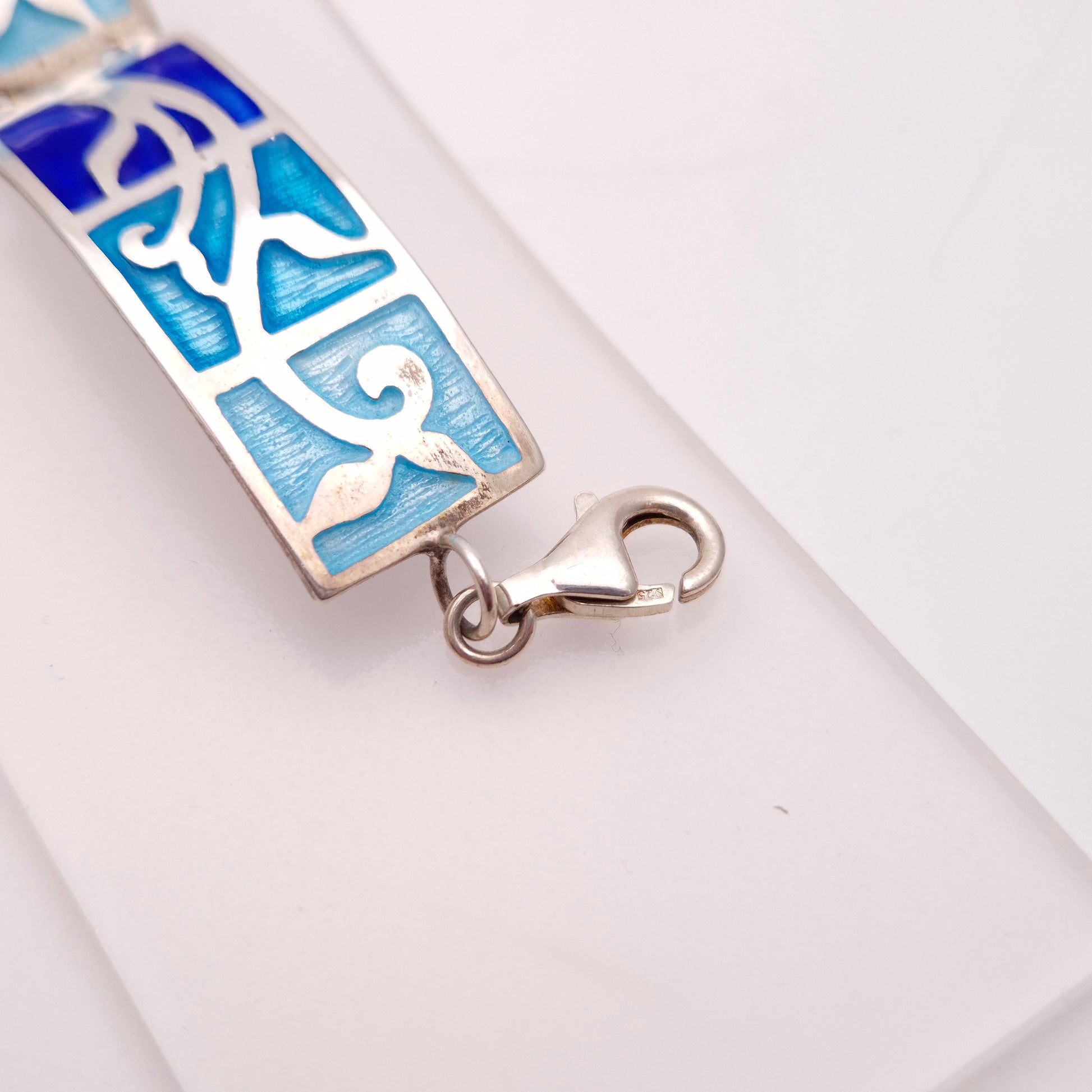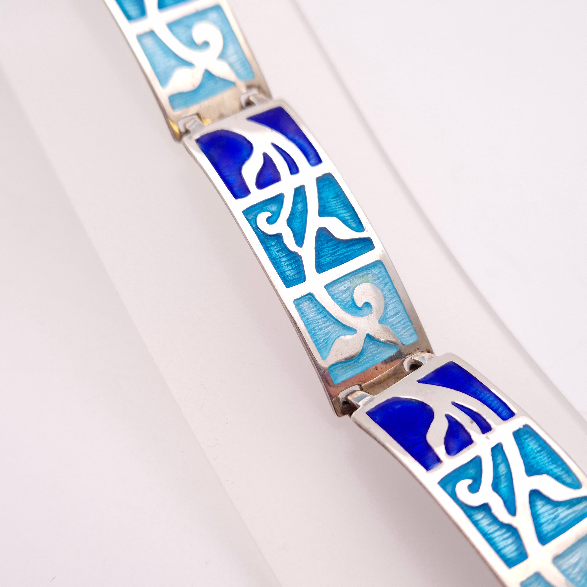This unique bracelet is composed of a series of rectangular sterling silver panels, each adorned with intricate scrollwork or abstract patterns. The true allure lies in the vibrant enamel work, showcasing various shades of blue – from deep, rich cobalt to serene sky blue – creating a dynamic and artistic contrast. The interplay of the bright silver and the glossy enamel gives this piece a contemporary yet timeless appeal, reminiscent of classic Mid-Century Modern or Nordic design.
