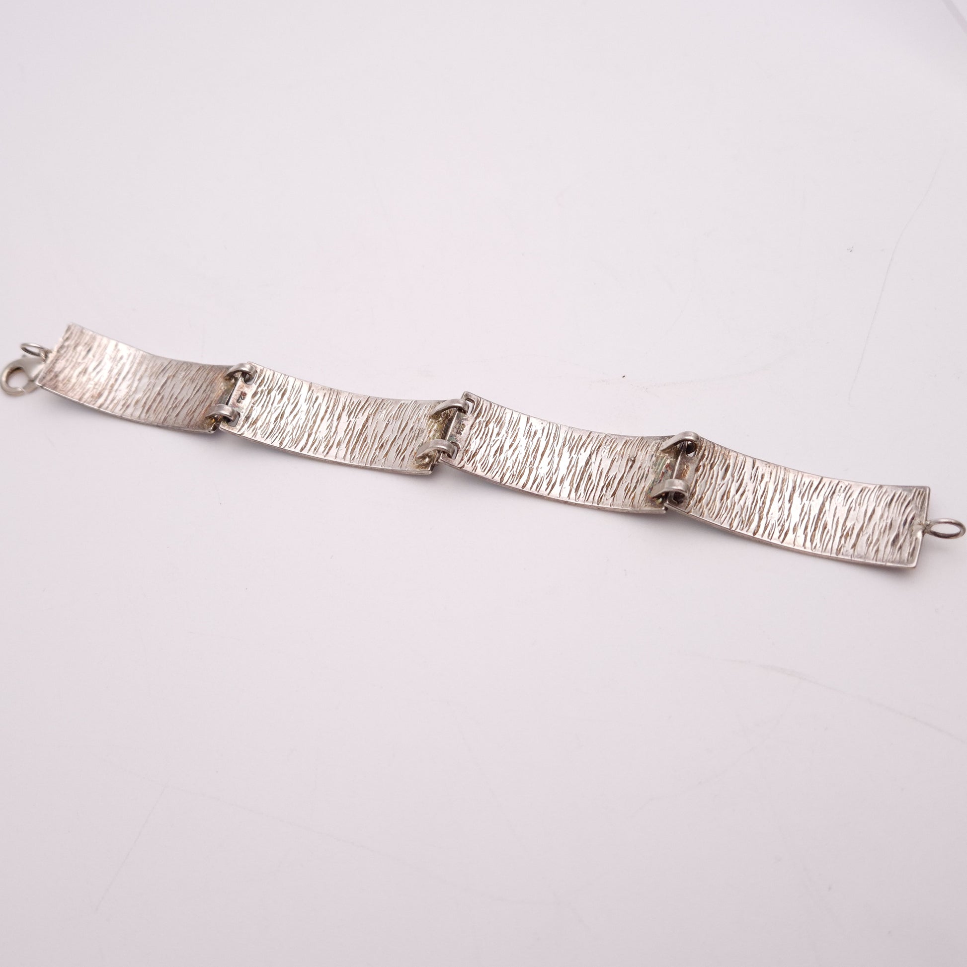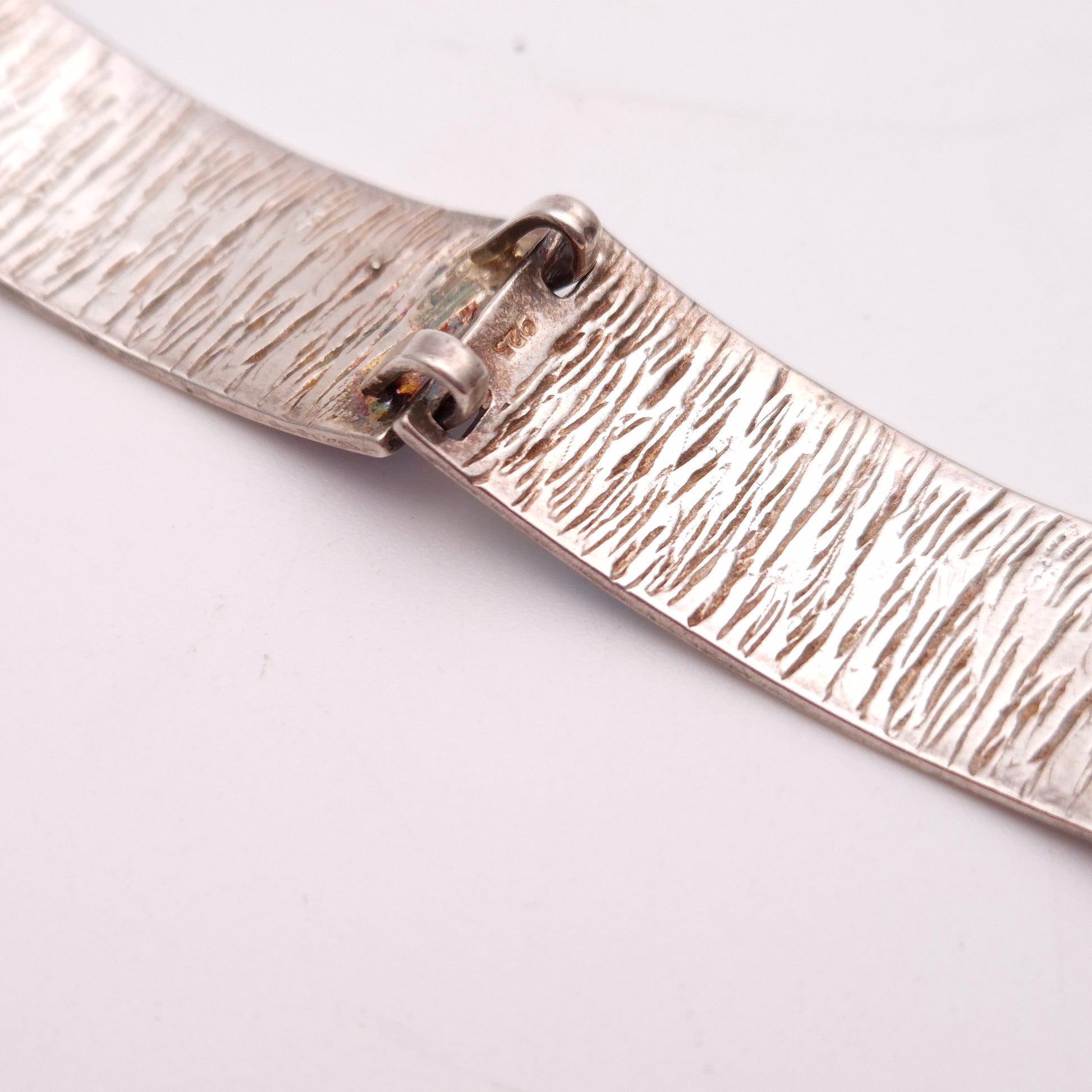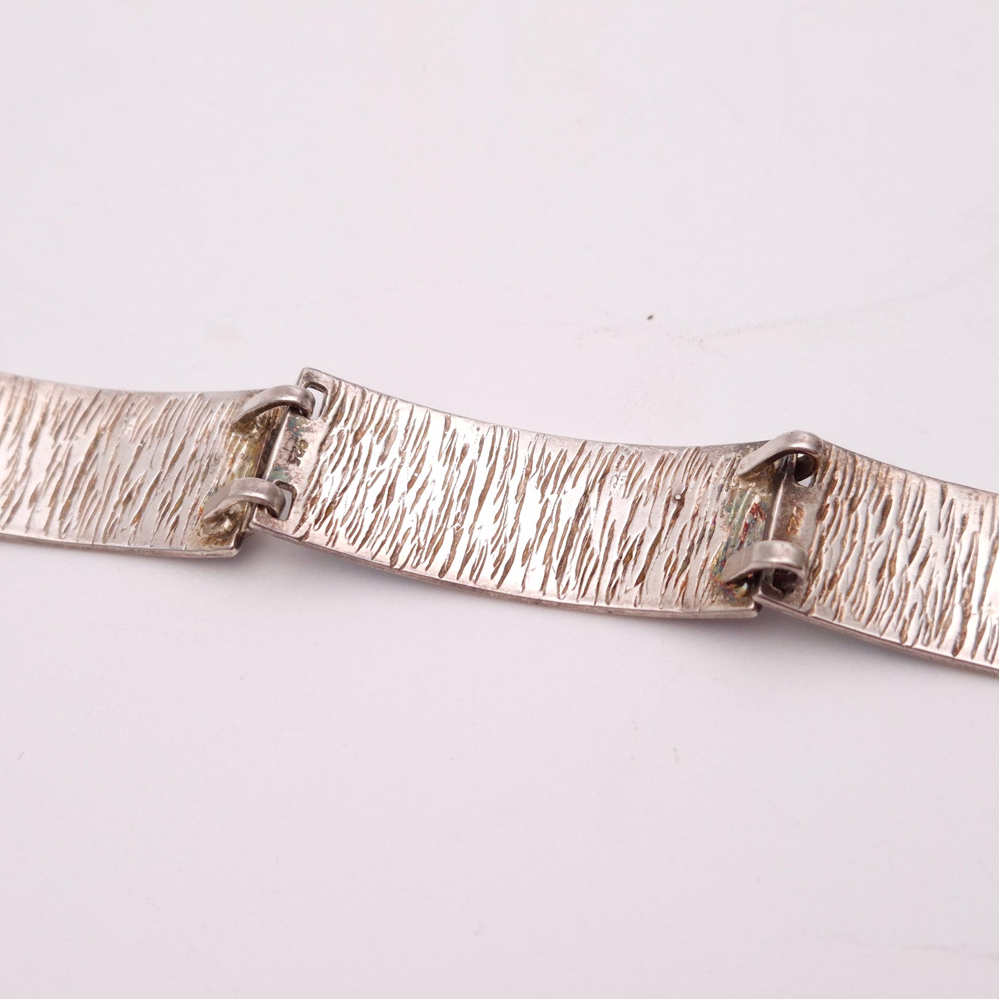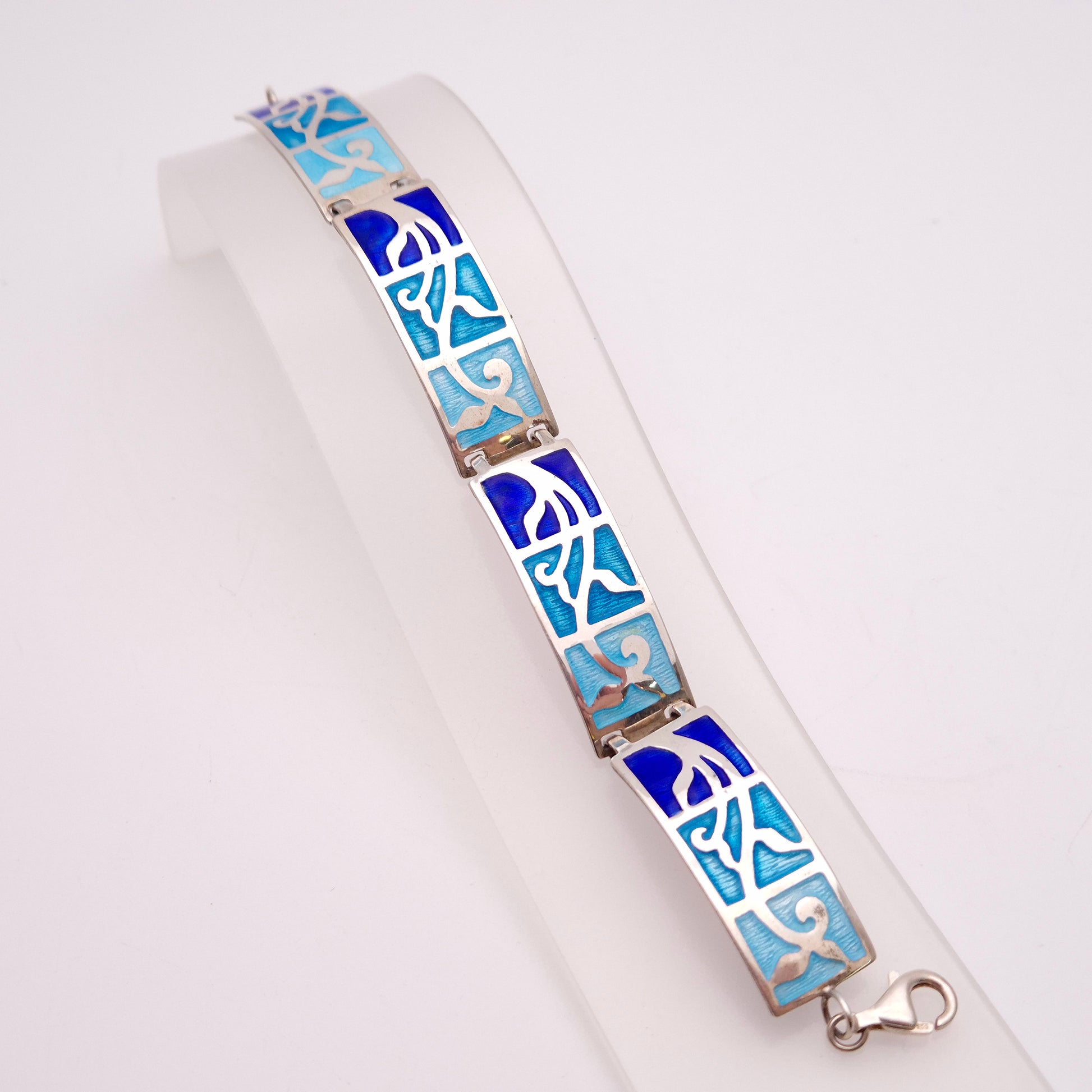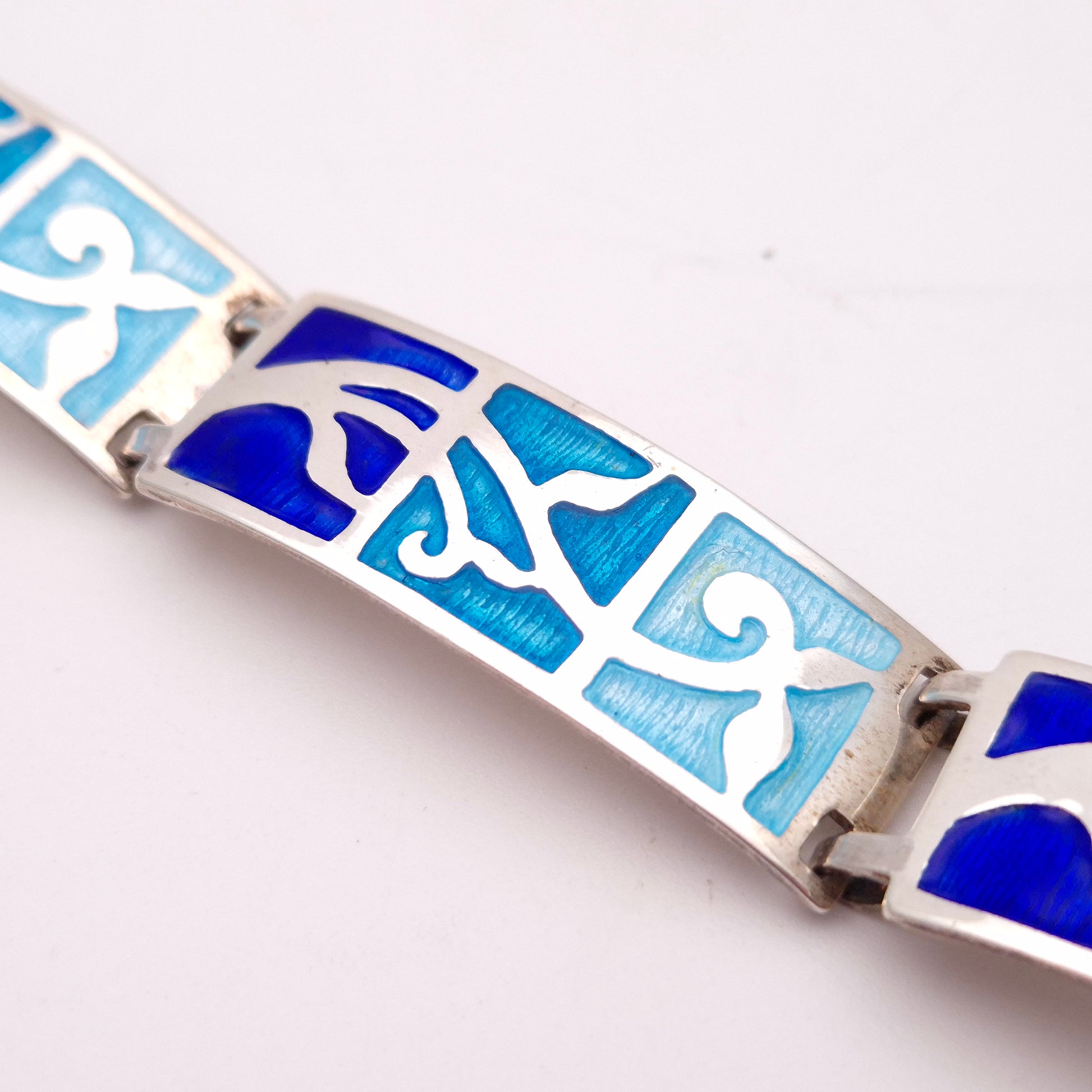 This unique bracelet is composed of a series of rectangular sterling silver panels, each adorned with intricate scrollwork or abstract patterns. The true allure lies in the vibrant enamel work, showcasing various shades of blue – from deep, rich cobalt to serene sky blue – creating a dynamic and artistic contrast. The interplay of the bright silver and the glossy enamel gives this piece a contemporary yet timeless appeal, reminiscent of classic Mid-Century Modern or Nordic design.